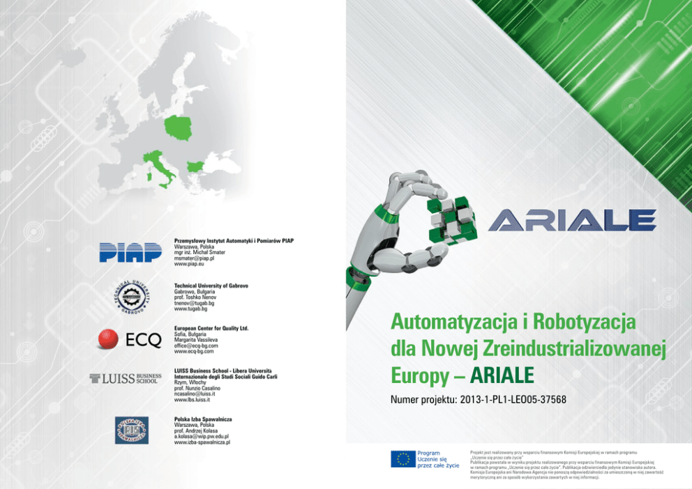 Przemysłowy Instytut Automatyki i Pomiarów PIAP Warszawa, Polska mgr inż. Michał Smater [email protected] www.piap.eu Technical University of Gabrovo Gabrowo, Bułgaria prof. Toshko Nenov [email protected] www.tugab.bg European Center for Quality Ltd. Sofia, Bułgaria Margarita Vassileva [email protected] www.ecq-bg.com LUISS Business School - Libera Università Internazionale degli Studi Sociali Guido Carli Rzym, Włochy prof. Nunzio Casalino [email protected] www.lbs.luiss.it Automatyzacja i Robotyzacja dla Nowej Zreindustrializowanej Europy – ARIALE Numer projektu: 2013-1-PL1-LEO05-37568 Polska Izba Spawalnicza Warszawa, Polska prof. Andrzej Kolasa [email protected] www.izba-spawalnicza.pl Projekt jest realizowany przy wsparciu finansowym Komisji Europejskiej w ramach programu „Uczenie się przez całe życie” Publikacja powstała w wyniku projektu realizowanego przy wsparciu finansowym Komisji Europejskiej w ramach programu „Uczenie się przez całe życie”. Publikacja odzwierciedla jedynie stanowisko autora. Komisja Europejska ani Narodowa Agencja nie ponoszą odpowiedzialności za umieszczoną w niej zawartość merytoryczną ani za sposób wykorzystania zawartych w niej informacji. Tło projektu Jednym z kluczowych priorytetów strategii Europa 2020 jest rozwój gospodarki europejskiej. Aktualny, postindustrialny model gospodarki nie posiada wystarczająco mocnych podstaw aby skutecznie walczyć z kryzysem ekonomicznym. Problem ten został dostrzeżony przez Komisję Europejską która w październiku 2012 ogłosiła komunikat skierowany m.in. do Parlamentu Europejskiego zatytułowany „Silniejszy europejski przemysł na rzecz wzrostu i ożywienia gospodarczego”. Zgodnie z odnowioną strategią przemysłową przedstawioną w komunikacie Komisja oczekuje odwrócenia spadkowego udziału przemysłu w europejskim PKB z obecnego poziomu 16% do nawet 20% w roku 2020. Reindustrializacja Europy jest niezbędna do osiągnięcia pożądanej, zdrowej równowagi pomiędzy przemysłem a usługami. Cel projektu Projekt ARIALE ma wspomóc produkcyjne MŚP w zwiększeniu konkurencyjności na rynku poprzez dostarczenie efektywnego kosztowo, kompleksowego systemu szkoleń przygotowanego specjalnie na potrzeby tychże MŚP, obejmującego szeroki zakres wiedzy w dziedzinie Automatyki i Robotyki z elementami zautomatyzowanego/zrobotyzowanego spawania. Celem projektu jest transfer materiałów opracowanych w ramach wcześniejszego projektu realizowanego w ramach programu LdV TOI o akronimie AutoMatic wraz z ich aktualizacją oraz dostosowaniem do warunków socjo-kulturalnych w nowych krajach partnerów projektu ARIALE. Plan działania Projekt realizowany będzie zgodnie ze schematem: Krok 1 Identyfikacja i formułowanie. Wyniki projektu AutoMatic będą udostępnione przez partnerów projektu oraz przeanalizowane. Przeprowadzone będą analizy potrzeb i wymagań potencjalnych użytkowników. Zakres zmian zawartość oraz zakres tematyczny kursów będą opracowane zgodnie z wynikami analiz. Krok 2 Implementacja systemu szkoleniowego. Treści szkoleniowe zostaną dostosowane zgodnie z opracowanym zakresem zmian oraz zaimplementowane w środowisku e-Learningowym. Przeprowadzone będą analizy materiałów pod względem technicznym i pedagogicznym. Opracowany będzie kompletny program dalszej adaptacji i implementacji. Zachowana będzie równowaga pomiędzy wiedzą teoretyczną a praktyczną. Krok 3 Ocena i audyt. Uruchomiony system zostanie przetestowany przez przedstawicieli trzech docelowych grup użytkowników. Uczestnicy testów zostaną wybrani spośród przedstawicieli różnych branż. Krok 4 Ulepszanie systemu szkoleniowego. Przy wykorzystaniu podejścia iteracyjnego informacje zwrotne będą wykorzystane do ulepszania systemu szkoleniowego. Rezultaty badań będą przeanalizowane w celu identyfikacji słabych punktów modułów szkoleniowych oraz do przeprowadzenia w razie potrzeby działań korekcyjnych. Oczekiwane wyniki Materiały szkoleniowe systemu ARIALE będą zaimplementowane w środowisku e-Learningowym. System szkoleniowy ARIALE będzie opracowany zgodnie z wytycznymi ECVET w celu zapewnienia transparentności i rozpoznawania efektów nauczania i kwalifikacji. Partnerzy będą wykorzystywać Europejskie ramy odniesienia na rzecz zapewnienia jakości jako metodykę projektu która obejmuje cykl zapewnienia jakości i jej poprawy (planowanie, implementacja, ocena, przegląd/weryfikacja) na podstawie wybranych kryteriów jakości oraz wskaźników odnoszących się do zarządzania jakością. W początkowym okresie realizacji projektu przeprowadzone będzie badanie potrzeb potencjalnych użytkowników systemu we wszystkich krajach partnerów projektu na podstawie którego powstanie „Publiczny raport o potrzebach produkcyjnych MŚP w zakresie szkoleń automatyki i robotyki”. Dokument ten zostanie opublikowany na stronie internetowej projektu pod adresem www.ariale.eu. Na podstawie analizy informacji zwrotnej z badania powstanie szczegółowa specyfikacja zawartości kursów oraz funkcjonalności systemu e-Learningowego. Opracowany system szkoleniowy ARIALE składał się będzie z rozwiązania e-Learningowego, metodyki nauczania, materiałów szkoleniowych oraz instrukcji dotyczących przygotowywania i prowadzenia kursu. Robocza wersja wszystkich produktów dostępna będzie w sierpniu 2014, natomiast wersja końcowa we wrześniu 2015. Oczekiwanym oddziaływaniem projektu ma być podniesienie wiedzy przedstawicieli grup docelowych w zakresie automatyki i robotyki przy wykorzystaniu nowoczesnych technik informacyjnych. Grupy docelowe: ● Zarząd MŚP ● Pracownicy MŚP ● Trenerzy ● Konsultanci Automatyzacja i Robotyzacja dla Nowej Zreindustrializowanej Europy