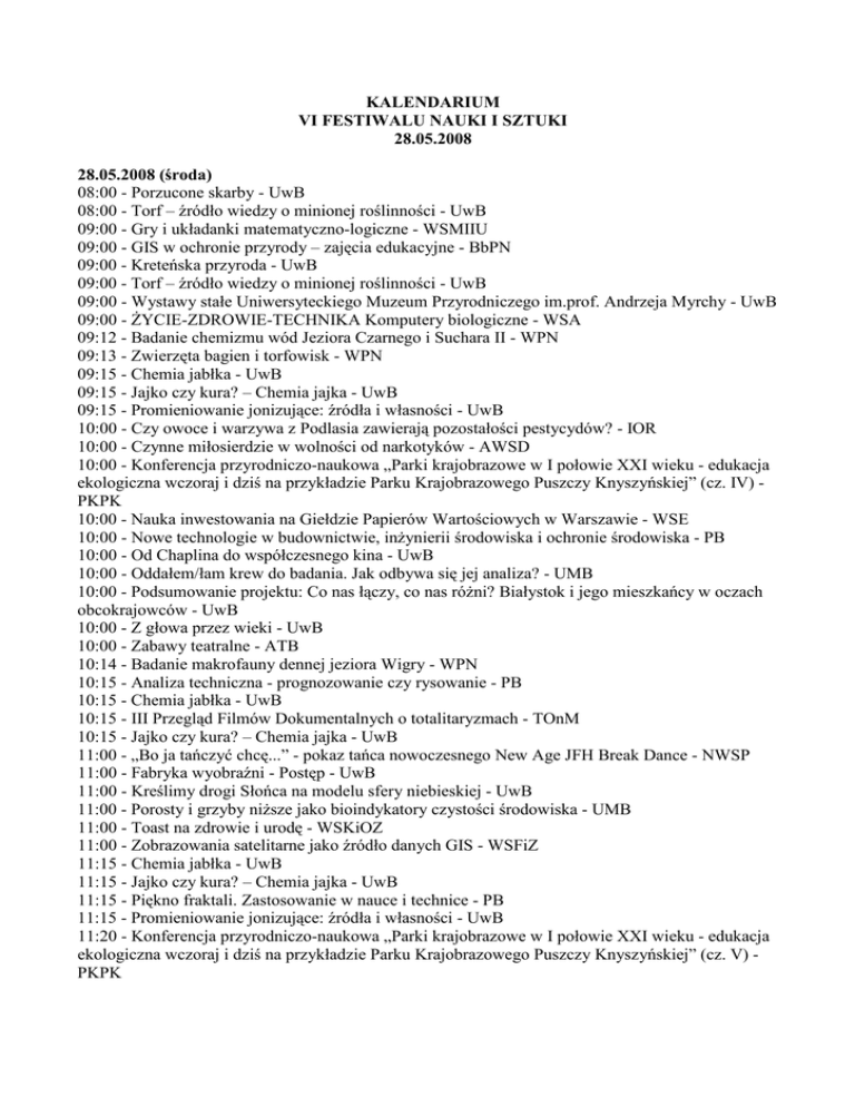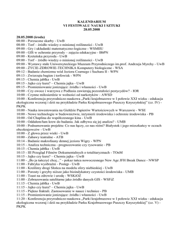 KALENDARIUM VI FESTIWALU NAUKI I SZTUKI 28.05.2008 28.05.2008 (środa) 08:00 - Porzucone skarby - UwB 08:00 - Torf – źródło wiedzy o minionej roślinności - UwB 09:00 - Gry i układanki matematyczno-logiczne - WSMIIU 09:00 - GIS w ochronie przyrody – zajęcia edukacyjne - BbPN 09:00 - Kreteńska przyroda - UwB 09:00 - Torf – źródło wiedzy o minionej roślinności - UwB 09:00 - Wystawy stałe Uniwersyteckiego Muzeum Przyrodniczego im.prof. Andrzeja Myrchy - UwB 09:00 - śYCIE-ZDROWIE-TECHNIKA Komputery biologiczne - WSA 09:12 - Badanie chemizmu wód Jeziora Czarnego i Suchara II - WPN 09:13 - Zwierzęta bagien i torfowisk - WPN 09:15 - Chemia jabłka - UwB 09:15 - Jajko czy kura? – Chemia jajka - UwB 09:15 - Promieniowanie jonizujące: źródła i własności - UwB 10:00 - Czy owoce i warzywa z Podlasia zawierają pozostałości pestycydów? - IOR 10:00 - Czynne miłosierdzie w wolności od narkotyków - AWSD 10:00 - Konferencja przyrodniczo-naukowa „Parki krajobrazowe w I połowie XXI wieku - edukacja ekologiczna wczoraj i dziś na przykładzie Parku Krajobrazowego Puszczy Knyszyńskiej” (cz. IV) PKPK 10:00 - Nauka inwestowania na Giełdzie Papierów Wartościowych w Warszawie - WSE 10:00 - Nowe technologie w budownictwie, inŜynierii środowiska i ochronie środowiska - PB 10:00 - Od Chaplina do współczesnego kina - UwB 10:00 - Oddałem/łam krew do badania. Jak odbywa się jej analiza? - UMB 10:00 - Podsumowanie projektu: Co nas łączy, co nas róŜni? Białystok i jego mieszkańcy w oczach obcokrajowców - UwB 10:00 - Z głowa przez wieki - UwB 10:00 - Zabawy teatralne - ATB 10:14 - Badanie makrofauny dennej jeziora Wigry - WPN 10:15 - Analiza techniczna - prognozowanie czy rysowanie - PB 10:15 - Chemia jabłka - UwB 10:15 - III Przegląd Filmów Dokumentalnych o totalitaryzmach - TOnM 10:15 - Jajko czy kura? – Chemia jajka - UwB 11:00 - „Bo ja tańczyć chcę...” - pokaz tańca nowoczesnego New Age JFH Break Dance - NWSP 11:00 - Fabryka wyobraźni - Postęp - UwB 11:00 - Kreślimy drogi Słońca na modelu sfery niebieskiej - UwB 11:00 - Porosty i grzyby niŜsze jako bioindykatory czystości środowiska - UMB 11:00 - Toast na zdrowie i urodę - WSKiOZ 11:00 - Zobrazowania satelitarne jako źródło danych GIS - WSFiZ 11:15 - Chemia jabłka - UwB 11:15 - Jajko czy kura? – Chemia jajka - UwB 11:15 - Piękno fraktali. Zastosowanie w nauce i technice - PB 11:15 - Promieniowanie jonizujące: źródła i własności - UwB 11:20 - Konferencja przyrodniczo-naukowa „Parki krajobrazowe w I połowie XXI wieku - edukacja ekologiczna wczoraj i dziś na przykładzie Parku Krajobrazowego Puszczy Knyszyńskiej” (cz. V) PKPK 12:00 - Badania ewaluacyjne w praktyce na przykładzie projektu „Kraina śubra - Ochrona śubra w Puszczy Białowieskiej” Fundacji Zielone Płuca Polski - UwB 12:00 - Czynniki ryzyka chorób układu krąŜenia - dlaczego zapadamy na choroby serca i naczyń? PWSIP 12:00 - Jeśli nie witaminy to co? - WSKiOZ 12:00 - Multimedialne techniki kształcenia w e-nauczaniu na odległość - PB 12:00 - Oddałem/łam krew do badania. Jak odbywa sie jej analiza? - UMB 12:00 - Zarządzanie firmą – symulacyjna gra decyzyjna - WSFiZ 12:14 - Widzę i rozpoznaję - co rośnie na torfowisku - WPN 12:15 - Chemia jabłka - UwB 12:15 - Jajko czy kura? – Chemia jajka - UwB 12:30 - Przez zabawę do wiedzy - WSE 13:00 - BIZNE$ZTUKA „Kulturalna przedsiębiorczość” - UwB 13:00 - Kreślimy drogi Słońca na modelu sfery niebieskiej - UwB 13:00 - Produkty mleczne w kosmetyce - WSKiOZ 13:00 - Systemy transakcyjne elektronicznego handlu towarowego - PB 13:00 - Włodzimierz Wysocki – opisanie artysty - UwB 13:00 - Z kryminalistyka na Ty - NWSP 13:00 - Zwalczanie nałogu tytoniowego i okresowe wykonywanie badania spirometrycznego w celu zapobiegania przewlekłej obturacyjnej chorobie płuc - PWSIP 13:15 - Chemia jabłka - UwB 13:15 - Fraktalne właściwości polskiego rynku kapitałowego - WSFiZ 13:15 - Jajko czy kura? – Chemia jajka - UwB 13:15 - Kim jesteśmy, co dziedziczymy, co kultywujemy i kim stajemy się w zintegrowanej Europie? rozwaŜania nad toŜsamością - UwB 13:15 - Klastry gospodarcze jako czynnik rozwoju regionu - PWSIP 13:15 - Promieniowanie jonizujące: źródła i własności - UwB 13:15 - Słucham i rozpoznaje - kto tak śpiewa w lesie - WPN 13:15 - Społeczna odpowiedzialność biznesu - moda czy konieczność - WSFiZ 14:00 - Problemy osób z zaburzeniami psychicznymi - PWSIP 14:15 - Chemia jabłka - UwB 14:15 - Jajko czy kura? – Chemia jajka - UwB 14:15 - Obrazy malowane światłem. Czy potrafisz rozróŜnić grafikę komputerową od zdjęcia? - PB 15:00 - Partycypacja polityczna polskich elit prowincjonalnych w początkach XX wieku - WSFiZ 15:00 - Rola czynników psychicznych w chorobach dermatologicznych - WSKiOZ 15:00 - Sztuka wystąpień, czyli jak się zachować i opanować nerwy przed waŜnym wystąpieniem UwB 15:00 - Zarządzanie czasem - UwB 15:05 - Analiza techniczna - prognozowanie czy rysowanie - PB 15:30 - Mieszkańcy województwa podlaskiego czy Podlasianie? Autoidentyfikacja regionalna, percepcja regionu zamieszkania oraz społeczny obraz grup uprzywilejowanych - WSFiZ 16:00 - Begegnung mit dem Fürstentum Liechtenstein (Spotkanie z Ksiestwem Liechtenstein) - PB 16:00 - Biochemia skóry i jej wytworów - WSKiOZ 16:00 - Jaka role pełni śpiew liturgiczny w cerkwi? - AS 16:00 - Kult Miłosierdzia BoŜego - AWSD 16:00 - PodłoŜe oraz istota relacji Polski z Europa Wschodnia - WSFiZ 16:15 - Od klapsa do przemocy. Alternatywne formy rozwiązywania konfliktów - UwB 16:30 - Etyka pedagogiczna „Serca w głowie – myślenia sercem” (cz. I) - UwB 17:00 - Słonce - przyjaciel czy wróg? - WSKiOZ 17:00 - Wytańczone ja – odkrywanie siebie w ekspresji twórczej - UwB 18:00 - Maski - UwB 18:30 - Etyka pedagogiczna „Serca w głowie – myślenia sercem” (cz. II) - UwB 18:30 - Pokaz judo - PB 19:00 - Klatki - ATB 19:30 - Kon
