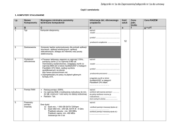 Załącznik nr 1a do Zaproszenia/załącznik nr 1a do umowy Część I zamówienia 1. KOMPUTERY STACJONARNE Lp. Nazwa Komponentu Wymagane minimalne parametry techniczne komputerów Informacje dot. oferowanego urządzenia Ilość sztuk Cena jedn. brutto Cena RAZEM a B C d e f g = e*f 1. Typ Komputer stacjonarny. wpisać: model: ……………………………………………… symbol: ……………………………………………… producent urządzenia: ……………………… 2. Zastosowania Komputer będzie wykorzystywany dla potrzeb aplikacji biurowych, aplikacji edukacyjnych, aplikacji obliczeniowych, dostępu do Internetu oraz poczty elektronicznej. 3. Wydajność obliczeniowa Procesor taktowany zegarem co najmniej 3 GHz., pamięcią cache L3 co najmniej 6 MB lub równoważny wydajnościowo, osiągający wynik co najmniej 6600 pkt w teście SysMark2007 w kategorii PassMark CPU Mark, według wyników opublikowanych na stronie http://www.cpubenchmark.net. Zaprojektowany do pracy na płytach głównych formatu ATX. wpisać: wpisać: wielkość oferowanej pamięci: …………… do jakiej wielkości można ją rozbudować…………………………………. ilość wolnych slotów………………………. 4. Pamięć RAM 5. Parametry pamięci masowej Rodzaj pamięci: DDR3, Co najmniej 8GB z możliwością rozbudowy do min, 32 GB, minimum 1 slot wolny na dalszą rozbudowę Radiator: Tak. model: ……………………………………………… symbol: ……………………………………………… producenta procesora: ……………………… osiągnięty wynik w teście SysMark2007 w kategorii PassMark CPU Mark: …………………………. wpisać: Dwa dyski: a) Dysk min.: 1 000 GB SATA 7200rpm b) Dysk SSD min.: 240 GB, SATA III - 6 Gb/s Prędkość odczytu: min. 520 MB/s Prędkość zapisu: min. 460 MB/s Gwarancja min 5 lat wielkość pamięci masowej dysku a) : ……………………………………… wielkość pamięci masowej dysku b) : ……………………………………… 12 Załącznik nr 1a do Zaproszenia/załącznik nr 1a do umowy 6. Karta graficzna zintegrowana 7. Zasilacz Zasilacz o mocy min. 600W pracujący w sieci 230V 50/60Hz prądu zmiennego i efektywności min. 85% przy obciążeniu zasilacza na poziomie 50% oraz o efektywności min. 80% przy obciążeniu zasilacza na poziomie 100% wpisać: model: ……………………………………………… symbol: ……………………………………………… producenta zasilacza : ……………………… 8. Obudowa Typ obudowy Midi Tower, format: ATX, kolor: czarny, Złącza na przednim panelu min.: 1 x mikrofon, 1 x słuchawki, 1 x USB 3.0, certyfikat CE wpisać: model: ……………………………………………… symbol: ……………………………………………… producenta obudowy: ……………………… 9. Wyposażenie multimedialne Karta dźwiękowa zgodna z High Definition. Porty słuchawek i mikrofonu na przednim oraz na tylnym panelu obudowy. wpisać: model: ……………………………………………… symbol: ……………………………………………… producenta karty dźwiękowej: ……………………… 10. Płyta główna Płyta główna –pełen ATX, wyposażona w min. : wpisać: Liczba gniazd DDR3 :4 Liczba portów USB 3.0: 4 Port / Złącze COM: Tak Port / Złącze LPT: Tak Złącza zewnętrzne: 1 x PS/2 Klawiatura/Mysz Combo Złącza zewnętrzne: 1 x DVI-D Złącza zewnętrzne: 1 x HDMI Złącza zewnętrzne: 1 x Głośnik boczny Złącza zewnętrzne: 1 x Głośnik centralny / Subwoofer Złącza zewnętrzne: 1 x Głośnik tylny Złącza zewnętrzne: 1 x Line In Złącza zewnętrzne: 1 x Line Out Złącza zewnętrzne: 1 x MIC Złącza zewnętrzne: 1 x RJ-45 Złącza zewnętrzne: 6 x USB 2.0 Złącza zewnętrzne: 2 x USB 3.0 Złącza dostępne na płycie: 2 x SATA II 3Gb/s model: ……………………………………………… symbol: ……………………………………………… producenta płyty głównej: ……………… …………………………………………………………. Czy płyta posiada określone porty, złącza i system diagnostyczny : TAK/NIE* Załącznik nr 1a do Zaproszenia/załącznik nr 1a do umowy 11. Zgodność z systemami operacyjnymi i standardami 12. Głośność jednostki Głośność jednostki centralnej mierzona zgodnie z normą ISO 7779 oraz wykazana zgodnie z normą ISO 9296 w pozycji operatora w trybie pracy dysku twardego (WORK) wynosząca maksymalnie 28 dB TAK/NIE* ……………………………………………………… /podać głośność jednostki/ Określono we wzorze umowy 13. Warunki gwarancji 14. Wsparcie techniczne producenta 15. Złącza dostępne na płycie: 4 x SATA III 6Gb/s Złącza dostępne na płycie: 2 x USB 2.0/1.1 Złącza dostępne na płycie: 1 x USB 3.0 W celu szybkiej weryfikacji usterki w obudowę komputera musi być wbudowany wizualny lub dźwiękowy system diagnostyczny, służący do sygnalizowania i diagnozowania problemów z komputerem i jego komponentami; a w szczególności musi sygnalizować: - awarię BIOS-u, - awarię procesora, - uszkodzenie lub brak pamięci RAM, - uszkodzenie złączy PCI i PCIe, - uszkodzenie kontrolera Video, - uszkodzenie płyty głównej, - uszkodzenie kontrolera USB (Zamawiający dopuszcza zaoferowanie oprogramowania zarządzająco – diagnostycznego dostarczonego przez producenta komputera spełniającego pozostałe wymagania Zamawiającego) Oferowany system diagnostyczny nie może wykorzystywać minimalnej ilości wolnych slotów wymaganych w specyfikacji. Oferowane modele komputerów poprawnie współpracują z systemem operacyjnym Windows Pro 7 oraz Windows 10 Pro. Wymagania dodatkowe W przypadku awarii dysków pozostaje u Zamawiającego. twardych dysk Możliwość telefonicznego sprawdzenia konfiguracji sprzętowej komputera oraz warunków gwarancji po po