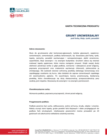 KARTA TECHNICZNA PRODUKTU GRUNT UNIWERSALNY pod farby, kleje, tynki, posadzki Zakres stosowania: Służy do gruntowania płyt kartonowo-gipsowych, tynków gipsowych, wapiennocementowych, cementowych, podłoży betonowych, itp. Stosowany pod farby, tynki, tapety, jastrychy, posadzki wyrównujące i samopoziomujące, płytki ceramiczne, szpachlówki, kleje wewnątrz i na zewnątrz budynków. Gruntem zaleca się również malować tapety papierowe, które można następnie zmywać. Dzięki swojej dużej zdolności penetracji wnika w głąb podłoża, wzmacnia i zabezpiecza przed wilgocią, poprawia przyczepność oraz znakomicie wyrównuje chłonność, jednocześnie ją zmniejszając. Dla wylewek stanowi ochronną powłokę ułatwiając konserwację oraz zapobiegając osadzaniu się kurzu. Jako dodatek do zapraw cementowych zapobiega ich ewentualnemu pękaniu. Po wyschnięciu tworzy przeźroczystą, bezbarwną powłokę, która charakteryzuje się dużą elastycznością, przepuszczalnością pary wodnej, jest niepalna. Stosowany do wewnątrz i na zewnątrz pomieszczeń. Charakterystyczne cechy: Wzmacnia podłoża, poprawia przyczepność, chroni przed wilgocią. Przygotowanie podłoża: Podłoże powinno być suche, odtłuszczone, wolne od kurzu, brudu, olejów i smarów. Należy usunąć stare tapety, grube powłoki farb klejowych i słabo przylegających do podłoża farb emulsyjnych. Użytkowanie powierzchni można prowadzić po 24 godzinach od zakończenia nakładania ostatniej warstwy. Sposób użycia: Gruntowanie należy prowadzić przy dodatniej temperaturze otoczenia i podłoża powyżej +50C za pomocą pędzla lub wałka. W miejscach narażonych na zwiększone ścieranie wskazane jest nałożenie 2, 3 warstw metodą „mokre na mokre” zachowując odstępy 3-4 godzinne. Najpierw nasycić gruntem miejsca o spodziewanej wysokiej chłonności takie, jak wyrównane wgłębienia, miejsca szczególnie słabe, sypiące się itp. Przygotowane podłoże nasycać równomiernie za pomocą pędzla, wałka lub natrysku. Wyrób przechowywać w szczelnie zamkniętych oryginalnych opakowaniach w temperaturze dodatniej nie przekraczającej 250C. Parametry techniczne: Konsystencja ciecz Kolor biały Zapach charakterystyczny Gęstość 1,01 - 1,10 g/cm3 Wartość PH 8 Rozcieńczalnik woda Czyszczenie narzędzi wodą Wydajność 5 - 20 m2 /litr (w zależności od podłoża) Czas schnięcia 3 - 24h Temperatura składowania 5ºC - 30ºC Temperatura stosowania 5ºC - 30ºC Wskazówki BHP i przeciwpożarowe: Wyrób niepalny. Nie jest klasyfikowany jako niebezpieczny wg obowiązujących przepisów. Przestrzegać podstawowych zasad BHP. Podczas wykonywania prac należy stosować sprzęt ochrony osobistej. W przypadku dostania się preparatu do oczu, przemyć natychmiast dużą ilością wody. W razie wypadku lub wystąpienia dolegliwości należy zabezpieczyć poszkodowanego przed dalszym narażeniem i niezwłocznie zapewnić mu pomoc medyczną. Preparat chronić przed dziećmi.