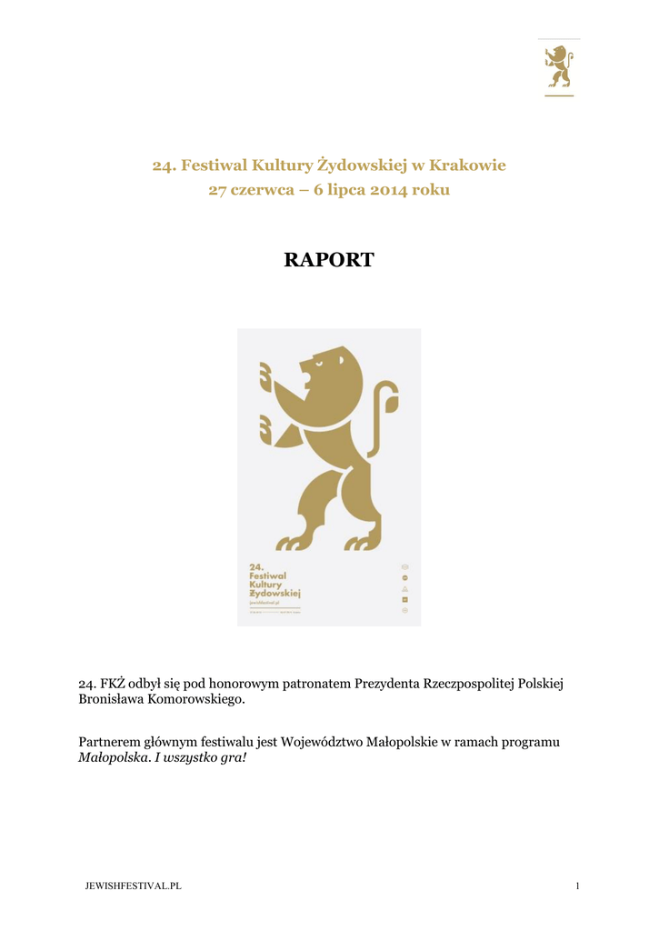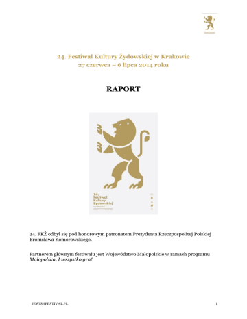24. Festiwal Kultury Żydowskiej w Krakowie 27 czerwca – 6 lipca 2014 roku RAPORT 24. FKŻ odbył się pod honorowym patronatem Prezydenta Rzeczpospolitej Polskiej Bronisława Komorowskiego. Partnerem głównym festiwalu jest Województwo Małopolskie w ramach programu Małopolska. I wszystko gra! JEWISHFESTIVAL.PL 1 PROGRAM 24. FKŻ Podobnie, jak w poprzednim roku, program festiwalu został podzielony na pięć odsłon, w zależności od ich adresatów: dla tych, którzy chcą poznać wielowiekową tradycję w najczystszej postaci dla tych, którzy chcą przekraczać granice: muzyczne, etniczne i religijne dla tych, którzy wolą odkrywać świat przy pomocy zmysłów dla tych, którzy chcą dyskutować, odkrywać i uczyć się kącik dla dzieci, w którym zgrupowaliśmy wydarzenia z pozostałych odsłon – te, które przybliżą świat żydowski dzieciom Program tegorocznej edycji najpełniej opisują cztery słowa, które wykorzystywane były również w promocji 24. FKŻ: Aszkenaz według Księgi Rodzaju to syn Gomera, protoplasta min. Słowian i Germanów; nazwa używana do określenia kultury Żydów wywodzących się z Europy Środkowej i Wschodniej, obejmującej cały jidyszkajt; aszkenazyjczycy stanowią zdecydowanie dominującą grupę pośród Żydów Mizrach po hebrajsku znaczy 'wschód', mizrachijczycy to Żydzi pochodzący z krajów Bliskiego Wschodu, zamieszkałych w większości przez muzułmanów; termin ten obejmuje również Żydów z krajów Maghrebu oraz Żydów sefardyjskich Dybuk duch z pogranicza dwóch światów; nie może zaznać spoczynku i bierze w posiadanie ciało żywej osoby; jeden z najważniejszych toposów literackich i kulturowych związanych z folklorem żydowskim, obecny w Kabale, ale też inspirujący dla współczesnej popkultury Kibuc idea, która pomogła zbudować Państwo Izraela; osady zakładane od 1910 roku na terenach Palestyny, dla których wspólnota była fundamentem relacji międzyludzkich; fenomen społeczno-kulturowy, który wpłynął na wszystkie aspekty życia współczesnego Izraela. JEWISHFESTIVAL.PL 2 24. FKŻ to łącznie 244 wydarzenia: 140 wydarzeń w programie głównym, przygotowanym przez Stowarzyszenie Festiwal Kultury Żydowskiej: 25 wydarzeń muzycznych: koncertów, DJ-parties, w tym również koncert Szalom na Szerokiej 26 wykładów, spotkań, prezentacji 50 warsztatów 5 projekcji filmowych 26 zwiedzań 4 wystawy 4 ceremonie religijne 104 wydarzenia towarzyszące, zorganizowane przez naszych partnerów: JCC Krakow, Żydowskie Muzeum Galicja, Centrum Taubego, Miesięcznik Znak Na 24. FKŻ zaprosiliśmy 119 artystów, instruktorów, wykładowców z Izraela, Stanów Zjednoczonych, Niemiec, Holandii oraz z Polski. 5 krajów: W realizacji 24. FKŻ pomaga nam 52 wolontariuszy z 5 krajów: Polski, Niemiec oraz po raz pierwszy – z Izraela, Węgier i Bułgarii. W 24. FKŻ udział wzięło niemalże 30 tysięcy osób – w tym w samym koncercie Szalom na Szerokiej uczestniczyła według szacunków policji rekordowa ilość ponad 20 tysięcy osób. JEWISHFESTIVAL.PL 3 KONCERTY I INNE WYDARZENIA MUZYCZNE Koncerty w synagodze Tempel: 1. Klasyka w południe: Menachem Bristowski (IL), gościnnie: Tadeusz Jakubowicz, Prezes Gminy Wyznaniowej Żydowskiej w Krakowie (fortepian) 2. Koncert Kantorów: Nowe Pokolenie; Kantor Moshe Fishel (IL) Kantor Elazar Vinograd (IL), Kantor Abraham Kirshenbaum (IL), Chór „The Bells Vocal Ensemble” (IL) pod dyrekcją Maestro Yossi Schwartza, akompaniament: Menachem Bristowski (IL),producent koncertu: Yosi Notkowitz (IL) 3. Erik Friedlander (USA): Song of the Scribes 4. Daniel Zamir Quartet (IL): Saxophonist on the Roof 5. Shura Lipovsky & Novaya Shira Ensemble (NL): Shura Lipovsky (śpiew), Bert Vos (skrzypce), Paul Prenen (fortepiano), Peter van Os (akordeon), Maaike Roelofs (wiolonczela), Marjolijn van Roon (flet prosty) 6. Frank London & Deep Singh (USA): Sharabi: Deep Singh (instrument perkusyjne), Frank London (trąbka), Manu Narayan (wokal), Sarah Gordon (wokal), Norbert Goldberg (perkusja), Booker King (gitara basowa), Jeremiah Lockwood (gitara), Sanne Möricke (akordeon), Michael Winograd (klarnet) 7. A-WA (IL): Tair Haim (wokal), Tagel Haim (wokal), Liron Haim (wokal), Amir Bresler (perkusja), Hod Moshonov (instrument klawiszowe), Yogev Glusman (bas) 8. Tarras Band (USA): Peter Sokolow (fortepian), Michael Winograd (klarnet), Dave Licht (perkusja), Jim Guttman (kontrabas), Ben Holmes (trąbka) 9. Shai Tsabari & The Middle East Groove All-Stars (IL): Shai Tsabari (wokal), Assaf Talmudi (aranżacje, instrument klawiszowe), Itamar Ziegler(gitara, gitara basowa), Gershon Weiserfirer (elektryczne oud, puzon), Amir Bressler (perkusja), Adir Dadia (efekty dźwiękowe) 10. Neta Elkayam (IL): Howa Jani: Neta Elkayam (wokal), Amit Hai Cohen (fortepian), Elad Levi (skrzypce), Netanel Ben Shitrit (darbuka), Moshe Bakhar (oud), Gal Maestro (kontrabas), Meir Amar (instrument perkusyjne) 11. Leopold Kozłowski i Przyjaciele (PL) JEWISHFESTIVAL.PL 4 Seria imprez didżejskich Teder Weekender: Kraków Meets Tel Aviv @ FKŻ: 12. Future Sounds: From Beats&Bass to Electronica&House: PL: Teielte + Geek Clique; IL: Amir Egozy + Red Axes + Avigad Baggio 13. Vintage Sounds: From Polish Delights to Middle Eastern Madness: PL: Soul Service + Druh Sławek; IL: Fortuna Records Crew (Zack + Hectik) 14. Teder Picnic - Freestyle Vibes Under the Sun: PL: MLDVA + Senor Soul; IL: Hectik + Cohenbeats + Teder Crew (Walter + Zack + Dror + Markey Funk + Rejoycer) 15. Teder Before Party @ Cheder: Cohenbeats (IL) 16. Szalom na Szerokiej – 7-godzinna prezentacja muzyki żydowskiej z całego świata z udziałem: kolektywu didżejskiego Easy Cheesy (PL), Strauss / Warschauer Duo (USA) & Friends, A-WA (IL), Shai Tsabari Middle East Groove All-Stars Orchestra (IL), Sharabi feat. Frank London i Deep Singh (USA), Tarras Ensemble (USA), Neta Elkayam (IL) oraz Festival All-Stars 17. Muzyczny rejs po Wiśle: Liron Amram & The Pant