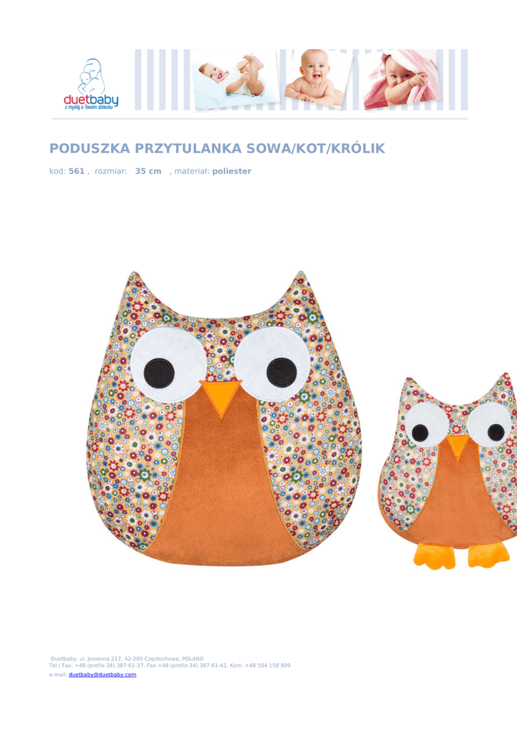 PODUSZKA PRZYTULANKA SOWA/KOT/KRÓLIK kod: 561 , rozmiar: 35 cm , materiał: poliester Duetbaby, ul. Jesienna 217, 42-200 Częstochowa, POLAND Tel / Fax. +48 (prefix-34) 387-61-37, Fax +48 (prefix-34) 387-61-42, Kom. +48 504 158 809 e-mail: [email protected] Powered by TCPDF (www.tcpdf.org)