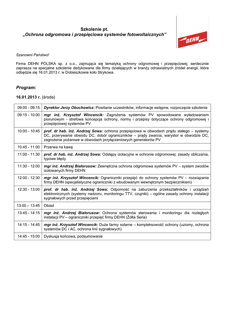 Szkolenie pt. „Ochrona odgromowa i przepięciowa systemów fotowoltaicznych” Szanowni Państwo! Firma DEHN POLSKA sp. z o.o., zajmująca się tematyką ochrony odgromowej i przepięciowej, serdecznie zaprasza na specjalne szkolenie dedykowane dla firmy działających w branży odnawialnych źródeł energii, które odbędzie się 16.01.2013 r. w Dobieszkowie koło Strykowa. Program: 16.01.2013 r. (środa) 09:00 - 09:15 Dyrektor Jerzy Obuchowicz: Powitanie uczestników, informacje wstępne, rozpoczęcie szkolenia 09:15 - 10:00 mgr inż. Krzysztof Wincencik: Zagrożenia systemów PV spowodowane wyładowaniem piorunowym - strefowa koncepcja ochrony, normy i przepisy dotyczące ochrony odgromowej i przepięciowej systemów PV 10:00 - 10:45 prof. dr hab. inż. Andrzej Sowa: ochrona przepięciowa w obwodach prądu stałego – systemy DC, przerywanie obwodu DC, dobór ograniczników – prądy zwarcia, warystor w obwodzie DC, zagrożenie pożarowe w obwodach przyłączeniowych generatorów PV 10:45 - 11:00 Przerwa na kawę 11:00 - 11:30 prof. dr hab. inż. Andrzej Sowa: Odstępy izolacyjne w ochronie odgromowej: zasady obliczania, typowe błędy 11:30 - 12:00 mgr inż. Andrzej Białorusow: Zewnętrzna ochrona odgromowa systemów PV – system zwodów izolowanych firmy DEHN 12:00 - 12:30 mgr inż. Krzysztof Wincencik: Ograniczniki przepięć do ochrony systemów PV – rozwiązania firmy DEHN (specjalistyczne ograniczniki z wbudowanym wewnętrznym bezpiecznikiem) 12:30 - 13:00 prof. dr hab. inż. Andrzej Sowa: Odporność na zaburzenia przekształtników i urządzeń elektronicznych (systemy nadzoru, monitoringu TTV, czujniki) – ogólne zasady ochrony instalacji sygnałowych przed przepięciami 13:00 – 13:45 Obiad 13:45 - 14:15 mgr inż. Andrzej Białorusow: Ochrona systemów sterowania i monitoringu dla rozległych instalacji PV – ograniczniki przepięć firmy DEHN (Żółta Seria) 14:15 - 14:45 mgr inż. Krzysztof Wincencik: Duże farmy solarne – kompleksowość ochrony (uziomy, ochrona systemów DC i AC, ochrona linii sygnałowych) 14:45 - 15:00 Dyskusja końcowa, podsumowanie Informacje organizacyjne: Zgłoszenia: Zgłoszenie udziału w szkoleniu musi zawierać następujące dane: imię i nazwisko uczestnika, nazwa firmy, adres firmy, NIP firmy, zgoda na przetwarzanie danych osobowych przez firmę DEHN POLSKA sp. z o.o.. Zgłoszenia można nadsyłać faksem pod numerem (22) 335-24-66 do 69 lub pocztą elektroniczną na adres [email protected] w nieprzekraczalnym terminie do 20.12.2012 r. włącznie. Liczba miejsc ograniczona – obowiązuje kolejność zgłoszeń. Odpłatność za uczestnictwo: Opłatę za udział w szkoleniu w wysokości 150 zł netto (184,50 zł brutto) należy uiścić przelewem na konto firmy DEHN POLSKA sp. z o.o. – BRE Bank S.A. o/Warszawa 32 1140 1977 0000 5386 5500 1001 tytułem „Szkolenie fotowoltaiczne – imię i nazwisko uczestnika” nie później niż w ciągu 5 dni od otrzymania potwierdzenia rezerwacji miejsca, jednak nie później niż do dnia 31.12.2012 r. (decyduje data wpłynięcia środków na konto firmy DEHN POLSKA). Brak wpłaty w tym terminie będzie skutkował skreśleniem z listy uczestników. DEHN POLSKA zapewnia profesjonalną kadrę wykładowców, materiały szkoleniowe i wyżywienie w hotelu. Adres hotelu: Hotel Dobieszków Ośrodek Szkolenia Zawodowego w Dobieszkowie Dobieszków 70 95-010 Stryków tel. (42) 710-90-90, (42) 719-87-38 fax (42) 710-92-40 www.hoteldobieszkow.com.pl Dojazd: Hotel znajduje się w Dobieszkowie, między Strykowem a Łodzią, na wschód od drogi krajowej nr 14 (przez Michałówek lub Stary Imielnik), ok. 6 km na południe od węzła Stryków na autostradzie A2. http://mapa.targeo.pl/Hotel_Dobieszkow,23,19.5944900,51.8530400 FORMULARZ ZGŁOSZENIA NA SZKOLENIE „OCHRONA ODGROMOWA I PRZEPIĘCIOWA SYSTEMÓW FOTOWOLTAICZNYCH” 16.01.2013 Zgłaszam niżej wymienione osoby: Imię i nazwisko uczestnika: 1. …………………………………………………………………… 2. …………………………………………………………………… 3. …………………………………………………………………… 4. …………………………………………………………………… 5. …………………………………………………………………… Firma: ……………………………………………………………………… Ulica: ……………………………………………………………………… Kod i miejscowość: ……………………………………………………………………… Telefon kontaktowy: ……………………………………………………………………… E-mail: ……………………………………………………………………… NIP: ……………………………………………………………………… Dane do faktury: takie jak powyżej inne: ……………………………………………………………………… ……………………………………………………………………… ……………………………………………………………………… ……………………………………………………………………… ……………………………………………………………………… Wyrażam zgodę na przetwarzanie moich danych osobowych przez firmę DEHN POLSKA sp. z o.o. zgodnie z ustawą z dnia 29.08.1997 r. o ochronie danych osobowych (Dz.U. 1997, nr 133, poz. 883). Jednocześnie wyrażam zgodę na otrzymywanie informacji drogą elektroniczną zgodnie z ustawą z dnia 18 lipca 2002 r. o świadczeniu usług drogą elektroniczną (Dz.U. 2002, nr 144, poz. 1204). ________________ (podpis) Zgłoszenia można nadsyłać faksem pod numerem (22) 335-24-66 do 69 lub pocztą elektroniczną na adres [email protected] w nieprzekraczalnym terminie do 20.12.2012 r. włącznie.