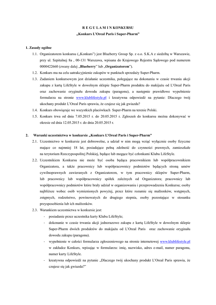 R E G U L A M I N KONKURSU „Konkurs L’Oreal Paris i Super-Pharm” 1. Zasady ogólne 1.1. Organizatorem konkursu („Konkurs”) jest Blueberry Group Sp. z o.o. S.K.A z siedzibą w Warszawie, przy ul. Szpitalnej 8a , 00-131 Warszawa, wpisana do Krajowego Rejestru Sądowego pod numerem 0000422660 (zwany dalej „Blueberry” lub „Organizatorem”). 1.2. Konkurs ma na celu uatrakcyjnienie zakupów w punktach sprzedaży Super-Pharm. 1.3. Zadaniem konkursowym jest działanie uczestnika, polegające na dokonaniu w czasie trwania akcji zakupu z kartą LifeStyle w dowolnym sklepie Super-Pharm produktu do makijażu od L’Oreal Paris oraz zachowanie oryginału dowodu zakupu (paragonu), a następnie prawidłowe wypełnienie formularza na stronie www.klublifestyle.pl i kreatywna odpowiedź na pytanie: Dlaczego twój ukochany produkt L’Oreal Paris sprawia, że czujesz się jak gwiazda? 1.4. Konkurs obowiązuje we wszystkich placówkach Super-Pharm na terenie Polski. 1.5. Konkurs trwa od dnia 7.05.2015 r. do 20.05.2015 r. Zgłoszeń do konkursu można dokonywać w okresie od dnia 12.05.2015 r. do dnia 20.05.2015 r. 2. Warunki uczestnictwa w konkursie „Konkurs L’Oreal Paris i Super-Pharm” 2.1. Uczestnictwo w konkursie jest dobrowolne, a udział w nim mogą wziąć wyłącznie osoby fizyczne mające co najmniej 18 lat, posiadające pełną zdolność do czynności prawnych, zamieszkałe na terytorium Rzeczypospolitej Polskiej, będące lub mogące być członkami Klubu LifeStyle. 2.2. Uczestnikiem Konkursu nie może być osoba będąca pracownikiem lub współpracownikiem Organizatora, a także pracownicy lub współpracownicy podmiotów będących stroną umów cywilnoprawnych zawieranych z Organizatorem, w tym pracownicy sklepów Super-Pharm, lub pracownicy lub współpracownicy spółek zależnych od Organizatora; pracownicy lub współpracownicy podmiotów które brały udział w organizowaniu i przeprowadzeniu Konkursu; osoby najbliższe wobec osób wymienionych powyżej, przez które rozumie się małżonków, wstępnych, zstępnych, rodzeństwo, powinowatych do drugiego stopnia, osoby pozostające w stosunku przysposobienia lub ich małżonków. 2.3. Warunkiem uczestnictwa w konkursie jest: - posiadanie przez uczestnika karty Klubu LifeStyle; - dokonanie w czasie trwania akcji jednorazowo zakupu z kartą LifeStyle w dowolnym sklepie Super-Pharm dwóch produktów do makijażu od L’Oreal Paris oraz zachowanie oryginału dowodu zakupu (paragonu). - wypełnienie w całości formularza zgłoszeniowego na stronie internetowej www.klublifestyle.pl w zakładce Konkurs, wpisując w formularzu: imię, nazwisko, adres e-mail, numer paragonu, numer karty LifeStyle. - kreatywna odpowiedź na pytanie „Dlaczego twój ukochany produkt L’Oreal Paris sprawia, że czujesz się jak gwiazda?” 2.4. Dowód zakupu (paragon) musi mieć datę z przedziału 7.05.2015 - 20.05.2015. Wzór numeru dowodu zakupu (paragonu), który należy wpisać w zgłoszeniu przedstawia Załącznik nr 1 niniejszego Regulaminu. 2.5. Poprzez nazwę sklepu rozumie się nazwę Centrum handlowego, w którym znajduje się sklep Super-Pharm lub adres sklepu (miasto, ulica). 2.6. Jeden numer dowodu zakupu upoważnia do wysłania jednego zgłoszenia do Konkursu. Wysłanie kolejny raz tego samego numeru paragonu będzie traktowane jako zgłoszenie nieprawidłowe. 2.7. Jedna osoba może wielokrotnie wysyłać zgłoszenia do konkursu pod warunkiem spełnienia każdorazowo warunków uczestnictwa określonych w pkt. 2.3 Regulaminu. 2.8. Uczestnik Konkursu oświadcza, że jest autorem nadesłanej przez siebie wypowiedzi i przenosi na Organizatora konkursu wszelkie autorskie prawa majątkowe, w myśl pkt 5 poniżej. 3. Nagrody i sposób ich przyznania 3.1. Zwycięzcami konkursu zostaną autorzy najciekawszych zgłoszeń, wyłonieni przez Komisję konkursową. Pod uwagę będą brane pomysłowość oraz oryginalność zgłoszeń. 3.2. Konkurs trwa od dnia 7.05.2015 do 20.05.2015 do godziny 23:59. 3.3. Osoba zgłaszająca swój udział w Konkursie potwierdza zapoznanie się z Regulaminem i jego warunkami, którego pełna treść dostępna jest w Sklepach i na stronie internetowej www.klublifestyle.pl. 3.4. Nagrodami w konkursie jest 14 voucherów do Showroom o wartości 250 zł każdy wraz z nagrodą pieniężną w wysokości 27,77 zł. Łączna wartość każdej z nagród to 277,77 zł. Kwota 8,44 zł stanowi równowartość zryczałtowanego podatku dochodowego od osób fizycznych o wartości otrzymanej nagrody i zostanie potrącona przed wydaniem nagrody, zgodnie z ustawą z dnia 26 lipca 1991 roku o podatku dochodowym od osób fizycznych (j.t. Dz.U. z 2012r., poz.361). 3.5. Zwycięzców konkursu wyłoni komisja konkursowa, zwana dalej „Komisją Konkursową”. Komisja Konkursowa dokona wyboru, według swojego uznania, spośród wszystkich zgłoszeń 14 najlepszych odpowiedzi, których autorzy otrzymają po 1 nagrodzie. 3.6. Zwycięzcy zostaną poinformowani o wygranej w ciągu 14 dni od daty zakończenia konkursu. 3.7. Poinformowanie zwycięzców o przyznaniu nagrody nastąpi za pomocą e-maila, informacja zostanie wysłana na adres e-mail podany przez uczestnika w zgłoszeniu. 3.8. Zwycięzca w ciągu 7 dni od otrzymania informacji o wygranej powinien przesłać skan lub zdjęcie paragonu, potwierdzający dokonanie zakupu (warunek konieczny) oraz dokładny adres korespondencyjny, na który powinna zostać wysłana nagroda. 3.9. Nagroda zostanie przesłana w ciągu 14 dni od otrzymania adresu korespondencyjnego oraz skanu/zdjęcia paragonu. 3.10. Paragon budzący wątpliwość co do jego oryginalności lub nieczytelny zostaje odrzucony, a Zwycięzca, który nadesłał taki dowód traci prawo do nagrody. Brak oryginału paragonu dyskwalifikuje Zwycięzcę. 3.11. W przypadku, gdy po 7 dniach od wysłania informacji o nagrodzie zwycięzca nie prześle adresu korespondencyjnego i skanu lub zdjęcia paragonu traci prawo do nagrody. 3.12