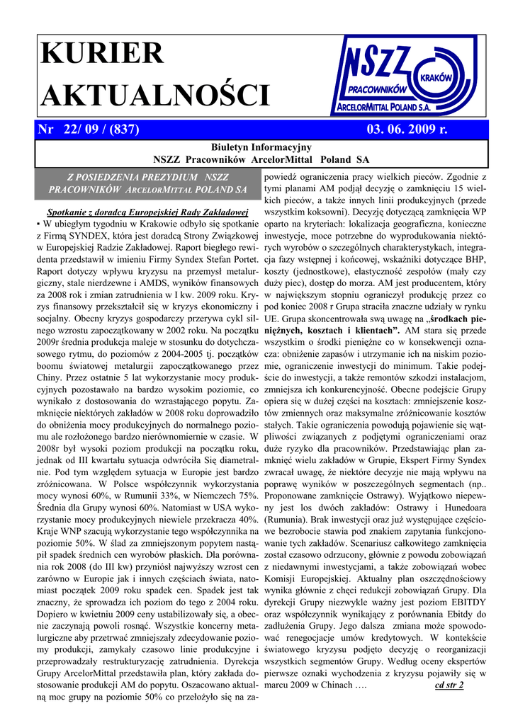 KURIER AKTUALNOŚCI Nr 22/ 09 / (837) 03. 06. 2009 r. Biuletyn Informacyjny NSZZ Pracowników ArcelorMittal Poland SA Z POSIEDZENIA PREZYDIUM NSZZ PRACOWNIKÓW ARCELORMITTAL POLAND SA Spotkanie z doradcą Europejskiej Rady Zakładowej ▪ W ubiegłym tygodniu w Krakowie odbyło się spotkanie z Firmą SYNDEX, która jest doradcą Strony Związkowej w Europejskiej Radzie Zakładowej. Raport biegłego rewidenta przedstawił w imieniu Firmy Syndex Stefan Portet. Raport dotyczy wpływu kryzysu na przemysł metalurgiczny, stale nierdzewne i AMDS, wyników finansowych za 2008 rok i zmian zatrudnienia w I kw. 2009 roku. Kryzys finansowy przekształcił się w kryzys ekonomiczny i socjalny. Obecny kryzys gospodarczy przerywa cykl silnego wzrostu zapoczątkowany w 2002 roku. Na początku 2009r średnia produkcja maleje w stosunku do dotychczasowego rytmu, do poziomów z 2004-2005 tj. początków boomu światowej metalurgii zapoczątkowanego przez Chiny. Przez ostatnie 5 lat wykorzystanie mocy produkcyjnych pozostawało na bardzo wysokim poziomie, co wynikało z dostosowania do wzrastającego popytu. Zamknięcie niektórych zakładów w 2008 roku doprowadziło do obniŜenia mocy produkcyjnych do normalnego poziomu ale rozłoŜonego bardzo nierównomiernie w czasie. W 2008r był wysoki poziom produkcji na początku roku, jednak od III kwartału sytuacja odwróciła Się diametralnie. Pod tym względem sytuacja w Europie jest bardzo zróŜnicowana. W Polsce współczynnik wykorzystania mocy wynosi 60%, w Rumunii 33%, w Niemczech 75%. Średnia dla Grupy wynosi 60%. Natomiast w USA wykorzystanie mocy produkcyjnych niewiele przekracza 40%. Kraje WNP szacują wykorzystanie tego współczynnika na poziomie 50%. W ślad za zmniejszonym popytem nastąpił spadek średnich cen wyrobów płaskich. Dla porównania rok 2008 (do III kw) przyniósł najwyŜszy wzrost cen zarówno w Europie jak i innych częściach świata, natomiast początek 2009 roku spadek cen. Spadek jest tak znaczny, Ŝe sprowadza ich poziom do tego z 2004 roku. Dopiero w kwietniu 2009 ceny ustabilizowały się, a obecnie zaczynają powoli rosnąć. Wszystkie koncerny metalurgiczne aby przetrwać zmniejszały zdecydowanie poziomy produkcji, zamykały czasowo linie produkcyjne i przeprowadzały restrukturyzację zatrudnienia. Dyrekcja Grupy ArcelorMittal przedstawiła plan, który zakłada dostosowanie produkcji AM do popytu. Oszacowano aktualną moc grupy na poziomie 50% co przełoŜyło się na za- powiedź ograniczenia pracy wielkich pieców. Zgodnie z tymi planami AM podjął decyzję o zamknięciu 15 wielkich pieców, a takŜe innych linii produkcyjnych (przede wszystkim koksowni). Decyzję dotyczącą zamknięcia WP oparto na kryteriach: lokalizacja geograficzna, konieczne inwestycje, moce potrzebne do wyprodukowania niektórych wyrobów o szczególnych charakterystykach, integracja fazy wstępnej i końcowej, wskaźniki dotyczące BHP, koszty (jednostkowe), elastyczność zespołów (mały czy duŜy piec), dostęp do morza. AM jest producentem, który w największym stopniu ograniczył produkcję przez co pod koniec 2008 r Grupa straciła znaczne udziały w rynku UE. Grupa skoncentrowała swą uwagę na „środkach pienięŜnych, kosztach i klientach”. AM stara się przede wszystkim o środki pienięŜne co w konsekwencji oznacza: obniŜenie zapasów i utrzymanie ich na niskim poziomie, ograniczenie inwestycji do minimum. Takie podejście do inwestycji, a takŜe remontów szkodzi instalacjom, zmniejsza ich konkurencyjność. Obecne podejście Grupy opiera się w duŜej części na kosztach: zmniejszenie kosztów zmiennych oraz maksymalne zróŜnicowanie kosztów stałych. Takie ograniczenia powodują pojawienie się wątpliwości związanych z podjętymi ograniczeniami oraz duŜe ryzyko dla pracowników. Przedstawiając plan zamknięć wielu zakładów w Grupie, Ekspert Firmy Syndex zwracał uwagę, Ŝe niektóre decyzje nie mają wpływu na poprawę wyników w poszczególnych segmentach (np.. Proponowane zamknięcie Ostrawy). Wyjątkowo niepewny jest los dwóch zakładów: Ostrawy i Hunedoara (Rumunia). Brak inwestycji oraz juŜ występujące częściowe bezrobocie stawia pod znakiem zapytania funkcjonowanie tych zakładów. Scenariusz całkowitego zamknięcia został czasowo odrzucony, głównie z powodu zobowiązań z niedawnymi inwestycjami, a takŜe zobowiązań wobec Komisji Europejskiej. Aktualny plan oszczędnościowy wynika głównie z chęci redukcji zobowiązań Grupy. Dla dyrekcji Grupy niezwykle waŜny jest poziom EBITDY oraz współczynnik wynikający z porównania Ebitdy do zadłuŜenia Grupy. Jego dalsza zmiana moŜe spowodować renegocjacje umów kredytowych. W kontekście światowego kryzysu podjęto decyzję o reorganizacji wszystkich segmentów Grupy. Według oceny ekspertów pierwsze oznaki wychodzenia z kryzysu pojawiły się w marcu 2009 w Chinach …. cd str 2 2 KURIER AKTUALNOŚCI NSZZ PRACOWNIKÓW EKOENERGIA– problemy z odpowiedzią na temat sprzedaŜy Spółki • Związki Zawodowe działające w EKOENERGIA Sp. z o.o. wystosowały do Biura Nadzoru Właścicielskiego kolejne (trzecie) pismo w sprawie przestrzegania zapisów Pakietu Socjalnego oraz przekazania informacji na temat sprzedaŜy Spółki. Niestety „własciciel” nie raczył odpowiedzieć na Ŝadne z pism. Kolejny termin odpowiedzi mija 22 czerwca, czy po tej dacie Związki Zawodowe działajace w Spółce będą zmuszone rozmawiać z „właścicielem” poprzez Państwową Inspekcję Pracy? Urlopy postojowe w PTF Sp. z o.o. • W kolejnej spółce podpisano porozumienie dotyczace urlopów postojowych. Zapisy porozumienia dotyczące obliczania podstawy płacy od której będzie liczone wynagrodzenie pracownika nie będzie pomniejszane o premię i fundusz mobilizacyjny oraz godziny nadliczbowe: W przypadku braku moŜliwości dalszego zatrudnienia pracowników na dotychczas zajmowanych stanowisku lub w trybie art. 42.4 kp. , tj. w przypadku gd