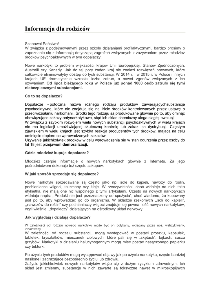 Informacja dla rodziców Szanowni Państwo! W związku z podejmowanymi przez szkołę działaniami profilaktycznymi, bardzo prosimy o zapoznanie się z informacją dotyczącą zagrożeń związanych z zażywaniem przez młodzież środków psychoaktywnych w tym dopalaczy. Nowe narkotyki to problem większości krajów Unii Europejskiej, Stanów Zjednoczonych, Australii czy Kanady. Jak do tej pory żaden kraj nie znalazł rozwiązań prawnych, które całkowicie eliminowałyby dostęp do tych substancji. W 2014 r. i w 2015 r. w Polsce i innych krajach UE dramatycznie wzrosła liczba zatruć, a nawet zgonów związanych z ich używaniem. Od lipca bieżącego roku w Polsce już ponad 1000 osób zatruło się tymi niebezpiecznymi substancjami. Co to są dopalacze? Dopalacze - potoczna nazwa różnego rodzaju produktów zawierającychsubstancje psychoaktywne, które nie znajdują się na liście środków kontrolowanych przez ustawę o przeciwdziałaniu narkomanii. Środki tego rodzaju są produkowane głównie po to, aby ominąć obowiązujące zakazy antynarkotykowe, stąd ich skład chemiczny ulega ciągłej ewolucji. W związku z szybkim rozwojem wielu nowych substancji psychoaktywnych w wielu krajach nie ma legislacji umożliwiającej skuteczną kontrolę lub zakaz ich dystrybucji. Częstym zjawiskiem w wielu krajach jest szybka reakcja producentów tych środków, mająca na celu ominięcie dopiero co wprowadzanych zakazów Używanie jakichkolwiek środków w celu wprowadzenia się w stan odurzenia przez osoby do lat 18 jest przejawem demoralizacji. Gdzie młodzież kupuje dopalacze? Młodzież czerpie informacje o nowych narkotykach głównie z Internetu. Za jego pośrednictwem dokonuje też często zakupów. W jaki sposób sprzedaje się dopalacze? Nowe narkotyki sprzedawane są często jako np. sole do kąpieli, nawozy do roślin, pochłaniacze wilgoci, talizmany czy kleje. W rzeczywistości, choć widnieje na nich taka etykietka, nie mają one nic wspólnego z tymi artykułami. Często na nowych narkotykach widnieje napis: ,,Produkt nie jest przeznaczony do spożycia”, choć wiadomo, że kupowany jest po to, aby wprowadzać go do organizmu. W składzie rzekomych ,,soli do kąpieli”, ,,nawozów do roślin” czy pochłaniaczy wilgoci znajduje się pewna ilość nowych narkotyków, czyli właśnie ,,dopalaczy” działających na ośrodkowy układ nerwowy. Jak wyglądają i działają dopalacze? W zależności od rodzaju nowego narkotyku może być on połykany, wciągany przez nos, wstrzykiwany, inhalowany. W zależności od rodzaju substancji, mogą występować w postaci proszku, kapsułek, tabletek, kryształków, mieszanek ziołowych, które pali się w „skętach”, fajkach, suszu grzybów. Narkotyki o działaniu halucynogennym mogą mieć postać nasączonego papierku czy tekturki. Po użyciu tych produktów mogą występować objawy jak po użyciu narkotyku, często bardziej nasilone i zagrażające bezpośrednio życiu lub zdrowiu. Zażycie jakichkolwiek nowych narkotyków wiąże się z dużym ryzykiem zdrowotnym. Ich skład jest zmienny, substancje w nich zawarte są toksyczne nawet w mikroskopijnych dawkach, dlatego łatwo doprowadzić do ich przedawkowania, nawet ze skutkiem śmiertelnym. Czy dopalacze uzależniają? Zażywanie dopalaczy powoduje również uzależnienie. Osoby uzależnione od nowych narkotyków mogą doświadczać głodu substancji, a zaprzestanie ich używania zwykle jest bardzo trudne. Na co rodzice powinni zwrócić uwagę? - specyficzne zachowania i przedmioty u dziecka tabletki nieznanego pochodzenia oraz recepty nieznanego pochodzenia pieniądze, sprzęt, brak pieniędzy i długi, znikanie przedmiotów z domu (sprzedaż na narkotyki) ciężki, słodkawy zapach w pokoju lub pochodzący z ubrania czy włosów, częste wietrzenie pokoju, atropina, do zakraplania oczu w celu powiększenia drastycznie zmniejszonych źrenic po zażyciu niektórych substancji psychoaktywnych, pojawienie się różnego rodzaju symboli i znaków na plakatach, zeszytach, luźnych kartkach, notatnikach, nagłe zainteresowanie chemią i botaniką, próby uprawiania nowych rodzajów roślin, sprowadzanie nasion i sadzonek, nadejście niespodziewanych paczek i przesyłek z kraju i zagranicy, korzystanie ze skrytek, zamykanie szuflad. Co robić, gdy podejrzewasz, że dziecko bierze narkotyki? Zacznij działać i dowiedz się jak najwięcej o substancjach psychoaktywnych. Okazuj miłość i zainteresowanie swojemu dziecku, ale też stosuj zasadę ograniczonego zaufania. Nie usprawiedliwiaj nieobecności dziecka w szkole, jeśli nic o nich nie wiedziałeś. Korzystaj ze wsparcia – szukaj pomocy specjalistów zajmujących się uzależnieniami. Gdzie szukać pomocy w przypadku uzależnienia od ,,dopalaczy”? 800 060 800 – bezpłatna, całodobowa infolinia Głównego Inspektora Sanitarnego. Pod tym numerem telefonu można uzyskać informacje na temat negatywnych skutków zażywania dopalaczy oraz o możliwościach leczenia. Infolinia jest także przeznaczona dla rodziców, którzy mają wątpliwości, czy ich dzieci zażywają dopalacze. 116 111 – Telefon Zaufania dla Dzieci i Młodzieży. Linia jest dostępna codziennie w godzinach 12–20, pomoc online dostępna nawww.116111.pl/napisz. 800 100 100 – Telefon dla rodziców i nauczycieli w sprawach bezpieczeństwa dzieci. To bezpłatna i anonimowa pomoc telefoniczna i online dla rodziców i nauczycieli, którzy potrzebują wsparcia i informacji w zakresie przeciwdziałania i pomocy dzieciom przeżywającym kłopoty i trudności wynikające z problemów i zachowań ryzykownych takich jak: agresja i przemoc w szkole, cyberprzemoc i zagrożenia związane z nowymi technologiami, wykorzystywanie seksualne, kontakt z substancjami psychoaktywnymi, uzależnienia, depresja, myśli samobójcze, zaburzenia odżywiania. Telefon prowadzi Fundacja Dzieci Niczyje. Linia dostępna od poniedziałku do piątku w godzinach 12– 8, pomoc on