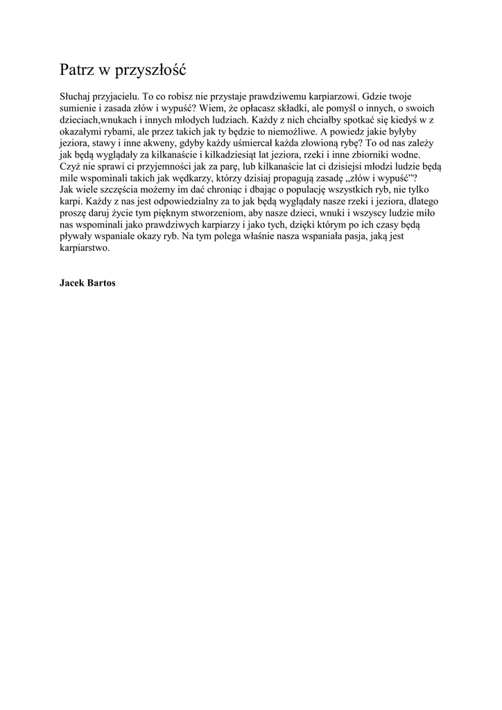Patrz w przyszłość Słuchaj przyjacielu. To co robisz nie przystaje prawdziwemu karpiarzowi. Gdzie twoje sumienie i zasada złów i wypuść? Wiem, że opłacasz składki, ale pomyśl o innych, o swoich dzieciach,wnukach i innych młodych ludziach. Każdy z nich chciałby spotkać się kiedyś w z okazałymi rybami, ale przez takich jak ty będzie to niemożliwe. A powiedz jakie byłyby jeziora, stawy i inne akweny, gdyby każdy uśmiercał każda złowioną rybę? To od nas zależy jak będą wyglądały za kilkanaście i kilkadziesiąt lat jeziora, rzeki i inne zbiorniki wodne. Czyż nie sprawi ci przyjemności jak za parę, lub kilkanaście lat ci dzisiejsi młodzi ludzie będą mile wspominali takich jak wędkarzy, którzy dzisiaj propagują zasadę „złów i wypuść”? Jak wiele szczęścia możemy im dać chroniąc i dbając o populację wszystkich ryb, nie tylko karpi. Każdy z nas jest odpowiedzialny za to jak będą wyglądały nasze rzeki i jeziora, dlatego proszę daruj życie tym pięknym stworzeniom, aby nasze dzieci, wnuki i wszyscy ludzie miło nas wspominali jako prawdziwych karpiarzy i jako tych, dzięki którym po ich czasy będą pływały wspaniale okazy ryb. Na tym polega właśnie nasza wspaniała pasja, jaką jest karpiarstwo. Jacek Bartos