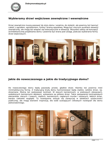Dobrymonatazysta.pl Wybieramy drzwi wejściowe zewnętrzne i wewnętrzne Drzwi zewnętrzne muszą pasować do stylu domu i wnętrza, do stolarki, ale powinny też tworzyć całość z ogrodem, ogrodzeniem, furtką i bramą wjazdową. Mogą być mocnym punktem elewacji zewnętrznej, ale mogą też wtapiać się kolorystycznie w elewację. Wszystko zależy od koncepcji architektonicznej projektanta domu i powinna być brana pod uwagę, podczas wybierania formy drzwi wejściowych. Jakie do nowoczesnego a jakie do tradycyjnego domu? Do nowoczesnego domu będą pasowały proste, gładkie drzwi. Klamka też powinna mieć minimalistyczną formę. Z tradycyjną bryłą domu harmonizować będą ciężkie, solidne drzwi, np. drewniane. Można też zastosować kontrast. W starych kamienicach, w wiekowych elewacjach, ozdobionych kamiennymi detalami, wstawiane są szklane drzwi. Takie zestawienie kontrastowych elementów: starych i nowych, ciężkich, kamiennych, ceglanych murów i szklanych, lekkich drzwi, bardzo ciekawie wygląda. To rozwiązanie stosuje się zazwyczaj w obiektach użyteczności publicznej, ale mogą stanowić inspirację, dla osób szukających ciekawych rozwiązań dla domu jednorodzinnego. page 1 / 4 Dobrymonatazysta.pl Jakie kolory? Jaka wielkość? Kolorystyka zależy od efektu, jaki chcemy osiągnąć: czy chcemy, aby był to element wyróżniający się w elewacji, wybieramy kontrastowy kolor. Powinien on jednak współgrać z elewacją i ze stolarką okienną. Interesująco będą wyglądały zielone, niebieskie czy czerwone drzwi, należy jednak zachować ostrożność przy tym rozwiązaniu, ponieważ jest ono obce kulturowo dla większości obszaru naszego kraju i może wyglądać źle na tle sąsiednich domów. Ważne są nie tylko kolory drzwi wejściowych, ale też proporcje, szerokość, wysokość, które powinny korespondować ze ścianami, podcieniem czy bramą garażową. Co z drzwiami do mieszkania? Jeżeli wymieniamy drzwi wejściowe do mieszkania, pamiętajmy o kolorystyce, formie i stylu obecnych drzwi. Niech przypominają inne drzwi na klatce schodowej. „Miszmasz” nie wygląda dobrze. Jeżeli każde mieszkanie ma drzwi o innym kolorze, osoba z zewnątrz odbiera tą różnorodność negatywnie, ponieważ odczytuje chaos, brak konsekwencji i brak porozumienia pomiędzy współmieszkańcami. page 2 / 4 Dobrymonatazysta.pl Warto pamiętać: Jeżeli drzwi otwierają się do środka, musimy przewidzieć na nie miejsce w przedsionku czy holu. Nie mogą kolidować z innymi drzwiami. Jeżeli zależy nam na bezpieczeństwie, wybierzmy drzwi otwierające się do środka, ponieważ ich zawiasy znajdują się wewnątrz budynku. Utrudnia to wyważenie drzwi. Ważna jest listwa progowa, dzięki której nie ucieka ciepło przez szparę pod drzwiami. Próg zazwyczaj wykonuje się z drewna klejonego, ponieważ musi być odporny na ścieranie. Jeżeli wybierzemy drzwi robione na indywidualne zamówienie, często będziemy musieli na nie poczekać 6-9 tygodni. Drzwi w dwóch różnych kolorach (inny na zewnątrz, inny wewnątrz) są zazwyczaj droższe od jednokolorowych. W rozjaśnieniu przedsionka pomogą nam drzwi z przeszkleniem, lub boczne doświetlenie drzwi, które dodatkowo pozwoli nam zobaczyć, kto stoi za drzwiami. W tym rozwiązaniu stosuje się szyby potrójne, lub szkło hartowane. Drzwi z przeszkleniem muszą mieć certyfikat, który powie nam o odporności ogniowej, właściwościach akustycznych i klasie antywłamaniowej. page 3 / 4 Dobrymonatazysta.pl Drzwi antywłamaniowe nie mogą być montowane do starej ościeżnicy, ponieważ tylko komplet oryginalnych drzwi i ościeżnicy objęty jest gwarancją i daje certyfikat bezpieczeństwa Instytutu Mechaniki Precyzyjnej. page 4 / 4