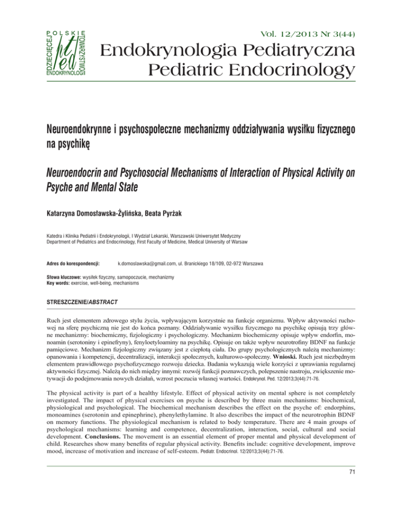 Domosławska-Żylińska K. i inni: Neuroendokrynne i psychospołeczne mechanizmy oddziaływania wysiłku fizycznego na psychikę Vol. 12/2013 Nr 3(44) Endokrynologia Pediatryczna Pediatric Endocrinology Neuroendokrynne i psychospołeczne mechanizmy oddziaływania wysiłku fizycznego na psychikę Neuroendocrin and Psychosocial Mechanisms of Interaction of Physical Activity on Psyche and Mental State Katarzyna Domosławska-Żylińska, Beata Pyrżak Katedra i Klinika Pediatrii i Endokrynologii, I Wydział Lekarski, Warszawski Uniwersytet Medyczny Department of Pediatrics and Endocrinology, First Faculty of Medicine, Medical University of Warsaw Adres do korespondencji: [email protected], ul. Branickiego 18/109, 02-972 Warszawa Słowa kluczowe: wysiłek fizyczny, samopoczucie, mechanizmy Key words: exercise, well-being, mechanisms STRESZCZENIE/ABSTRACT Ruch jest elementem zdrowego stylu życia, wpływającym korzystnie na funkcje organizmu. Wpływ aktywności ruchowej na sferę psychiczną nie jest do końca poznany. Oddziaływanie wysiłku fizycznego na psychikę opisują trzy główne mechanizmy: biochemiczny, fizjologiczny i psychologiczny. Mechanizm biochemiczny opisuje wpływ endorfin, monoamin (serotoniny i epinefryny), fenyloetyloaminy na psychikę. Opisuje on także wpływ neurotrofiny BDNF na funkcje pamięciowe. Mechanizm fizjologiczny związany jest z ciepłotą ciała. Do grupy psychologicznych należą mechanizmy: opanowania i kompetencji, decentralizacji, interakcji społecznych, kulturowo-społeczny. Wnioski. Ruch jest niezbędnym elementem prawidłowego psychofizycznego rozwoju dziecka. Badania wykazują wiele korzyści z uprawiania regularnej aktywności fizycznej. Należą do nich między innymi: rozwój funkcji poznawczych, polepszenie nastroju, zwiększenie motywacji do podejmowania nowych działań, wzrost poczucia własnej wartości. Endokrynol. Ped. 12/2013;3(44):71-76. The physical activity is part of a healthy lifestyle. Effect of physical activity on mental sphere is not completely investigated. The impact of physical exercises on psyche is described by three main mechanisms: biochemical, physiological and psychological. The biochemical mechanism describes the effect on the psyche of: endorphins, monoamines (serotonin and epinephrine), phenylethylamine. It also describes the impact of the neurotrophin BDNF on memory functions. The physiological mechanism is related to body temperature. There are 4 main groups of psychological mechanisms: learning and competence, decentralization, interaction, social, cultural and social development. Conclusions. The movement is an essential element of proper mental and physical development of child. Researches show many benefits of regular physical activity. Benefits include: cognitive development, improve mood, increase of motivation and increase of self-esteem. Pediatr. Endocrinol. 12/2013;3(44):71-76. 71 Praca przeglądowa Wstęp Już ponad dwa tysiące lat temu Hipokrates przekonany był o istotnym wpływie stylu życia na zdrowie człowieka. Jednym z głównych jego elementów jest ruch, o którym Hipokrates powiedział: „Ruch jest najlepszym lekarstwem, nie ma lekarstwa zastępującego ruch” [1]. W literaturze naukowej można znaleźć liczne badania potwierdzające wpływ aktywności fizycznej na organizm oraz jej znaczenie w profilaktyce chorób, takich jak nadciśnienie tętnicze, cukrzyca typu 2 czy otyłość. Natomiast wpływ wysiłku fizycznego na psychikę nie jest do końca poznany [2]. Powszechnie wiadomo, iż wysiłek fizyczny poprawia ogólne samopoczucie. Obecnie oddziaływanie aktywności fizycznej na sferę psychiczną opisują trzy główne mechanizmy: biochemiczny, fizjologiczny i psychologiczny [3, 4]. Mechanizmy te wyjaśniają pozytywny wpływ aktywności fizycznej na psychikę, przejawiający się między innymi polepszeniem nastroju, zwiększeniem energii i motywacji do podejmowania nowych działań. Mechanizm neuroendokrynny Intensywny i długotrwały wysiłek fizyczny powoduje wzrost ilości endorfin, wpływa na mechanizm oddziaływania dynorfin i enkefalin (pozostałych dwóch grup endogennych peptydów opioidowych) [5]. Są one silnymi agonistami receptorów opioidowych μ, których pobudzenie powoduje polepszenie nastroju oraz odczuwanie przyjemności. Odpowiadają za wzrost wytrzymałości na ból oraz występowanie stanów euforycznych (szczególnie wśród biegaczy występuje tzw. euforia biegacza) [6]. Umiarkowana aktywność fizyczna podnosi poziom fenyloetyloaminy (PEA) – naturalnie produkowanej przez organizm człowieka substancji, która swoją budową zbliżona jest do amfetaminy. Przypuszcza się, iż fenyloetyloamina odpowiedzialna jest także za występowanie fenomenu euforii biegacza. Zaobserwowano wzrost ilości produkcji PEA wraz ze wzrostem intensywności wysiłku. U osób ze zdiagnozowaną depresją i stanami lękowymi odnotowuje się obniżony poziom PEA, co stanowi podstawę do stosowania aktywności fizycznej jako środka leczniczego [7]. Wysiłek fizyczny wdrożony do programu leczniczego był odbierany przez pacjentów jako jeden z ważniejszych elementów całościowej terapii [8]. Umiarkowana aktywność fizyczna (70–80% tętna maksymalnego) trwająca dłuższy czas (powyżej 72 Endokrynol. Ped., 12/2013;3(44):71-76 45 minut) wpływa znacząco na wzrost anandamidu (naturalnego kannabinoidu). Alkaloid ten powoduje efekt podobny do psychoaktywnego THC zawartego w marihuanie. Kannabinoidy oddziałują na receptory kannabinoidowe w mózgu, znajdujące się w regionach odpowiedzialnych za pamięć, sen, czuwanie, emocje, postawę ciała oraz na komórki układu odpornościowego. Stwierdzono, że anandamid jest produkowany w organizmie nie tylko podczas wysiłku fizycznego, ale także w trakcie wykonywania ćwiczeń biernych czy masażu [9]. Związek między aktywnością fizyczną a samopoczuciem może być tłumaczony wzrostem poziomu monoamin: serotoniny i epinefryny. Zwi