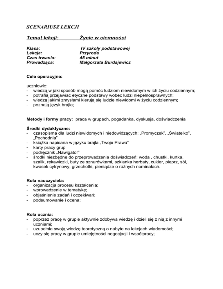 SCENARIUSZ LEKCJI Temat lekcji: Życie w ciemności Klasa: Lekcja: Czas trwania: Prowadząca: IV szkoły podstawowej Przyroda 45 minut Małgorzata Burdajewicz Cele operacyjne: uczniowie: - wiedzą w jaki sposób mogą pomóc ludziom niewidomym w ich życiu codziennym; - potrafią przejawiać etyczne podstawy wobec ludzi niepełnosprawnych; - wiedzą jakimi zmysłami kierują się ludzie niewidomi w życiu codziennym; - poznają język brajla; Metody i formy pracy: praca w grupach, pogadanka, dyskusja, doświadczenia Środki dydaktyczne: - czasopisma dla ludzi niewidomych i niedowidzących: „Promyczek”, „Światełko”, „Pochodnia” - książka napisana w języku brajla „Twoje Prawa” - karty pracy grup - podręcznik „Nawigator” - środki niezbędne do przeprowadzenia doświadczeń: woda , chustki, kurtka, szalik, rękawiczki, buty ze sznurówkami, szklanka herbaty, cukier, pieprz, sól, kwasek cytrynowy, grzechotki, pieniądze o różnych nominałach. Rola nauczyciela: - organizacja procesu kształcenia; - wprowadzenie w tematykę; - objaśnienie zadań i oczekiwań; - podsumowanie i ocena; Rola ucznia: - poprzez pracę w grupie aktywnie zdobywa wiedzę i dzieli się z nią z innymi uczniami; - uzupełnia swoją wiedzę teoretyczną o nabyte na lekcjach wiadomości; - uczy się pracy w grupie umiejętności negocjacji i współpracy; Przebieg lekcji: 1. Przypomnienie wiadomości o zmysłach zwłaszcza o zmyśle wzroku. 2. Wprowadzenie do tematu lekcji. 3. Nauczyciel podaje temat lekcji i sposób jego realizacji. 4. Przypomnienie zasad pracy w grupach. 5. Uczniowie dokonują podziału funkcji w grupie. 6. Przeprowadzenie prostych doświadczeń w grupach. 7. Uczniowie przy pomocy nauczyciela podają trudności na jakie napotykają ludzie niewidomi. 8. Nauczyciel omawia pismo brajla. 9. Pokazanie przykładowych czasopism i książek, z których korzystają ludzie niewidomi. 10. Omówienie w jaki sposób realizują się ludzie niewidomi i jak odnajdują się w dzisiejszym świecie. 11. Zapisanie notatki do zeszytu. 12. Zadanie domowe.( Napisz pismem brajla swoje imię i nazwisko i wykonaj ćwiczenie 5 str. 31 ). Pytania dla grup: Zadanie dla grupy I 1. Wybierzcie spośród siebie: lidera, sekretarza i sprawozdawcę 2. Dokładnie przeanalizujcie tekst i wykonajcie zadanie: Jesteś osobą niewidzącą ( zawiąż chustkę na oczy ). Masz psa przewodnika. Twój psi przyjaciel dłuższy czas spędza z Tobą w domu. Po kilku godzinach wyraźnie prosi Ciebie o wyjście na spacer. Decydujesz się wyprowadzić psa, ale za oknem jest chłodno. Musisz się ciepło ubrać, założyć i zasznurować buty. 3. Po wykonaniu tego zadania odpowiedzcie na pytanie: Na jakie trudności napotyka człowiek niewidzący w życiu codziennym. Czas : 5 min. Zadanie dla grupy II 1. Wybierzcie spośród siebie: lidera, sekretarza i sprawozdawcę. 2. Wykonajcie doświadczenie: Jesteś osobą niewidzącą ( zawiąż chustkę na oczy ). Gotujesz właśnie zupę i dostałeś ochoty na herbatę. Twoim zadaniem będzie: przyprawić solą i pieprzem zupę, a do herbaty użyć cukru i kwasku cytrynowego. 3. Po wykonaniu tego zadania odpowiedzcie na pytanie: W jaki sposób poradziłeś sobie z wykonaniem tego doświadczenia – jakiego zmysłu użyłeś do tego zadania. Czas : 5 min. Zadanie dla grupy III 1. Wybierzcie spośród siebie: lidera, sekretarza i sprawozdawcę. 2. Dokładnie przeanalizujcie tekst i zaimprowizujcie scenkę: Jesteś osobą niewidzącą ( zawiąż chustkę na oczy ). Wyszedłeś do sklepu po codzienne zakupy. W twoim koszyku znalazło się sporo smakołyków za które Pani kasjerka każe nam zapłacić 37 zł. 52 gr. i prosi o odliczoną kwotę. Wyciągasz portfel z pieniędzmi i zaczynasz odliczać... 3. Po wykonaniu tego zadania odpowiedzcie na pytanie: W jaki sposób poradziłeś sobie z odliczaniem pieniędzy – jakiego zmysłu użyłeś do wykonania tego zadania. Czas : 5 min. Zadanie dla grupy IV 1. Wybierzcie spośród siebie: lidera, sekretarza i sprawozdawcę. 2. Wykonajcie ćwiczenie: - wybierzcie osobę i przewiążcie jej oczy chustką - dwie następne wyznaczone osoby z grupy niech staną w dwóch różnych punktach klasy z grzechotką w ręku - osoba z zawiązanymi oczami na znak od nauczyciela ruszy w kierunku pierwszej osoby która będzie wyznaczała jej trasę dźwiękiem grzechotki. Po dotarciu do celu – zmienia kierunek i idzie do drugiej osoby z grzechotką. Uwaga ! Druga osoba z grzechotką zaczyna wydawać dźwięk dopiero po dotarciu osoby niewidzącej do pierwszego celu. 3. Odpowiedzcie na pytanie: W jakich sytuacjach niewidzący posługuje się zmysłem słuchu. Podaj przykłady. Czas : 5 min. Zadanie dla grupy I 1. Wybierzcie spośród siebie: lidera, sekretarza i sprawozdawcę 2. Dokładnie przeanalizujcie tekst i wykonajcie zadanie: Jesteś osobą niewidzącą ( zawiąż chustkę na oczy ). Masz psa przewodnika. Twój psi przyjaciel dłuższy czas spędza z Tobą w domu. Po kilku godzinach wyraźnie prosi Ciebie o wyjście na spacer. Decydujesz się wyprowadzić psa, ale za oknem jest chłodno. Musisz się ciepło ubrać, założyć i zasznurować buty. 3. Po wykonaniu tego zadania odpowiedzcie na pytanie: Na jakie trudności napotyka człowiek niewidzący w życiu codziennym. Czas : 5 min. NOTATKI: Zadanie dla grupy II 1. Wybierzcie spośród siebie: lidera, sekretarza i sprawozdawcę. 2. Wykonajcie doświadczenie: Jesteś osobą niewidzącą ( zawiąż chustkę na oczy ). Gotujesz właśnie zupę i dostałeś ochoty na herbatę. Twoim zadaniem będzie: przyprawić solą i pieprzem zupę, a do herbaty użyć cukru i kwasku cytrynowego. 3. Po wykonaniu tego zadania odpowiedzcie na pytanie: W jaki sposób poradziłeś sobie z wykonaniem tego doświadczenia – jakiego zmysłu użyłeś do tego zadania. Czas : 5 min. NOTATKI: Zadanie dla grupy III 1. Wybierzcie spośród siebie: lidera, sekretarza i sprawozdawcę. 2. Dokładnie przeanalizujcie tekst i zaimprow