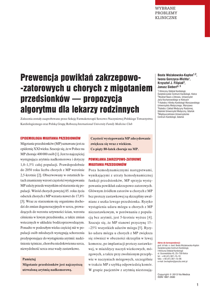 WYBRANE PROBLEMY KLINICZNE Prewencja powikłań zakrzepowo-zatorowych u chorych z migotaniem przedsionków — propozycja algorytmu dla lekarzy rodzinnych Zalecenia zostały zaaprobowane przez Sekcję Farmakoterapii Sercowo-Naczyniowej Polskiego Towarzystwa Beata Wożakowska-Kapłon1,2, Iwona Gorczyca-Michta¹, Krzysztof J. Filipiak3, Janusz Siebert4, 5 1I Kliniczny Oddział Kardiologii, Świętokrzyskie Centrum Kardiologii, Kielce 2Wydział Nauk o Zdrowiu, Uniwersytet Jana Kochanowskiego w Kielcach 3I Katedra i Klinika Kardiologii Warszawskiego Uniwersytetu Medycznego, Warszawa 4Katedra i Zakład Medycyny Rodzinnej, Gdański Uniwersytet Medyczny, Gdańsk 5Międzyuczelniane Uniwersyteckie Centrum Kardiologii, Gdańsk Kardiologicznego oraz Polską Grupę Roboczą International University Family Medicine Club EPIDEMIOLOGIA MIGOTANIA PRZEDSIONKÓW Częstość występowania MP zdecydowanie Migotanie przedsionków (MP) uznawane jest za zwiększa się wraz z wiekiem. epidemię XXI wieku. Szacuje się, że w Polsce na Co piąty 80-latek choruje na MP. MP choruje 400 000 osób [1]. Jest to najczęściej występująca arytmia nadkomorowa i dotyczy POWIKŁANIA ZAKRZEPOWO-ZATOROWE 1,0–1,5% całej populacji. Prawdopodobnie MIGOTANIA PRZEDSIONKÓW do 2050 roku liczba chorych z MP wzrośnie Poza hemodynamicznymi następstwami, 2,5-krotnie [2]. Obserwowany w ostatnich la- wynikającymi z utraty hemodynamicznej tach znamienny wzrost częstości występowania funkcji przedsionków, MP sprzyja wystę- MP zależy przede wszystkim od starzenia się po- powaniu powikłań zakrzepowo-zatorowych. pulacji. Wśród chorych powyżej 85. roku życia Głównym źródłem zatorów u chorych z MP odsetek chorych z MP wzrasta nawet do 17,8% bez protezy zastawkowej są skrzepliny uwal- [3]. Wraz ze starzeniem się organizmu docho- niane z uszka lewego przedsionka. Ryzyko dzi do zmian degeneracyjnych w sercu, prowa- wystąpienia udaru mózgu u chorych z MP dzących do wzrostu sztywności ścian, wzrostu niezastawkowym, w porównaniu z popula- ciśnienia w lewym przedsionku, a także zmian cją bez arytmii, jest 5-krotnie wyższe [4]. wstecznych w układzie bodźcoprzewodzącym. Szacuje się, że MP stanowi przyczynę 15– Ponadto w podeszłym wieku częściej niż w po- –25% wszystkich udarów mózgu [5]. Ryzy- pulacji osób młodszych występują schorzenia ko udaru mózgu u chorych z MP zwiększa predysponujące do wystąpienia arytmii: nadci- się również w obecności skrzeplin w lewej śnienie tętnicze, choroba niedokrwienna serca, komorze, po implantacji protezy zastawko- niewydolność serca oraz wady zastawkowe. wej, w miażdżycy naczyń wieńcowych, mózgowych, a także przy zwolnionym przepły- Pamiętaj wie w naczyniach mózgowych, szczególnie Migotanie przedsionków jest najczęstszą w trakcie MP z szybką odpowiedzią komór. utrwaloną arytmią nadkomorową. W grupie pacjentów z arytmią niestosują- Adres do korespondencji: prof. dr hab. n. med. Beata Wożakowska-Kapłon Świętokrzyskie Centrum Kardiologii, I Kliniczny Oddział Kardiologii ul. Grunwaldzka 45, 25–736 Kielce tel.: +48 (41) 367–15–10 faks: +48 (41) 367–13–96 e-mail: [email protected] Copyright © 2013 Via Medica ISSN 1897–3590 1 WYBRANE PROBLEMY KLINICZNE Rycina 1. Postępowanie u chorych z migotaniem przedsionków [7]. MP — migotanie przedsionków, ACE-I — inhibitor konwertazy angiotensyny, ARB — antagonista receptora angiotensyny cych doustnych antykoagulantów ryzyko (ryc. 1) [7]. Na podstawie wyników The Swe- zatoru wynosi około 5% w okresie jednego dish Cohort Atrial Fibrillation Study oceniono roku [4]. Oszacowano także, że u pacjentów czynniki ryzyka wystąpienia udaru mózgu, z MP udar mózgu ma zwykle ciężki prze- przejściowego ataku niedokrwiennego (TIA, bieg i wiąże się z wysokim ryzykiem zgonu transient ischaemic attack,) i zatorowości ob- — około 20% i niepełnosprawności — około wodowej w grupie 90490 pacjentów, którzy nie 60% [6]. otrzymywali leczenia przeciwkrzepliwego. Wyniki przedstawiono w tabeli 1 [8]. Przez wiele Pamiętaj lat przy stratyfikacji ryzyka zakrzepowo-zato- Najgroźniejszym powikłaniem MP jest rowego obowiązywała — nadal popularna na udar mózgu. kontynencie amerykańskim (tab. 2) [7] — skala Udary mózgu w przebiegu arytmii częściej CHADS2 (cardiac failure, hypertension, age, dia- bywają śmiertelne i częściej prowadzą do nie- betes, stroke), zaproponowana przez badaczy pełnosprawności niż udary u chorych bez MP. projektu SPAF (Stroke Prevention in Atrial Powikłaniem MP mogą być także zatory Fibrillation).Opiera się ona na prostym syste- w tętnicach obwodowych: naczyniach ner- mie punktowym polegającym na ocenie pięciu kowych, krezkowych oraz tętnicach kończyn. zmiennych. W przypadku przebytego udaru mózgu lub TIA przyznawane są 2 punkty; a po 2 JAK OCENIĆ RYZYKO POWIKŁAŃ 1 punkcie dla następujących czynników ryzyka: ZAKRZEPOWO-ZATOROWYCH U CHORYCH wieku > 75 lat, nadciśnienia tętniczego, cukrzy- Z MIGOTANIEM PRZEDSIONKÓW? cy lub niewydolności serca [7]. Maksymalna Ryzyko powikłań zakrzepowo-zatorowych liczba punktów według skali CHADS2 wyno- w przebiegu MP może być różne i zależy od si 6 punktów. Chorzy, którzy otrzymują 2 lub obecności czynników sprzyjających powsta- więcej punktów, mają duże ryzyko powikłań za- waniu zakrzepów i zatorów. Ocena czynni- krzepowo-zatorowych. W przypadku uzyskania ków ryzyka powikłań zakrzepowo-zatorowych 1 punktu ryzyko to oceniane jest jako pośred- i ustalenie na tej podstawie wskazań do le- nie, a gdy według prezentowanej skali chory nie czenia przeciwzakrzepowego to prioryteto- otrzymuje żadnego punktu, ryzyko określane we działanie, które u pacjentów z MP należy jest jako małe. W wytycznych Europejskiego wdrożyć bezpośrednio po rozpoznaniu arytmii Towarzystwa Kardiologicznego (ESC, Eurowww.fmr.viamedica.pl Beata Wożakowska-Kapłon, Iwona Gorczy