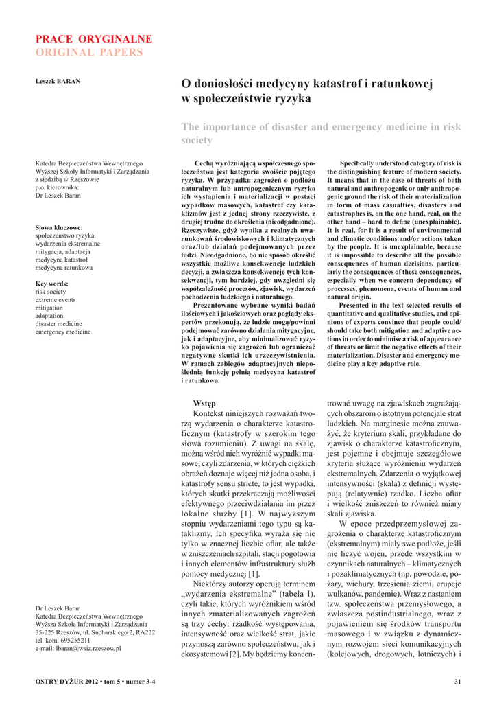 PRACE ORYGINALNE ORIGINAL PAPERS Leszek BARAN O doniosłości medycyny katastrof i ratunkowej w społeczeństwie ryzyka The importance of disaster and emergency medicine in risk society Katedra Bezpieczeństwa Wewnętrznego Wyższej Szkoły Informatyki i Zarządzania z siedzibą w Rzeszowie p.o. kierownika: Dr Leszek Baran Słowa kluczowe: społeczeństwo ryzyka wydarzenia ekstremalne mitygacja, adaptacja medycyna katastrof medycyna ratunkowa Key words: risk society extreme events mitigation adaptation disaster medicine emergency medicine Dr Leszek Baran Katedra Bezpieczeństwa Wewnętrznego Wyższa Szkoła Informatyki i Zarządzania 35-225 Rzeszów, ul. Sucharskiego 2, RA222 tel. kom. 695255211 e-mail: [email protected] OSTRY DYŻUR 2012 • tom 5 • numer 3-4 Cechą wyróżniającą współczesnego społeczeństwa jest kategoria swoiście pojętego ryzyka. W przypadku zagrożeń o podłożu naturalnym lub antropogenicznym ryzyko ich wystąpienia i materializacji w postaci wypadków masowych, katastrof czy kataklizmów jest z jednej strony rzeczywiste, z drugiej trudne do określenia (nieodgadnione). Rzeczywiste, gdyż wynika z realnych uwarunkowań środowiskowych i klimatycznych oraz/lub działań podejmowanych przez ludzi. Nieodgadnione, bo nie sposób określić wszystkie możliwe konsekwencje ludzkich decyzji, a zwłaszcza konsekwencje tych konsekwencji, tym bardziej, gdy uwzględni się współzależność procesów, zjawisk, wydarzeń pochodzenia ludzkiego i naturalnego. Prezentowane wybrane wyniki badań ilościowych i jakościowych oraz poglądy ekspertów przekonują, że ludzie mogą/powinni podejmować zarówno działania mitygacyjne, jak i adaptacyjne, aby minimalizować ryzyko pojawienia się zagrożeń lub ograniczać negatywne skutki ich urzeczywistnienia. W ramach zabiegów adaptacyjnych niepoślednią funkcję pełnią medycyna katastrof i ratunkowa. Specifically understood category of risk is the distinguishing feature of modern society. It means that in the case of threats of both natural and anthropogenic or only anthropogenic ground the risk of their materialization in form of mass casualties, disasters and catastrophes is, on the one hand, real, on the other hand – hard to define (unexplainable). It is real, for it is a result of environmental and climatic conditions and/or actions taken by the people. It is unexplainable, because it is impossible to describe all the possible consequences of human decisions, particularly the consequences of these consequences, especially when we concern dependency of processes, phenomena, events of human and natural origin. Presented in the text selected results of quantitative and qualitative studies, and opinions of experts convince that people could/ should take both mitigation and adaptive actions in order to minimise a risk of appearance of threats or limit the negative effects of their materialization. Disaster and emergency medicine play a key adaptive role. Wstęp Kontekst niniejszych rozważań tworzą wydarzenia o charakterze katastroficznym (katastrofy w szerokim tego słowa rozumieniu). Z uwagi na skalę, można wśród nich wyróżnić wypadki masowe, czyli zdarzenia, w których ciężkich obrażeń doznaje więcej niż jedna osoba, i katastrofy sensu stricte, to jest wypadki, których skutki przekraczają możliwości efektywnego przeciwdziałania im przez lokalne służby [1]. W najwyższym stopniu wydarzeniami tego typu są kataklizmy. Ich specyfika wyraża się nie tylko w znacznej liczbie ofiar, ale także w zniszczeniach szpitali, stacji pogotowia i innych elementów infrastruktury służb pomocy medycznej [1]. Niektórzy autorzy operują terminem „wydarzenia ekstremalne” (tabela I), czyli takie, których wyróżnikiem wśród innych zmaterializowanych zagrożeń są trzy cechy: rzadkość występowania, intensywność oraz wielkość strat, jakie przynoszą zarówno społeczeństwu, jak i ekosystemowi [2]. My będziemy koncen- trować uwagę na zjawiskach zagrażających obszarom o istotnym potencjale strat ludzkich. Na marginesie można zauważyć, że kryterium skali, przykładane do zjawisk o charakterze katastroficznym, jest pojemne i obejmuje szczegółowe kryteria służące wyróżnieniu wydarzeń ekstremalnych. Zdarzenia o wyjątkowej intensywności (skala) z definicji występują (relatywnie) rzadko. Liczba ofiar i wielkość zniszczeń to również miary skali zjawiska. W epoce przedprzemysłowej zagrożenia o charakterze katastroficznym (ekstremalnym) miały swe podłoże, jeśli nie liczyć wojen, przede wszystkim w czynnikach naturalnych – klimatycznych i pozaklimatycznych (np. powodzie, pożary, wichury, trzęsienia ziemi, erupcje wulkanów, pandemie). Wraz z nastaniem tzw. społeczeństwa przemysłowego, a zwłaszcza postindustrialnego, wraz z pojawieniem się środków transportu masowego i w związku z dynamicznym rozwojem sieci komunikacyjnych (kolejowych, drogowych, lotniczych) i 31 Tabela I Podział wydarzeń ekstremalnych [2] Wydarzenia ekstremalne Źródła antropologiczne Zagrożenia złożone atak terrorystyczny wojna Zagrożenia techniczne katastrofa związana z procesem produkcji (górnicza, przemysłowa, chemiczna, nuklearna) katastrofa związana z transportem katastrofa budowlana telekomunikacyjnych – ludzie stali się dla siebie źródłem zagrożeń o potencjale często nie ustępującym potencjałowi niebezpieczeństw o podłożu naturalnym (by wspomnieć choćby zagrożenia nuklearne czy chemiczne, katastrofy morskie, kolejowe czy lotnicze). Jeśli dodać do tego ataki terrorystyczne, których sprawstwo, ale i podłoże (różnice kultur, ideologii, zamożności) należy kojarzyć z aktywnością ludzi – postulat Paula Crutzena, by obecną epokę nazwać „antropocenem” [3], nie może dziwić także ekspertów w zakresie bezpieczeństwa. Antropogeniczny w znacznym stopniu wymiar współczesnych zagrożeń wydaje się być fundamentalny dla społeczeństwa, które 