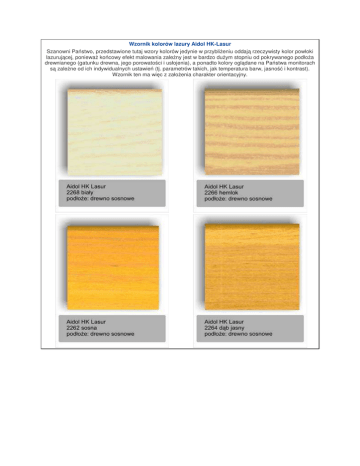 Wzornik kolorów lazury Aidol HK-Lasur Szanowni Państwo, przedstawione tutaj wzory kolorów jedynie w przybliżeniu oddają rzeczywisty kolor powłoki lazurującej, ponieważ końcowy efekt malowania zależny jest w bardzo dużym stopniu od pokrywanego podłoża drewnianego (gatunku drewna, jego porowatości i usłojenia), a ponadto kolory oglądane na Państwa monitorach są zależne od ich indywidualnych ustawień (tj. parametrów takich, jak temperatura barw, jasność i kontrast). Wzornik ten ma więc z założenia charakter orientacyjny.