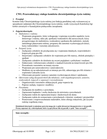 Opis pozycji wolontariusza duszpasterstwa- CWL Przewodniczący stałego komitetu chrześcijańskiego życia rodziny CWL Przewodniczący stałego komitetu chrześcijańskiego życia rodziny Przegląd Komitet stały Chrześcijańskiego życia rodziny jest funkcją parafialnej rady wykonawczej ze specjalnymi zadaniami dla Chrześcijańskiego życia rodziny, wedle wytycznych Katolickiej ligi kobiet zawartych w Kanadyjskim podręczniku zarządzania. Zajęcia/obowiązki. Małżeństwo i rodzina; Wspieranie programów, które wzbogacają i wspierają wszystkie aspektów życia domowego i rodziny, takie jak; spotkania weekendowe dla narzeczonych, kursy przygotowujące do małżeństwa, weekendowe spotkania dla małżeństw, metody naturalnego planowania rodziny, programy dla samotnie wychowujących dzieci, kursy rodzicielskie i warsztaty antystresowe. Świętość życia; Zachęcanie członków do przyłączenia się i wspierania lokalnych, wojewódzkich i krajowych grup pro-life. Inicjowanie i zachęcanie członków do wspierania pro-life marszy, zbiórek pieniędzy i spotkań. Zachęcanie członków do dzielenia się swymi poglądami z politykami i mediami. Edukowanie i informowanie członków o naukach kościoła na temat kwestii pro-life. Prowadzenie warsztatów na tematy etyczne. Wspieranie pro-ustawodawstwa i ustawodawców. Modlenie się na nabożeństwach za intencje pro-life, odmawiając pro-life różaniec i wspieranie Łańcucha życia. Oferowanie przyjaźni i pomocy samotnie wychowującym dzieci i opiekunom. Oferowanie usług duszpasterskich dla młodzieży, osób niepełnosprawnch, seniorów, owdowiałych, żyjących w separacji i rozwiedzionym; Organizowanie warsztatów edukacyjnych, grup wsparcia itp. Poprzez zachętę, wsparcie i modlitwy Powołania; Zachęcanie do modlitwy o powołania. Zapraszanie kapłanów i osoby duchowne do mówienia o powołaniach. Zachęcanie rodzin do zapraszania księży i duchownych do domu Zachęcanie rodzin do rozmawiania o powołaniach z dziećmi, wnukami i przyjaciółmi Promowanie i rozpowszechnianie materiałów, które oferują wskazówki, jak uczynić rodzinę wspólnotą wiary. Działalność/obowiązki wymienione powyżej mogą nie w pełni obrazować duszpasterstwo w tej parafii. Proszę zapoznać się z obowiązkami, które są specyficzne dla tej parafii, w polu "Inne szczegóły". Inne szczegóły: ________________________________________________________________________ ________________________________________________________________________ ________________________________________________________________________ Obowiązuje od: 01/09/09 Page 1 of 3 H-CWLCFLSCC 3.0 Opis pozycji wolontariusza duszpasterstwa- CWL Przewodniczący stałego komitetu chrześcijańskiego życia rodziny Umiejętności, doświadczenie i kwalifikacje Jest członkiem w pełni zainicjowanym w Kościele katolickim, zgodnie z wymogami. Musi mieć, co najmniej 16 lat. Jest zaznajomiony z misją i celami Katolickiej ligi kobiet, wedle wytycznych zawartych w Kanadyjskim podręczniku zarządzania. Ma dobrą reputacje wśród wspólnoty parafialnej. Ma stosowne wykształcenie. Osobiste cechy i zalety Pragnie służyć Wspólnocie i przeznacza na to czas i talent. Jest rzetelny, godny zaufania i entuzjastyczny. Jest w stanie komunikować się z innymi i ma dobre przywódczych. Ma zdolność do pracy samodzielnie lub jako członek zespołu. Orientacja i szkolenia Standardowy program orientacji parafii i szkolenie przez poprzedniego przewodniczącego i zarząd ligi. Grupa uczestników Członkowie parafii i lokalnych społeczności. Wsparcie, nadzór i ewaluacja Prezydent i poprzedni przewodniczący są pierwszą instancją oferującą wsparcie, nadzór i ewaluacje. Długość kadencji Okres dwóch lat. Korzyści i warunki pracy Bezpośrednio przyczyni się do wzbogacenia małżeństwa i życia rodzinnego w ramach wspólnoty parafialnej. Będzie rozwijać umiejętności przywództwa i komunikacji. Będzie promować współpracę z różnymi grupami, umożliwiając im się lepiej zapoznać z różnymi zadaniami w ramach Kościoła katolickiego. Jest to pozycja wolontariusza, wymagające zaangażowania czasu ___ godzin na tydzień/___ miesięcznie. Musi być w stanie uczestniczyć w sesji orientacyjnej i szkoleniach, zgodnie z wymaganiami. Zalecenia przy selekcji Jest to stanowisko wysokiego ryzyka. Wymagane jest wypełnienie formularza Dane wolontariusza. Rozmowa kwalifikacyjna i sprawdzenie referencji osobistych są wymagane. Sprawdzenie karnego rekordu jest wymagane. Szkolenie i orientacja są wymagane. Będzie nadzór i okresowe ewaluacje. Kolejne spotkania z uczestnikiem mogą być prowadzone. Obowiązuje od: 01/09/09 Page 2 of 3 H-CWLCFLSCC 3.0 Opis pozycji wolontariusza duszpasterstwa- CWL Przewodniczący stałego komitetu chrześcijańskiego życia rodziny Ten opis stanowiska dokładnie odzwierciedla opis pozycji - CWL Przewodniczący stałego komitetu chrześcijańskiego życia rodziny obecnie praktykowane w __________________________. (Nazwa parafii) ___________________________________ Parafialny komitet selekcji wolontariuszy __________________________________ Proboszcz __________________________________ Data Przygotowane przez: Archidiecezja Toronto Obowiązuje od: 01/09/09 Page 3 of 3 H-CWLCFLSCC 3.0