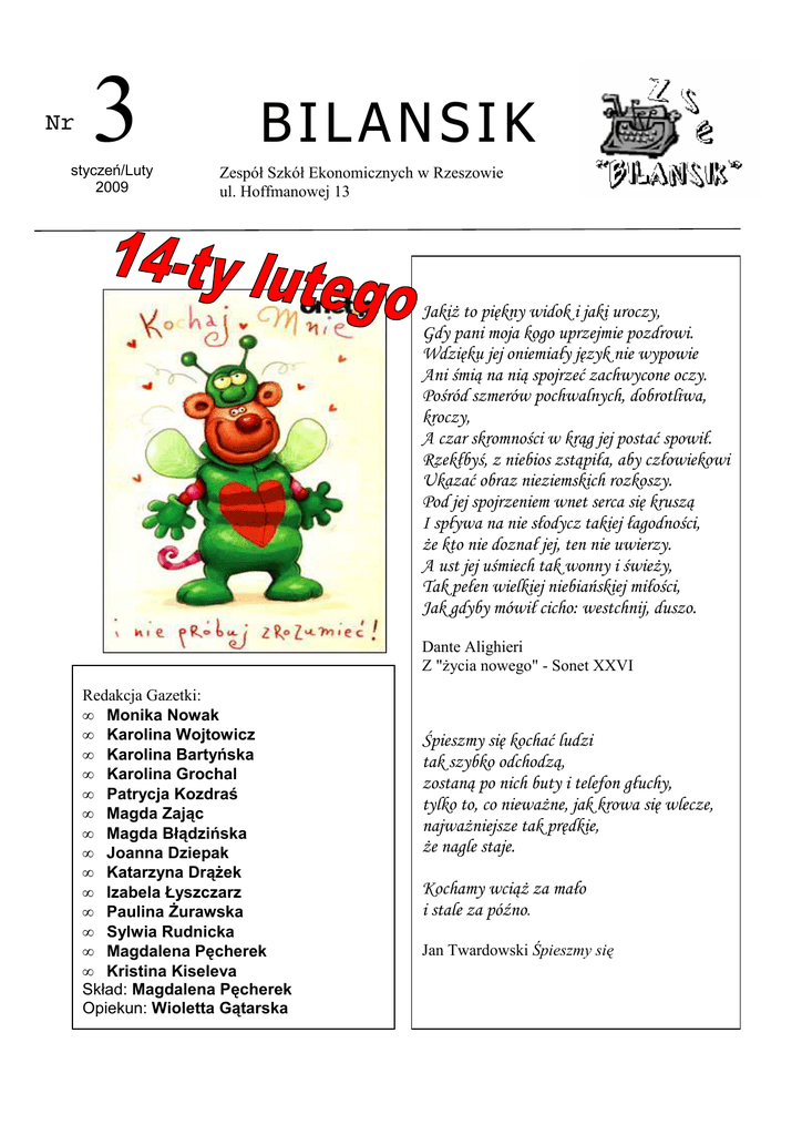 Nr 3 styczeń/Luty 2009 BILANSIK Zespół Szkół Ekonomicznych w Rzeszowie ul. Hoffmanowej 13 JakiŜ to piękny widok i jaki uroczy, Gdy pani moja kogo uprzejmie pozdrowi. Wdzięku jej oniemiały język nie wypowie Ani śmią na nią spojrzeć zachwycone oczy. Pośród szmerów pochwalnych, dobrotliwa, kroczy, A czar skromności w krąg jej postać spowił. Rzekłbyś, z niebios zstąpiła, aby człowiekowi Ukazać obraz nieziemskich rozkoszy. Pod jej spojrzeniem wnet serca się kruszą I spływa na nie słodycz takiej łagodności, Ŝe kto nie doznał jej, ten nie uwierzy. A ust jej uśmiech tak wonny i świeŜy, Tak pełen wielkiej niebiańskiej miłości, Jak gdyby mówił cicho: westchnij, duszo. Dante Alighieri Z "Ŝycia nowego" - Sonet XXVI Redakcja Gazetki: • Monika Nowak • Karolina Wojtowicz • Karolina Bartyńska • Karolina Grochal • Patrycja Kozdraś • Magda Zając • Magda Błądzińska • Joanna Dziepak • Katarzyna DrąŜek • Izabela Łyszczarz • Paulina śurawska • Sylwia Rudnicka • Magdalena Pęcherek • Kristina Kiseleva Skład: Magdalena Pęcherek Opiekun: Wioletta Gątarska Śpieszmy się kochać ludzi tak szybko odchodzą, zostaną po nich buty i telefon głuchy, tylko to, co niewaŜne, jak krowa się wlecze, najwaŜniejsze tak prędkie, Ŝe nagle staje. Kochamy wciąŜ za mało i stale za późno. Jan Twardowski Śpieszmy się Program Wigilijny został przygotowany miedzy innymi przez: prof. R.Wilczyńską, M.Kraussa i uczniów z wybranych klas ( 4at, 3 al., 2bl, 1al,1bl). Aleksandra Siwiec 1al i Mateusz Zieliński 3bt poprowadzili całą uroczystość. Program artystyczny został przeprowadzony w trzech turach, tak, aby wszyscy uczniowie ekonomika mogli uczestniczyć w nim. Na początku pani dyrektor Szymanek wygłosiła swoje przemówienie. Następnie słowo BoŜe wygłosił nasz ksiądz katecheta Marek Mijal. No i nadeszła chwila, na którą wszyscy czekali mianowicie na obejrzenie przygotowywanego w pocie czoła programu artystycznego. Na scenie występował chórek szkolny pod czujnym okiem pani Katarzyny Sobas-Klocek, towarzyszyli mu uczniowie grający na instrumentach. Nie moŜna teŜ zapomnieć o uczniach, którzy recytowali wiersze, solistach, którzy śpiewali kolędy z udziałem chóru. Na koniec uroczystości została zaśpiewana piosenka ,,Znak pokoju”, po niej Samorząd Uczniowski złoŜył wszystkim Ŝyczenia świąteczne i cała aula zaczęła składać sobie Ŝyczenia ☺. Ale to nie koniec w trzeciej turze mieliśmy specjalnego gościa, ksiądz biskup Edward Białogłowski wygłosił słowo BoŜe. PS. Program został powtórzony w Towarzystwie Brata Alberta w schronisku dla bezdomnych w Rzeszowie. Zdjęcia uczniów wraz z opiekunami i komentarzem ukazały się w ,,Nowinach” rzeszowskich dnia 27.01.09 Magdalena Pęcherek 1 bl ☺☺ Święta BoŜego Narodzenia prawosławne niewiele róŜnią się od świąt katolickich, ale na pewno jest róŜnica w poprzedzającym poście (adwencie), który jest dłuŜszy i trwa 40 dni. Jest zakazane spoŜywanie mięsa, a rybę i nabiał moŜna jeść w ograniczonych ilościach i według sumienia oraz postanowień. Na same święta szykujemy prezenty, świąteczne potrawy i ubieramy choinkę. Na Wigilię (Soczielnik), przygotowujemy potrawy zgodnie z tradycją regionalną, ale jest na pewno kutia, kompot z suszu, pieroŜki oraz inne dania. Po wieczerzy idziemy do Cerkwi na uroczyste naboŜeństwo BoŜonarodzeniowe, podczas którego śpiewamy tradycyjnie kolędy. Same święta powinny trwać 3-4 dni poprzedzone św. Liturgią. NaleŜy zwrócić uwagę na róŜnicę w Liturgii, która jest tylko śpiewana (śpiewa chór i kapłan) i nie ma organów. Jest niezwykle uroczysta i tradycyjna. Trwa ona 3-4 godziny. Prawosławni pozostali teŜ przy starym kalendarzu juliańskim (BoŜe Narodzenie przypada na 7 stycznia), a więc ze świętami katolickimi róŜnią się w czasie o 13 dni. Nie ma tzw. państwowych świąt prawosławnych (jeśli chodzi o Polskę). Jesteśmy w mniejszości i nie zawsze jest łatwo wybierając między szkoła czy pracą, a tradycją i wiarą. Kristina Kiseleva kl.1bl Tysiąca osób spodziewała się Caritas Diecezji Rzeszowskiej. Dlatego tegoroczna wigilia odbyła się w rzeszowskiej hali na Podpromiu. Józef Gal, szef kuchni w rzeszowskiej restauracji Bohema, zarządził robienie pierogów. - Potrawy przygotowały rzeszowskie restauracje, m.in. Bohema, Sabatini i Polonez - wyjawił ks. Stanisław Słowik, dyrektor Caritasu. ``Gotujemy poniedziałku`` Restauracja od Bohema przygotowała potrawy jeszcze dzień wcześniej. - Barszcz czerwony z fasolą, rybę w galarecie, pierogi ruskie, pierogi z kapustą i grzybami, filet z dorsza z kapustą, kompot z suszek i droŜdŜówki – wyliczał Zygmunt Dymczak, szef restauracji. Przygotowania pełną parą takŜe trwały w restauracji Sabatini. - Musieliśmy ulepić 1500 pierogów. Mieliśmy mnóstwo pracy - mówił Janusz Kołcz, właściciel restauracji. - Był teŜ barszcz czerwony, dorsz panierowany i oczywiście kompot z suszek. Czekaliśmy na wszystkich Na wigilię zostali zaproszeni m.in. męŜczyźni, którzy mieszkają w rzeszowskim schronisku dla bezdomnych oraz kobiety ze schroniska w Racławówce. - U nas jest w tej chwili 90 osób - mówił Marek Rzucidło, kierownik schroniska dla bezdomnych męŜczyzn rzeszowskiego Towarzystwa Pomocy im. Brata Alberta. - Z Racławówki przyjedzie około 20 kobiet. Wszyscy idziemy na te Wigilię. Będziemy pomagać w jej organizacji - dodał. W zorganizowaniu poczęstunku pomógł Podkarpacki Klub Biznesu. Na Wigilie przybyło około 9OO osób. Miejsc było dla 1OOO. Wielu ludziom to pomogło. Ciepły posiłek. Coś słodkiego, niczego nie brakowało... Niestety przyszło kilkanaście osób pijanych..... Osoby te zostały wyproszone. Atmosfera była bardzo sympatyczna.. Nikt nie czuł się samotny. Pomagali równieŜ uczniowie z Ekonomika Na godzinę 8. przyszli uczniowie z Ekonom