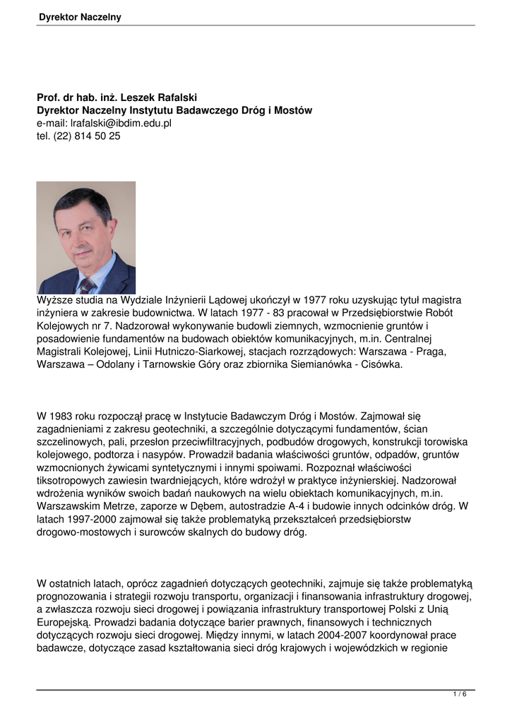 Dyrektor Naczelny Prof. dr hab. inż. Leszek Rafalski Dyrektor Naczelny Instytutu Badawczego Dróg i Mostów e-mail: [email protected] tel. (22) 814 50 25 Wyższe studia na Wydziale Inżynierii Lądowej ukończył w 1977 roku uzyskując tytuł magistra inżyniera w zakresie budownictwa. W latach 1977 - 83 pracował w Przedsiębiorstwie Robót Kolejowych nr 7. Nadzorował wykonywanie budowli ziemnych, wzmocnienie gruntów i posadowienie fundamentów na budowach obiektów komunikacyjnych, m.in. Centralnej Magistrali Kolejowej, Linii Hutniczo-Siarkowej, stacjach rozrządowych: Warszawa - Praga, Warszawa – Odolany i Tarnowskie Góry oraz zbiornika Siemianówka - Cisówka. W 1983 roku rozpoczął pracę w Instytucie Badawczym Dróg i Mostów. Zajmował się zagadnieniami z zakresu geotechniki, a szczególnie dotyczącymi fundamentów, ścian szczelinowych, pali, przesłon przeciwfiltracyjnych, podbudów drogowych, konstrukcji torowiska kolejowego, podtorza i nasypów. Prowadził badania właściwości gruntów, odpadów, gruntów wzmocnionych żywicami syntetycznymi i innymi spoiwami. Rozpoznał właściwości tiksotropowych zawiesin twardniejących, które wdrożył w praktyce inżynierskiej. Nadzorował wdrożenia wyników swoich badań naukowych na wielu obiektach komunikacyjnych, m.in. Warszawskim Metrze, zaporze w Dębem, autostradzie A-4 i budowie innych odcinków dróg. W latach 1997-2000 zajmował się także problematyką przekształceń przedsiębiorstw drogowo-mostowych i surowców skalnych do budowy dróg. W ostatnich latach, oprócz zagadnień dotyczących geotechniki, zajmuje się także problematyką prognozowania i strategii rozwoju transportu, organizacji i finansowania infrastruktury drogowej, a zwłaszcza rozwoju sieci drogowej i powiązania infrastruktury transportowej Polski z Unią Europejską. Prowadzi badania dotyczące barier prawnych, finansowych i technicznych dotyczących rozwoju sieci drogowej. Między innymi, w latach 2004-2007 koordynował prace badawcze, dotyczące zasad kształtowania sieci dróg krajowych i wojewódzkich w regionie 1/6 Dyrektor Naczelny warmińsko-mazurskim, a w latach 2008-2010 zajmował się problematyką wymagań technicznych dotyczących dróg i drogowych obiektów inżynierskich. W latach 2010-2015 zajmował się także problematyką eksploatacji dróg oraz badaniami właściwości materiałów stosowanych do podbudów i podłoża drogowego. W latach 1983-90 kierował Laboratorium Geotechniki, a od 1987 do 1990 roku był również zastępcą kierownika Zakładu Geotechniki w Instytucie Badawczym Dróg i Mostów. Obecnie pełni funkcję Dyrektora Naczelnego w Instytucie Badawczym Dróg i Mostów. W 1996 roku uzyskał stopień doktora habilitowanego nauk technicznych, a w 2009 roku - tytuł profesora nauk technicznych. Autor lub współautor ponad 230 prac badawczych i ekspertyz oraz ponad 130 publikacji krajowych i zagranicznych. Współautor 10 patentów z zakresu stabilizacji gruntów, zawiesin twardniejących i ich zastosowania w praktyce inżynierskiej. Prowadzi aktywną działalność zawodową. Został powołany lub wybrany do następujących krajowych organizacji naukowych, zawodowych i rad naukowych: • Rada Główna Instytutów Badawczych, • Akademia Inżynierska w Polsce, • Polski Kongres Drogowy, • Kongres Budownictwa Polskiego, • Stowarzyszenie na rzecz Infrastruktury, • Rada Naukowo-Konsultacyjna przy Dyrekcji Metra Warszawskiego, • Polski Komitet Geotechniki, • Rada Naukowa Instytutu Badawczego Dróg i Mostów, • Rada Naukowa Instytutu Chemii Przemysłowej, • Rada Naukowa Wojskowego Instytutu Technicznego Uzbrojenia. Jest Przewodniczącym Rady Głównej Instytutów Badawczych, ustawowego organu reprezentującego instytuty badawcze, opracowującego opinie i postulaty w sprawach polityki naukowej i naukowo-technicznej oraz w sprawach warunków i zasad działania tych jednostek. 2/6 Dyrektor Naczelny Jest Prezesem Akademii Inżynierskiej w Polsce, stowarzyszenia pożytku publicznego, którego celem jest służenie polskiemu społeczeństwu, a także społeczeństwom innych krajów we wszystkich dziedzinach inżynierii, techniki, technologii i ochrony środowiska. Jest koordynatorem Polskiej Platformy Technologicznej Transportu Drogowego. Przewodniczy Radzie Programowej kwartalnika Roads and Bridges Drogi i Mosty, czasopisma wydawanego przez Instytut Badawczy Dróg i Mostów w wersji polsko-angielskiej. Uczestniczy w pracach następujących organizacji międzynarodowych: • Forum Europejskich Krajowych Laboratoriów Badawczych Drogownictwa (FEHRL), • Komitetu Badawczego Transportu OECD/ECMT (JTRC) • Międzynarodowego Stowarzyszenia Mechaniki Gruntów i Fundamentowania (ISSMFE) – Komitet TC 202 Geotechnics of Pavements. Zna języki angielski i rosyjski. Ważniejsze prace opublikowane w ostatnich latach: „Warstwy mrozoochronne ze słabych kruszyw grubookruchowych w nawierzchniach drogowych". Seria „Studia i materiały”, Wydawnictwo IBDiM Warszawa, 2006 r. Współautorstwo pracy. „Uwarunkowania prawne budowy dróg". Referat na konferencję pt.: „Dzień Inżyniera Budownictwa”. Poznań, 2007 r. Autorstwo pracy. budowa dróg szybkiego ruchu uwarunkowania prawne" Referat na konferencję pt. „Przyspieszenie budowy dróg ekspresowych w programie rządowym Infrastruktura i środowisko”. Kielce, 2007 r. Współautorstwo pracy. 3/6 Dyrektor Naczelny „Podbudowy drogowe". Seria „Studia i materiały”, Wydawnictwo IBDiM Warszawa, 2007 r. Autorstwo monografii, która otrzymała nagrodę Ministra Infrastruktury. „Transport infrastructure investment. Options for efficiency”. Contributor to the report published by OECD/ ITF, Paris 2008. Autorstwo polskich danych do raportu. „Główne kierunki zmian w warunkach technicznych dotyczących dróg publicznych”. Referat na LI Dni Drogowe, Międzyzdroje 2008 r. Autorstwo referatu. „Perspektywa poprawy stanu infrastruktury drogowej na przykładzie