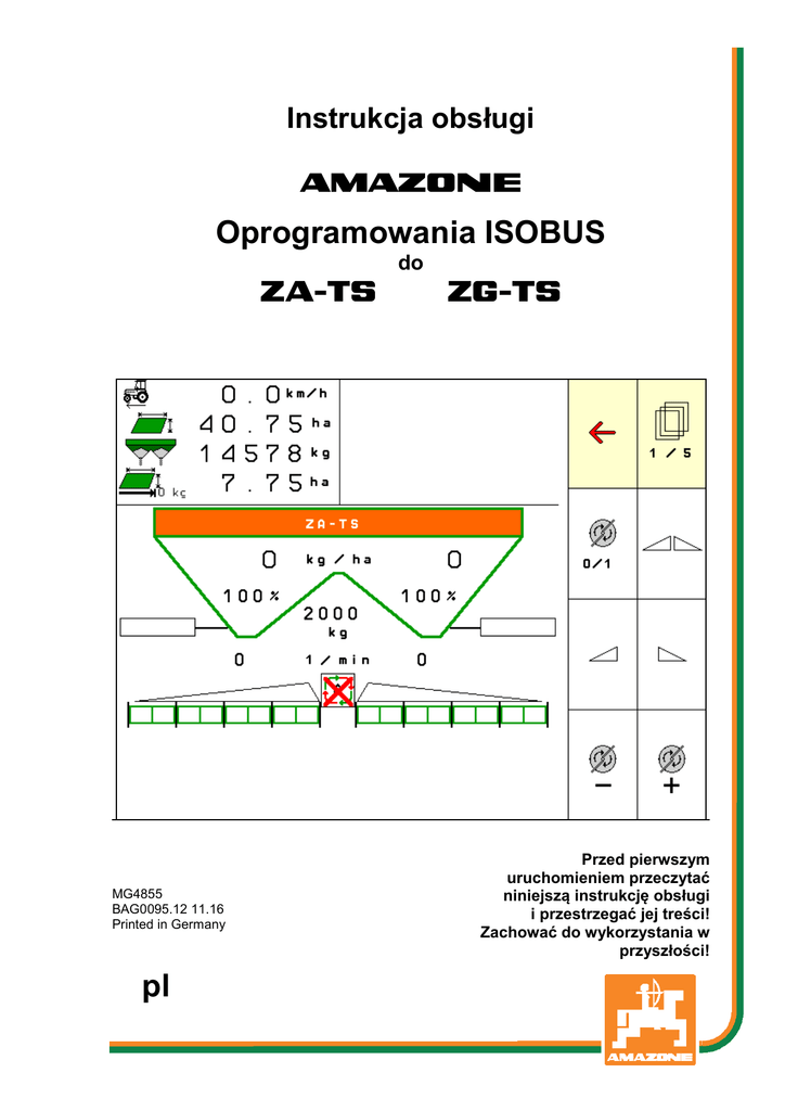 Instrukcja obsługi az Oprogramowania ISOBUS do ZA-TS MG4855 BAG0095.12 11.16 Printed in Germany pl ZG-TS Przed pierwszym uruchomieniem przeczytać niniejszą instrukcję obsługi i przestrzegać jej treści! Zachować do wykorzystania w przyszłości! NIE MOŻNA Czytać instrukcji obsługi nieuważnie i pobieżnie a potem się tym kierować; nie wystarczy od innych słyszeć, że maszyna jest dobra i na tym polegać przy zakupie oraz wierzyć, że teraz wszystko stanie się samo. Użytkownik doprowadzi wtedy do szkód nie tylko dla siebie samego, lecz także do powstania usterki, której przyczynę zrzuci na maszynę zamiast na siebie. Aby być pewnym sukcesu, należy wniknąć w sedno rzeczy względnie zapoznać się z przeznaczeniem każdego z zespołów maszyny i posługiwaniem się nim. Dopiero wtedy można być zadowolonym z siebie i z maszyny. Celem niniejszej instrukcji jest tego osiągnięcie. Leipzig-Plagwitz, 1872 r. 2 ISOBUS TS BAG0095.12 11.16 Dane identyfikacyjne Dane identyfikacyjne Prosimy wpisać tutaj dane identyfikacyjne maszyny. Dane identyfikacyjne znajdą Państwo na tabliczce znamionowej. Numer identyfikacyjny maszyny: (dziesięciomiejscowy) Typ: ISOBUS TS Rok budowy: Masa podstawowa kg: Dopuszczalna masa całkowita kg: Maksymalny załadunek kg: Adres producenta AMAZONEN-WERKE H. DREYER GmbH & Co. KG Postfach 51 D-49202 Hasbergen Tel.: + 49 (0) 5405 50 1-0 E-mail: [email protected] Części zamienne-zamawianie Listy części zamiennych znajdują się w portalu części zamiennych pod adresem www.amazone.de. Zamówienia należy kierować do dealera AMAZONE. Informacje formalne dotyczące instrukcji obsługi Numer dokumentu: MG4855 Data utworzenia: 08.16 Copyright AMAZONEN-WERKE H. DREYER GmbH & Co. KG, 2016 Wszystkie prawa zastrzeżone. Przedruk i sporządzanie wyciągów tylko za pisemnym zezwoleniem AMAZONEN-WERKE H. DREYER GmbH & Co. KG. ISOBUS TS BAG0095.12 11.16 3 Wstęp Wstęp Szanowni Klienci, zdecydowali sie Panstwo na zakup wysokiej jakooci produktu z bogatej palety wyrobów AMAZONEN-WERKE, H. DREYER GmbH & Co. KG. Dziękujemy za Państwa zaufanie. Przy otrzymaniu maszyny prosimy ustalić, czy nie wystąpiły uszkodzenia w transporcie i czy nie ma braków części! Prosimy sprawdzić kompletację dostarczonej maszyny włącznie z zamówionym wyposażeniem specjalnym na podstawie listu wysyłkowego. Tylko natychmiastowa reklamacja prowadzi do likwidacji szkód! Przed pierwszym uruchomieniem maszyny prosimy przeczytać niniejszą instrukcję obsługi, a szczególnie informacje dotyczące bezpieczeństwa. Po starannym przeczytaniu mogą Państwo w pełni wykorzystać zalety swojej nowo zakupionej maszyny. Prosimy zatroszczyć się o to, by wszystkie osoby obsługujące maszynę przeczytały niniejszą instrukcję obsługi przed jej uruchomieniem. W razie ewentualnych pytań lub problemów należy zapoznać się z odpowiednim fragmentem niniejszej instrukcji obsługi lub skontaktować się z lokalnym serwisem partnerskim. Regularne przeglądy i konserwacje oraz terminowa wymiana części zużytych lub uszkodzonych podnosi trwałość Państwa maszyny. Użytkownik-ocena Szanowne panie, szanowni panowie, nasze instrukcje obsługi są regularnie aktualizowane. Dzięki propozycjom ich poprawy pomogą Państwo stworzyć instrukcję bardziej przyjazną użytkownikowi. Propozycje prosimy przesyłać faksem. AMAZONEN-WERKE H. DREYER GmbH & Co. KG Postfach 51 D-49202 Hasbergen 4 Tel.: + 49 (0) 5405 50 1-0 E-mail: [email protected] ISOBUS TS BAG0095.12 11.16 Spis treści 1 Wskazówki dla użytkownika ....................................................................... 7 1.1 1.2 1.3 Przeznaczenie dokumentów .................................................................................................... 7 Podawanie kierunków w instrukcji obsługi ............................................................................... 7 Stosowane opisy ...................................................................................................................... 7 2 Ogólne wskazówki dotyczące bezpieczeństwa ......................................... 8 2.1 Opis symboli bezpieczeństwa .................................................................................................. 8 3 Opis produktu .............................................................................................. 9 3.1 3.2 3.3 Wersja oprogramowania .......................................................................................................... 9 Struktura menu ........................................................................................................................ 9 Hierarchia oprogramowania ISOBUS .................................................................................... 10 4 Menu główne .............................................................................................. 11 4.1 4.2 Wskazania menu głównego ................................................................................................... 11 Podmenu w menu głównym: .................................................................................................. 11 5 Dokumentacja pogody .............................................................................. 12 6 Zarządzanie dokumentacją ....................................................................... 13 7 Wprowadzanie / ustalanie danych konkretnego nawozu i zarządzanie danymi ........................................................................................................ 14 7.1 7.2 7.3 7.4 7.4.1 7.5 7.6 7.7 7.8 7.9 7.9.1 7.9.2 Współczynnik kalibracji nawozu ............................................................................................ 14 Wprowadzanie danych nawozu ............................................................................................. 16 Baza danych nawozów .....................................................................................................