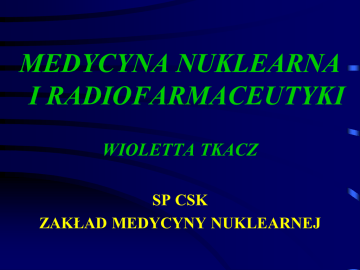 MEDYCYNA NUKLEARNA I RADIOFARMACEUTYKI WIOLETTA TKACZ SP CSK ZAKŁAD MEDYCYNY NUKLEARNEJ MEDYCYNA NUKLEARNA WYKORZYSTUJE PROMIENIOWANIE, KTÓREGO ŹRÓDŁEM SĄ PRZEMIANY ZACHODZĄCE W JĄDRACH ATOMÓW SUBSTANCJI PROMIENIOTWÓRCZYCH DEFINICJA RADIOFARMACEUTYKIEM NAZYWAMY ZWIĄZEK, KTÓRY ZAWIERA RADIOIZOTOP W SWOJEJ CZĄSTECZCE RADIOFARMACEUTYK RADIOIZOTOP LIGAND PROMIENIOTWÓRCZY ZWIĄZEK CHEMICZNY IZOTOP PEWNEGO BĘDĄCY NOŚNIKIEM PIERWIASTKA RADIOIZOTOPU RODZAJE PROMIENIOWANIA - promieniowanie - promieniowanie (β- i β+) - promieniowanie OCHRONA SCHEMAT BADANIA RADIOIZOTOPOWEGO RADIOFARMACEUTYK DOŻYLNE (NAJCZĘŚCIEJ) PODANIE KRÓTKO ŻYCIOWYCH RADIOFARMACEUTYKÓW SUBSTANCJE ULEGAJĄ ODPOWIEDNIEJ DYSTRYBUCJI W CIELE PACJENTA W WYZNACZONYM CZASIE DOKONUJE SIĘ ODCZYTU (AKWIZYCJI) OBRAZÓW ROZKŁADU RADIOIZOTOPU W TKANKACH. GAMMAKAMERA, KAMERA PET SPECT - WYKONANIE BADANIA Press key to load animation. Be patient ... APARAT PET RADIOFARMACEUTYKI STOSOWANE W BADANIACH PET 18FDG – 2-DEOKSY – FLUORO – D – GLUKOZA HO O HO HO 18F 18 F T1/2 = 109,8 min OH BADANIA PET W ONKOLOGII RAK PRZEŁYKU-FDG RADIOFARMACEUTYKI – WYMAGANIA TYP I ENERGIA EMITOWANEGO PROMIENIOWANIA ■ DOSTĘPNOŚĆ ■ POŁOWICZNY CZAS PÓŁTRWANIA EFEKTYWNEGO ■ AKTYWNOŚĆ BIOLOGICZNA ■ SWOISTOŚĆ WIĄZANIA ■ BEZPIECZEŃSTWO OTRZYMYWANIE RADIOIZOTOPÓW RADIONUKLIDY REAKTOROWE (51Cr, 99Mo, 59Fe, 131J) RADIONUKLIDY CYKLOTRONOWE (11C, 13N, 18F, 67Ga, 123J, 201Tl) RADIONUKLIDY GENERATOROWE (87mSr, 99mTc, 113mIn, 132J) MECHANIZMY GROMADZENIA RADIOFARMACEUTYKÓW TRANSPORT PRZEZ BŁONY ■TRANSPORT AKTYWNY (NP. POMPA Na/K) ■SWOBODNA DYFUZJA METABOLIZM MECHANIZM RECEPTOROWY ■POCHODNE SOMATOSTATYNY ■RECEPTORY DOPAMINERGICZNE ■RECEPTORY LDL ANTYGEN-PRZECIWCIAŁO FAGOCYTOZA Tl Ga, Tc - SESTAMIBI FDG, C/F - AMINOKWASY Tc - TEKTROTYD F - DOPA J - NORCHOLESTEROL Tc-PRZECIWCIAŁA Tc-KOLOID CHEMIA TECHNETU TECHNET (Tc) emituje promieniowanie γ 99mTc (OTRZYMYWANY Z 99Mo), t 1/2 = 6h, E = 140KeV STOPIEŃ UTLENIENIA +7 +6 +5 +4 +3 +2 +1 0 -1 JONOWE FORMY TECHNETU TcO4TcN3+ TcO3+, TcO2+, TcN2+ Tc4+, Tc(OH)22+ TcP33+, Tc3+ Tc2+ Tc+, TcP6+ Tc, Tc2 Tc- GENERATOR 99Mo – 99mTc SYNTEZA RADIOFARMACEUTYKÓW TcO4- TcO4czynnik redukujący (Sn2+) czynnik redukujący (Sn2+) TcxmLy mL- silnie koordynujący ligand TcxsŁy TcxmLy sŁ- słabo koordynujący ligand PRZYKŁADY ZASTOSOWANIA RADIOFARMACEUTYKÓW RADIOFARMACEUTYKI STOSOWANE W DIAGNOSTYCE IN VIVO RADIOFARMACEUTYKI ZNAKOWANE TECHNETEM SCYNTYGRAFIA MÓZGU WSKAZANIA DO WYKONANIA BADANIA • • • • udar mózgu poszukiwanie ognisk padaczkowych różnicowanie chorób otępiennych zawał mózgu w następstwie zatoru lub zakrzepu i określenie obszaru niedokrwienia • szacowanie stopnia uszkodzenia mózgu w wyniku urazu czaszkowo-mózgowego • potwierdzenie śmierci mózgowej RADIOFARMACEUTYKI OBRAZOWANIE PRZEPŁYWU KRWI W MÓZGU HEKSAMETYLOPROPYLENOAMINOOKSYM (HMPAO) SCYNTYGRAFIA MÓZGU ESRER DIETYLOWYETYLENODICYSTEINY (ECD) AKTYWNOŚĆ 740 MBq STOSOWANE ZNACZNIKI ŁATWO POKONUJĄ BARIERĘ KREW MÓZG PRZEDOSTAJĄC SIĘ Z NACZYŃ KRWIONOŚNYCH DO PŁYNU MÓZGOWO-RDZENIOWEGO 99mTc-HM-PAO H3C H 3C CH3 NH HN H 3C CH3 + H3C N N OH OH CH3 99m TcO 4- Sn2+ H3C N CH3 O N CH3 N N CH3 O O Tc H3C H BADANIE HM-PAO SPECT MÓZGU SCYNTYGRAFIA PERFUZYJNA MIĘŚNIA SEROWEGO WSKAZANIA DO WYKONANIA BADANIA choroba wieńcowa, kwalifikacja do operacji założenia bypass'u, martwica mięśnia sercowego, stan pozawałowy, kardiomiopatia. RADIOFARMACEUTYKI MIBI – METOKSYIZOBUTYLOIZONITRYL AKTYWNOŚĆ 600 MBq MYOVIEW – TETRAFOSMINA AKTYWNOŚĆ 500-610 MBq MIBI ZBUDOWANY Z CENTRALNIE POLOŻONEGO TECHNETU I 6 OTACZAJĄCYCH GO GRUP LIPOFILNYCH WSPOŁCZYNNIKI EKSTRAKCJI WYNOSI 55%. PO PODANIU W SERCU GROMADZI SIĘ OK. 2% PODANEJ DAWKI • MIBI DYFUNDUJE SWOBODNIE DO PRZESTRZENI WEWNĄTRZKOMÓRKOWEJ. JEGO DYFUZJA ZWROTNA JEST ZALEŻNA OD POTENCJAŁU ELEKTRYCZNEGO BŁON MITOCHONDRIALNYCH – IM WYŻSZY POZIOM PRZEMIAN METABOLICZNYCH, TYM WYŻSZE GROMADZENIE ZNACZNIKA. STOPIEŃ GROMADZENIA MIBI ZALEŻY OD PRZEPŁYWU KRWI SCYNTYGRAFIA PERFUZYJNA SERCA CHOROBA NIEDOKRWIENNA SERCA SCYNTYGRAFIA PERFUZYJNA SERCA SCYNTYGRAFIA UKŁADU ODDECHOWEGO RODZAJE SCYNTYGRAFII PŁUC Scyntygrafia płuc Scyntygrafia perfuzyjna Scyntygrafia wentylacyjna WSKAZANIA DO WYKONANIA BADANIA • PODEJRZENIE ZATOROWOŚCI PŁUCNEJ • OCENA SKUTECZNOŚCI LECZENIA ZAPALENIA PŁUC • CHOROBY NOWOTWOROWE – OCENA PRZEDOPERACYJNA • ZWŁÓKNIENIA – OCENA ROZLEGŁOŚCI ZMIAN • RÓŻNICOWANIE PIERWOTNE/WTÓRNE NADCIŚNIENIE PŁUCNE • NIEKTÓRE WADY – ZWĘŻENIE JEDNEJ Z T.PŁUCNYCH, HIPOPLAZJA RADIOFARMACEUTYKI BADANIE PRZEPŁYWU KRWI: MACRO – ALBUMON - MAKROALBUMINY SCYNTYGRAFIA PERFUZYJNA PŁUC AKTYWNOŚĆ 400 MBq BADANIE WENTYLACYJNE: ROZPYLONY DTPA – KW. DIETYLENOTRIAMINOPENTAOCTOWY AKTYWNOŚĆ 1400 MBq PRAWIDŁOWY OBRAZ PŁUC SC.WENTYLACYJNA SC. PERFUZYJNA ZATOROWOŚĆ PŁUCNA SCYNTYGRAFIA TARCZYCY WSKAZANIA DO WYKONANIA BADANIA • wole guzkowe • wole zamostkowe • kontrola po wykonanej operacji • podejrzenie ektopii tarczycy • podejrzenie autonomii tarczycy • wole odrostowe RADIOFARMACEUTYKI • Na99m TcO4 – NADTECHNECJAN SODU: T1/2 = 6,02h, ENERGIA PROMIENIOWANIA 140,5 KeV, RODZAJ PROMIENIOWANIA – GAMMA, RADIOIZOTOP GENERATOROWY • Na131I – JODEK SODU: T1/2 = 8,05 DNIA, ENERGIA PROMIENIOWANIA 364 KeV, RODZAJ PROMIENIOWANIA – GAMMA I BETA, RADIOIZOTOP REAKTOROWY RADIOFARMACEUTYKI SC. 99mTc • • • • • • • AKTYWNOŚĆ 1-2 mCi(37-74 MBq) DROGA PODANIA – I.V. CZAS OD PODANIA DAWKI DO WYKONANIA AKWIZYCJI 20 – 30 MIN. CZAS AKWIZYCJI ZLICZEŃ – 5 MIN. DIAGNOSTYKA RÓŻNICOWA PACJENTÓW Z NADCZYNNOŚCIĄ TARCZYCY OCENA CHARAKTERU GUZKA TARCZYCY OCENA WIELKOŚCI WOLA SC. 131J AKTYWNOŚĆ 80 - 150 µCi (24 MBq) DROGA PODANIA – P.O. CZAS OD PODANIA DAWKI DO WYKONANIA AKWIZYCJI 24h (EW. 6h) CZAS AKWIZYCJI ZLICZEŃ – 5 MIN. WOLE ZAMOSTKOWE EKTOPIA TKANKI TARCZYCOWEJ TEST JODOCHWYTNOŚ