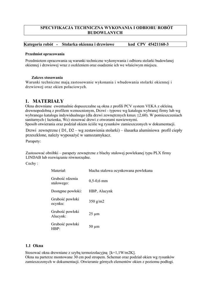 SPECYFIKACJA TECHNICZNA WYKONANIA I ODBIORU ROBÓT BUDOWLANYCH Kategoria robót - Stolarka okienna i drzwiowe kod CPV 45421160-3 Przedmiot opracowania Przedmiotem opracowania są warunki techniczne wykonywania i odbioru stolarki budowlanej okiennej i drzwiowej wraz z oszkleniem oraz osadzenie ich we właściwym miejscu. Zakres stosowania Warunki techniczne mają zastosowanie wykonania i wbudowania stolarki okiennej i drzwiowej oraz okien połaciowych. 1. MATERIAŁY Okna drewniane ewentualnie dopuszczalne są okna z profili PCV system VEKA z okleiną drewnopodobną z profilem wzmocnionym, Drzwi - typowe wg katalogu wybranej firmy lub wg wybranego katalogu indywidualnego (dla drzwi zewnętrznych kmax ≤2,60). W pomieszczeniach sanitarnych ( łazienka, Wc) stosować drzwi z otworami nawiewnymi. Sposób otwierania oraz podział okiem ściśle wg rysunków zamieszczonych w dokumentacji. Drzwi zewnętrzne ( D1, D2 – wg zestawienia stolarki) – ślusarka aluminiowa profil ciepły przeszklone, naleŜy wyposaŜyć w samozamykacz. Parapety: Zastosować obróbki – parapety zewnętrzne z blachy stalowej powlekanej typu PLX firmy LINDAB lub rozwiązanie równorzędne. Cechy : Materiał: blacha stalowa ocynkowana powlekana Grubość rdzenia stalowego: 0,5-0,6 mm Dostępne powłoki: HBP, Alucynk Grubość powłoki ocynku: 350 g/m2 Grubość powłoki Alucynk: 25 µm Grubość powłoki HBP: 50 µm 1.1 Okna Stosować okna drewniane z szybą termoizolacyjną [k=1,1W/m2K]. Okna na parterze montowane 30 cm pod stropem. Schemat oraz podział okien wg rysunków zamieszczonych w dokumentacji. Otwieranie górnych elementów okien z poziomu podłogi. NaleŜy zapewnić stosowanie okien wyposaŜonych w funkcję mikrowentylacji i spełniające wymagania wentylacji pomieszczeń oraz odpowiedni współczynnik infiltracji (w I, II, III strefie klimatycznej kmax dla okien ≤2,60). Nawiewniki w oknach zamocować w górnych ramach. Okna drewniane – kolor ramy - biały. W pomieszczeniach nie oświetlanych światłem dziennym oraz dla doświetlenia naleŜy zastosować naświetla ( wg zestawienia stolarki). W sanitariatach na piętrze budynku ( na poddaszu uŜytkowym) zastosowano okna połaciowe. 1.2 Okucia budowlane KaŜdy wyrób stolarki budowlanej powinien być wyposaŜony w okucia zamykające, łączące, zabezpieczające i uchwytowo-osłonowe. Okucia powinny odpowiadać wymaganiom norm państwowych, a w przypadku braku ta kich norm - wymaganiom określonym w świadectwie ITB dopuszczającym do stosowania wyroby stolarki budowlanej wyposaŜone w okucie, na które nie została ustanowiona norma. Okucia stalowe powinny być zabezpieczone fabrycznie trwałymi powłokami antykorozyjnymi. Okucia nie zabezpieczone naleŜy, przed ich zamocowaniem, pokryć minią ołowianą lub farbą ftalową, przeciwrdzewną. 1.3 OścieŜnice stalowe i drewniane Dla drzwi wewnętrznych przewidziano ościeŜnice metalowe o szerokości uzaleŜnionej od typu drzwi. Dla drzwi wejściowych zewnętrznych istniejąca ościeŜnica drewniana. OścieŜnice uszczelnić pianką poliuretanową. 2. SPRZĘT 2.1 Sprzęt do wykonywania robót Wykonawca jest zobowiązany do uŜywania takich narzędzi, które nie spowodują niekorzystnego wpływu na jakość materiałów i wykonywanych robót oraz będą przyjazne dla środowiska. 3. TRANSPORT 3.1 Transport materiałów Do transportu materiałów stosować następujące sprawne technicznie środki transportu: -samochód dostawczy o ładowności 0,9 ton. 4. WYKONANIE ROBÓT 4.1 Wbudowywanie stolarki okiennej Stolarka okienna jest osadzana w ościeŜu bez węgarków. Przed osadzeniem okien naleŜy sprawdzić dokładność wykonania ościeŜa, do których ma przylegać ościeŜnica, w przypadku występujących wad w wykonaniu ościeŜa lub zabrudzenia powierzchni ościeŜa, ościeŜe naleŜy naprawić i oczyścić. Dopuszczalne odchyłki wymiarów otworów okiennych dla róŜnych ścian podano w tabeli. Dopuszczalne odchyłki od wymiarów otworów dla stolarki okiennej w ścianach zewnętrznych Odchyłki, mm Dopuszczal- Rodzaj ściany i sposób wykonania ościeŜa Ściany murowane, wyprawa tynkowa na róŜnica długości szerokość wysokość przekątnych, mm + 10 + 10 10 4.2 Osadzanie i uszczelnianie stolarki okiennej w ościeŜu W sprawdzone i przygotowane ościeŜe, tj. o naprawionych uszkodzeniach i nierównościach oraz oczyszczonych z pyłu powierzchniach, naleŜy wstawić stolarkę okienną na pod kładkach lub listwach. W zaleŜności od rodzaju łączników zastosowanych do zamocowania stolarki naleŜy osadzić w sposób trwały ich elementy kotwiące w ościeŜach. W ościeŜach bez węgarków uszczelnienie styku z oknem, przed przenikaniem wody i powietrza, moŜe być dokonane następującymi sposobami: •w trakcie osadzania okna - ułoŜyć na powierzchni ościeŜy warstwę kitu trwale plastycznego i docisnąć ościeŜnicę do węgarka, •uszczelnienie pianką montaŜową po osadzeniu ościeŜnicy okiem. Ustawienie okna naleŜy sprawdzić w pionie i poziomie oraz dokonać pomiaru przekątnych. Dopuszczalne odchylenie od pionu i poziomu nie powinno być większe niŜ 2 mm na 1 m wysokości okna, jednak nie więcej niŜ 3 mm na całej długości elementów ościeŜnicy. Odchylenie ościeŜnicy od płaszczyzny pionowej nie moŜe być większe niŜ 2 mm. RóŜnice wymiarów przekątnych nie powinny być większe niŜ 2 mm przy długości przekątnej do 1 m, 3 mm – do 2 m, 4 mm - powyŜej 2 m długości przekątnej. Po ustawieniu okna lub drzwi naleŜy sprawdzić sprawność działania skrzydeł przy otwieraniu i zamykaniu. Skrzydła powinny rozwierać się swobodnie, a okucia działać bez zahamowań i przy zamykaniu dociskać skrzydła do ościeŜnicy. Zamocowania ościeŜnic naleŜy dokonać za pomocą łączników typu zaczepów, gwintowanyc haków do ościeŜnic, wkrętów wkręcanych do drewnianych klocków w ościeŜu kotew Z, tulei rozpieranych itp. Mocowanie ościeŜnic za pomocą gwo