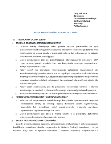 Załącznik nr 6 do Statutu Zachodniopomorskiego Centrum Edukacji Morskiej i Politechnicznej REGULAMIN UCZNIÓW I SŁUCHACZY ZCEMiP A. 1. REGULAMIN UCZNIA ZCEMiP TROSKA O ZDROWIE I BEZPIECZEŃSTWO UCZNIA 1. Uczniów szkoły obowiązuje zakaz palenia tytoniu, papierosów (w tym elektronicznych) i bezwzględny zakaz picia alkoholu w szkole i na jej terenie oraz przebywanie na terenie szkoły w stanie nietrzeźwym lub wskazującym na zażycie jakichkolwiek środków odurzających. 2. Uczeń zobowiązany jest do przestrzegania obowiązujących przepisów BHP i ppoż. podczas pobytu w szkole i w czasie korzystania z maszyn, urządzeń oraz innego wyposażenia szkoły. 3. Każdy uczeń ma obowiązek niezwłocznego zgłaszania nauczycielowi lub instruktorowi zajęć pozalekcyjnych, a w szczególnych przypadkach także każdemu innemu pracownikowi szkoły, wszystkich zauważonych przypadków niesprawnych urządzeń, sprzętu, instalacji elektrycznej itp. mogących stanowić zagrożenie dla zdrowia lub życia. 4. Każdy uczeń zobowiązany jest do posiadania stosownego ubrania i obuwia sportowego na zajęciach wychowania fizycznego oraz na zajęciach praktycznych. 5. 2. Każdy uczeń zobowiązany jest do wykonywania obowiązkowych badań lekarskich. KORZYSTANIE Z POMIESZCZEŃ I WYPOSAŻENIA SZKOŁY 1. Każdy uczeń ma prawo do nieodpłatnego korzystania z pomieszczeń, urządzeń i wyposażenia szkoły za wiedzą i zgodą dyrektora szkoły, wychowawcy, nauczyciela lub instruktora zajęć pozalekcyjnych, w sposób określony odpowiednimi regulaminami np. pracowni. 2. Uczeń zobowiązany jest dbać o mienie szkoły, a w przypadku dokonania zniszczenia, do pokrycia równowartości szkody. 3. ZASADY PRZEPROWADZANIA EGZAMINÓW Zasady przeprowadzania egzaminu gimnazjalnego, maturalnego i potwierdzającego kwalifikacje zawodowe określa rozporządzenie Ministra Edukacji Narodowej z dn. 30 kwietnia 2007 roku w sprawie warunków i sposobu oceniania, klasyfikowania i promowania uczniów i słuchaczy oraz przeprowadzania sprawdzianów i egzaminów w szkołach publicznych (Dz. U. Nr 83, poz. 562) z późn. zmianami i Wewnątrzszkolny System Oceniania opracowany w oparciu o ww. rozporządzenie. 4. PRAWA I OBOWIĄZKI UCZNIÓW 1. Uczeń ma prawo: a. wymagać przestrzegania wobec niego Konwencji o Prawach Dziecka z dnia 20 listopada 1989 roku (Dz.U. z 1991 r., Nr 120, poz. 526; z 2000 roku, Nr 2, poz. 11); b. przejawiać własną aktywność w zdobywaniu wiedzy i umiejętności i wykorzystywać w tym celu wszystkie możliwości szkoły; c. zgłaszać opiekunowi klasy i innym nauczycielom swoje problemy oraz oczekiwać pomocy ze strony nauczyciela w przypadku natrafienia na trudności; d. do jawnej, rzetelnej i sprawiedliwiej oceny zachowania i postępów w nauce; e. uczestniczyć w zajęciach pozalekcyjnych i pozaszkolnych organizowanych przez szkołę; f. reprezentować szkołę w konkursach, przeglądach, zawodach i innych imprezach, zgodnie ze swoimi możliwościami, umiejętnościami i zainteresowaniami; g. do rzetelnych informacji o programach i treściach nauczania z poszczególnych przedmiotów; h. do informacji o obowiązujących podręcznikach; i. do nieprzygotowania się do zajęć edukacyjnych, zgodnie z zasadami określonymi w przedmiotowych systemach oceniania; j. do odpoczynku w czasie przerw międzylekcyjnych; k. do odpoczynku w okresie przerw świątecznych i ferii, w związku z czym nauczyciele nie powinni zadawać na ten okres prac domowych; l. do pomocy materialnej i socjalnej na zasadach określonych w oddzielnym regulaminie; m. do informacji o kryteriach i zasadach oceniania z poszczególnych przedmiotów; n. do powiadomienia, w terminie określonym w Wewnątrzszkolnym Systemie Oceniania, o terminie i zakresie pisemnych sprawdzianów wiadomości (w ciągu dnia może odbyć się tylko jeden sprawdzian, a w ciągu tygodnia nie więcej niż trzy); o. do ubezpieczenia od następstw nieszczęśliwych wypadków; p. do udziału w wycieczkach i obozach integracyjnych organizowanych przez szkołę; q. do udziału w życiu szkoły na zasadzie partnerstwa i współodpowiedzialności za funkcjonowanie szkoły. 2. Uczeń ma obowiązek: a. nauki do 18. roku życia. W przypadku nagminnego opuszczania przez ucznia zajęć edukacyjnych, Dyrektor ZCEMIP zobowiązuje rodziców (prawnych opiekunów) do regularnego posyłania dziecka do szkoły, informując o ustawowych konsekwencjach. W przypadku dalszego uchylania się od realizowania obowiązku nauki organ prowadzący nakłada grzywnę (zgodnie z art. 119 ustawy z dnia 17 czerwca 1966 o postępowaniu egzekucyjnym w administracji/ Dz. U. z 2005 roku Nr 229, poz. 1954) w celu przymuszenia rodziców (prawnych opiekunów ucznia); b. podporządkowywania się zarządzeniom i postanowieniom wydanym przez Dyrekcję Szkoły, Radę Pedagogiczną oraz Samorząd Szkolny; c. wykorzystywać czas przeznaczony na naukę do rzetelnej pracy nad poszerzaniem swojej wiedzy i umiejętności; d. postępować tak, by dbać o dobro szkoły i społeczności uczniowskiej oraz o honor i tradycje szkoły; e. systematycznie uczęszczać na wszystkie zajęcia f. w trakcie zajęć i przerw przebywać na terenie szkoły. g. przestrzegać godzin przyjścia do szkoły i wyjścia ze szkoły określonych w obowiązującym planie lekcji dla danej klasy lub wyznaczonych w planie zastępstw; h. zgłosić wychowawcy, dyrektorowi lub nauczycielowi danego przedmiotu zwolnienie z zajęć i posiadać pisemne zwolnienie rodziców, w którym podano przyczynę zwolnienia oraz dzień i godzinę wyjścia ze szkoły. W przypadku ucznia pełnoletniego zwolnienie z danej lekcji następuje na pisemny wniosek zainteresowanego do z-ców dyrektora ZCEMIP ds. kształcenia ogólnego, morskiego lub OKP wychowawcy klasy lub nauczyciela danego przedmiotu, zawierający powód zwolnienia oraz dzień i godzinę wyjścia ze szkoły; i. posiadać przybory szkolne, podręczniki i pomoce dydaktyczne niezbędne na zajęciach l