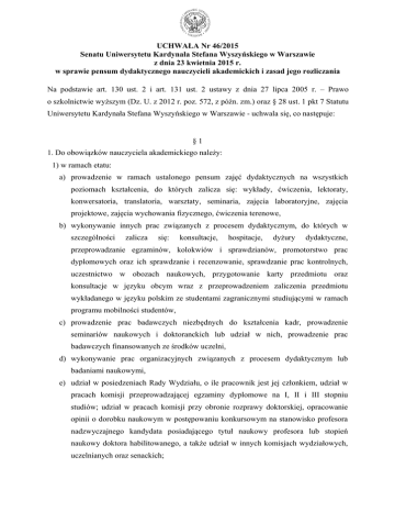 UCHWAŁA Nr 46/2015 Senatu Uniwersytetu Kardynała Stefana Wyszyńskiego w Warszawie z dnia 23 kwietnia 2015 r. w sprawie pensum dydaktycznego nauczycieli akademickich i zasad jego rozliczania Na podstawie art. 130 ust. 2 i art. 131 ust. 2 ustawy z dnia 27 lipca 2005 r. – Prawo o szkolnictwie wyższym (Dz. U. z 2012 r. poz. 572, z późn. zm.) oraz § 28 ust. 1 pkt 7 Statutu Uniwersytetu Kardynała Stefana Wyszyńskiego w Warszawie - uchwala się, co następuje: §1 1. Do obowiązków nauczyciela akademickiego należy: 1) w ramach etatu: a) prowadzenie w ramach ustalonego pensum zajęć dydaktycznych na wszystkich poziomach kształcenia, do których zalicza się: wykłady, ćwiczenia, lektoraty, konwersatoria, translatoria, warsztaty, seminaria, zajęcia laboratoryjne, zajęcia projektowe, zajęcia wychowania fizycznego, ćwiczenia terenowe, b) wykonywanie innych prac związanych z procesem dydaktycznym, do których w szczególności zalicza się: konsultacje, hospitacje, dyżury dydaktyczne, przeprowadzanie egzaminów, kolokwiów i sprawdzianów, promotorstwo prac dyplomowych oraz ich sprawdzanie i recenzowanie, sprawdzanie prac kontrolnych, uczestnictwo w obozach naukowych, przygotowanie karty przedmiotu oraz konsultacje w języku obcym wraz z przeprowadzeniem zaliczenia przedmiotu wykładanego w języku polskim ze studentami zagranicznymi studiującymi w ramach programu mobilności studentów, c) prowadzenie prac badawczych niezbędnych do kształcenia kadr, prowadzenie seminariów naukowych i doktoranckich lub udział w nich, prowadzenie prac badawczych finansowanych ze środków uczelni, d) wykonywanie prac organizacyjnych związanych z procesem dydaktycznym lub badaniami naukowymi, e) udział w posiedzeniach Rady Wydziału, o ile pracownik jest jej członkiem, udział w pracach komisji przeprowadzającej egzaminy dyplomowe na I, II i III stopniu studiów; udział w pracach komisji przy obronie rozprawy doktorskiej, opracowanie opinii o dorobku naukowym w postępowaniu konkursowym na stanowisko profesora nadzwyczajnego kandydata posiadającego tytuł naukowy profesora lub stopień naukowy doktora habilitowanego, a także udział w innych komisjach wydziałowych, uczelnianych oraz senackich; 2) za dodatkowym wynagrodzeniem według odrębnych przepisów: a) udział w pracach związanych z postępowaniem rekrutacyjnym, b) promotorstwo i recenzowanie rozpraw doktorskich i habilitacyjnych oraz oceny dorobku naukowego związane z postępowaniami habilitacyjnymi, opracowanie ocen całokształtu dorobku naukowo-badawczego, artystycznego lub dydaktyczno- wychowawczego kandydatów do tytułu naukowego, a także recenzji lub oceny dorobku w postępowaniu kwalifikacyjnym poprzedzającym zatrudnienie na stanowisku profesora nadzwyczajnego lub profesora wizytującego osoby nieposiadającej tytułu naukowego profesora lub stopnia naukowego doktora habilitowanego. 2. Do obowiązków pracowników dydaktycznych (starsi wykładowcy, wykładowcy, lektorzy, instruktorzy) nie wlicza się prac wymienionych w ust. 1 pkt 1 lit. c. §2 1. Godziny pracy przeznaczone na realizację zadań wymienionych w § 1 ust. 1 pkt 1 lit. a, składają się na pensum dydaktyczne nauczyciela akademickiego. Minimalny wymiar pensum w roku akademickim, z zastrzeżeniem dalszych postanowień uchwały, wynosi: 1) pracownicy naukowo-dydaktyczni: a) posiadający tytuł naukowy profesora - 180 godz., b) posiadający stopień naukowy doktora habilitowanego - 210 godz., c) zatrudnieni na stanowisku profesora wizytującego - 180 godz., d) zatrudnieni na stanowisku adiunkta, nieposiadający stopnia naukowego doktora habilitowanego - 240 godz., e) zatrudnieni na stanowisku asystenta - 240 godz.; 2) pracownicy dydaktyczni zatrudnieni na stanowiskach: a) starszego wykładowcy 360 godz., b) wykładowcy 360 godz., c) lektora, instruktora 540 godz. 2. Wymiar pensum ulega obniżeniu proporcjonalnie do wymiaru etatu określonego w dokumencie kształtującym treść stosunku pracy. 3. W przypadku, gdy w trakcie roku akademickiego nastąpi zmiana stanowiska pracy nauczyciela akademickiego, która powoduje zmniejszenie minimalnego rocznego wymiaru pensum dydaktycznego ustalonego przez senat uczelni, dziekan o utrzymaniu dotychczasowego minimalnego rocznego może zadecydować wymiaru dotychczasowego stanowiska pracy do końca danego roku akademickiego. pensum dla 4. W przypadku, o którym mowa w ust. 3 praca w wymiarze godzinowym mieszczącym się w ramach rocznego minimalnego wymiaru pensum dydaktycznego ustalonego przez senat uczelni dla dotychczas zajmowanego stanowiska pracy, bez przekroczenia maksymalnego ustawowego rocznego wymiaru zajęć dydaktycznych dla tego stanowiska, nie jest uważana za pracę w godzinach ponadwymiarowych. §3 1. Nauczyciel akademicki pełniący funkcję Rektora jest całkowicie zwolniony z obowiązku prowadzenia zajęć dydaktycznych; pełniącemu funkcję Prorektora lub Dziekana, obniża się wymiar pensum do wysokości 120 godzin rocznie, a pełniącemu funkcje Prodziekana do 150 godzin rocznie. 2. Rektor może obniżyć wymiar zajęć dydaktycznych poniżej dolnej granicy wymiaru ustalonej w § 2, w przypadku powierzenia nauczycielowi akademickiemu ważnych zadań lub realizowania przez nauczyciela akademickiego projektów badawczych lub innych zadań przewidzianych w statucie. 3. Rektor może zwolnić całkowicie lub częściowo z obowiązków dydaktycznych nauczyciela akademickiego - na jego wniosek - pełniącego funkcje członka Polskiej Komisji Akredytacyjnej lub Rady Głównej Nauki i Szkolnictwa Wyższego. 4. Nauczyciel akademicki może korzystać z obniżenia ustalonego pensum rocznego tylko z jednego tytułu, poza przypadkami określonymi w § 10. 5. Zniżki wymiaru pensum dydaktycznego przysługują wyłącznie pracownikom zatrudnionym w pełnym wymiarze czasu pracy. 6. Wniosek o obniżenie pensum (po zaopiniowaniu przez dziekana), w przypadkach określonych w ust. 2-3, składa się do prorektora wła