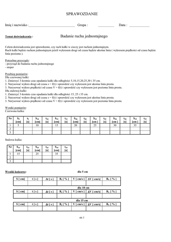 SPRAWOZDANIE Imię i nazwisko :________________________________ Grupa : ___________ Data : ______________ Badanie ruchu jednostajnego. Temat doświadczenia : Celem doświadczenia jest sprawdzenie, czy ruch kulki w cieczy jest ruchem jednostajnym. Ruch kulki będzie ruchem jednostajnym jeżeli wykresem drogi od czasu będzie ukośna linia ( wykresem prędkości od czasu będzie linia pozioma ). Potrzebne przyrządy: - przyrząd do badania ruchu jednostajnego - stoper Przebieg pomiarów: Dla czerwonej kulki: 1. Zmierzyć 3-krotnie czas opadania kulki dla odległości 5,10,15,20,25,30 i 35 cm. 2. Narysować wykres drogi od czasu s = f(t) i sprawdzić czy wykresem jest ukośna linia prosta. 3. Narysować wykres prędkości od czasu V = f(t) i sprawdzić czy wykresem jest pozioma linia prosta. Dla stalowej kulki: 1. Zmierzyć 3-krotnie czas opadania kulki dla odległości 15, 25 i 35 cm. 2. Narysować wykres drogi od czasu s = f(t) i sprawdzić czy wykresem jest ukośna linia prosta. 3. Narysować wykres prędkości od czasu V = f(t) i sprawdzić czy wykresem jest pozioma linia prosta. Wyniki pomiarów: Czerwona kulka: Nr 1 2 3 S5 [cm] 5 t5 [s] S10 [cm] 10 t10 [s] S15 [cm] 15 t15 [s] t15 [s] S25 [cm] 25 t25 [s] S35 [cm] 35 t35 [s] S20 [cm] 20 S25 [cm ] 25 t20 [s] t25 [s] S30 [cm ] 30 Stalowa kulka: Nr 1 2 3 S15 [cm] 15 Wyniki końcowe: dla 5 cm S [ cm] t[s] ∆t [ s ] Bt [ % ] V [ cm/s ] ∆V [ cm/s] BV [ % ] S [ cm] t[s] ∆t [ s ] Bt [ % ] dla 10 cm V [ cm/s ] ∆V [ cm/s] BV [ % ] S [ cm] t[s] ∆t [ s ] Bt [ % ] dla 15 cm V [ cm/s ] ∆V [ cm/s] BV [ % ] str.1 t30 [s] S35 [cm ] 35 t35 [s] S [ cm] t[s] ∆t [ s ] Bt [ % ] dla 20 cm V [ cm/s ] ∆V [ cm/s] BV [ % ] S [ cm] t[s] ∆t [ s ] Bt [ % ] dla 25 cm V [ cm/s ] ∆V [ cm/s] BV [ % ] S [ cm] t[s] ∆t [ s ] Bt [ % ] dla 30 cm V [ cm/s ] ∆V [ cm/s] BV [ % ] S [ cm] t[s] ∆t [ s ] Bt [ % ] dla 35 cm V [ cm/s ] ∆V [ cm/s] BV [ % ] Kulka czerwona VRZ = 7 [ cm/s ] - wartość rzeczywista prędkości podana przez prowadzącego ćwiczenie = _______________ [ cm/s ] VŚR = _______________ [ cm/s ] ∆VŚR Kryterium zgodności wyników: ( *podstaw odpowiednie dane ) V −V ŚR ≤ ∆VŚR RZ czyli ≤ Wynik doświadczenia _______________________ ( zgodny / niezgodny ) z wynikiem rzeczywistym. Kryterium poprawności doświadczenia: ( *podstaw odpowiednie dane ) V RZ −V ŚR V RZ ≤ ∆V ŚR V czyli ≤ ŚR Doświadczenie przeprowadzono _________________________ ( poprawnie / niepoprawnie ). s [ cm ] Wykres drogi od czasu t[s] * skalę na osi czasu dobierz i narysuj sam, zaznacz prostokąty błędów ( mogą być bardzo małe ) str.2 Wykres prędkości od czasu. V [ cm/s ] t[s] Kulka _________________________ ( poruszała się / nie poruszała się ) ruchem jednostajnym. Wyniki końcowe: dla 15 cm S [ cm] S [ cm] S [ cm] t[s] ∆t [ s ] t[s] ∆t [ s ] t[s] ∆t [ s ] Bt [ % ] V [ cm/s ] ∆V [ cm/s] BV [ % ] Bt [ % ] dla 25 cm V [ cm/s ] ∆V [ cm/s] BV [ % ] Bt [ % ] dla 35 cm V [ cm/s ] ∆V [ cm/s] BV [ % ] Kulka stalowa VRZ = 36 [ cm/s ] - wartość rzeczywista prędkości podana przez prowadzącego ćwiczenie VŚR = _______________ [ cm/s ] ∆VŚR = _______________ [ cm/s ] Kryterium zgodności wyników: ( *podstaw odpowiednie dane ) V −V ŚR ≤ ∆VŚR RZ czyli ≤ Wynik doświadczenia _______________________ ( zgodny / niezgodny ) z wynikiem rzeczywistym. Kryterium poprawności doświadczenia: ( *podstaw odpowiednie dane ) V RZ −V ŚR V RZ ≤ ∆V ŚR V czyli ≤ ŚR Doświadczenie przeprowadzono _________________________ ( poprawnie / niepoprawnie ). str.3 s [ cm ] Wykres drogi od czasu t[s] * skalę na osi czasu dobierz i narysuj sam, zaznacz prostokąty błędów ( mogą być bardzo małe ) V [ cm/s ] Wykres prędkości od czasu. t[s] Kulka _________________________ ( poruszała się / nie poruszała się ) ruchem jednostajnym. Dyskusja błędów: str.4