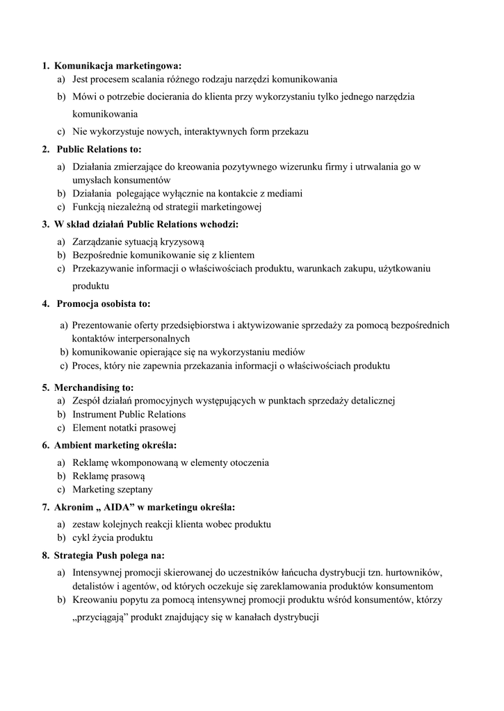 1. Komunikacja marketingowa: a) Jest procesem scalania różnego rodzaju narzędzi komunikowania b) Mówi o potrzebie docierania do klienta przy wykorzystaniu tylko jednego narzędzia komunikowania c) Nie wykorzystuje nowych, interaktywnych form przekazu 2. Public Relations to: a) Działania zmierzające do kreowania pozytywnego wizerunku firmy i utrwalania go w umysłach konsumentów b) Działania polegające wyłącznie na kontakcie z mediami c) Funkcją niezależną od strategii marketingowej 3. W skład działań Public Relations wchodzi: a) Zarządzanie sytuacją kryzysową b) Bezpośrednie komunikowanie się z klientem c) Przekazywanie informacji o właściwościach produktu, warunkach zakupu, użytkowaniu produktu 4. Promocja osobista to: a) Prezentowanie oferty przedsiębiorstwa i aktywizowanie sprzedaży za pomocą bezpośrednich kontaktów interpersonalnych b) komunikowanie opierające się na wykorzystaniu mediów c) Proces, który nie zapewnia przekazania informacji o właściwościach produktu 5. Merchandising to: a) Zespół działań promocyjnych występujących w punktach sprzedaży detalicznej b) Instrument Public Relations c) Element notatki prasowej 6. Ambient marketing określa: a) Reklamę wkomponowaną w elementy otoczenia b) Reklamę prasową c) Marketing szeptany 7. Akronim „ AIDA” w marketingu określa: a) zestaw kolejnych reakcji klienta wobec produktu b) cykl życia produktu 8. Strategia Push polega na: a) Intensywnej promocji skierowanej do uczestników łańcucha dystrybucji tzn. hurtowników, detalistów i agentów, od których oczekuje się zareklamowania produktów konsumentom b) Kreowaniu popytu za pomocą intensywnej promocji produktu wśród konsumentów, którzy „przyciągają” produkt znajdujący się w kanałach dystrybucji 9. Najważniejszy instrument Strategii Pull to: a) reklama masowa b) sprzedaż osobista c) promocja sprzedaży 10. Jednostka budżetowa to : a) podmiot dla którego sporządzane są budżety b) podstawowy budżet tworzony dla centrum kosztowego c) jednostka miary, w której są planowane koszty w budżetach 11. Rachunek kosztów zmiennych sygnalizuje ewentualne zmiany popytu przy stałej cenie sprzedaży: a) szybciej niż rachunek kosztów pełnych b) wolniej niż rachunek kosztów pełnych c) w takim samym stopniu jak rachunek kosztów pełnych 12. Które z poniższych twierdzeń jest prawdziwe; całkowity koszt stały: a) pozostaje bez zmian mimo wzrostu wielkości produkcji b) maleje wraz ze wzrostem wielkości produkcji c) rośnie wraz ze wzrostem wielkości produkcji 13. Marża brutto w rachunku kosztów zmiennych stanowi: a) różnicę między przychodami ze sprzedaży produktów a kosztami zmiennymi sprzedanych produktów b) różnicę między przychodami ze sprzedaży produktów a kosztami zmiennymi wytworzonych produktów c) różnicę miedzy przychodami ze sprzedaży produktów a kosztami zmiennymi i stałymi sprzedanych produktów 14. Próg rentowności to punkt, w którym: a) marża brutto pokrywa koszty stałe b) marża brutto pokrywa zysk c) rentowność wyrobów jest najwyższa 15. Jednostkowy koszt stały: a) maleje wraz ze wzrostem produkcji b) rośnie wraz ze wzrostem produkcji c) pozostaje na stałym poziomie mimo wzrostu produkcji 16. Osoby fizyczne i spółki cywilne osób fizycznych prowadzące działalność gospodarczą, których przychody netto ze sprzedaży towarów, produktów i operacji finansowych za poprzedni rok obrotowy były wyższe od równowartości w walucie polskiej 1 200 000 Euro /€/ prowadzą obligatoryjnie: a) księgi rachunkowe /handlowe/ b) podatkową księgę przychodów i rozchodów c) księgę ewidencji przychodów 17. Wysokość podatku przy karcie podatkowej zależy od: a) liczby zatrudnionych osób, rodzaju i miejsca prowadzonej działalności b) osiągniętego przychodu, rodzaju prowadzonej działalności c) osiągniętego przychodu, kosztów uzyskania przychodu 18. Podstawą opodatkowania przy podatku od towarów i usług VAT jest obrót, który stanowi: a) kwota należna z tytułu sprzedaży pomniejszona o kwotę należnego podatku b) kwota należna z tytułu sprzedaży powiększona o kwotę należnego podatku c) kwota należna z tytułu sprzedaży pomniejszona o koszty uzyskania 19. Sprawozdanie finansowe jednostki obejmuje: a) bilans i rachunek zysków i strat oraz informację dodatkową b) dla wszystkich jednostek obowiązujący jest bilans , pozostałe elementy zależą od kierownika jednostki c) rachunek zysków i strat oraz rachunek przepływów pieniężnych w odniesieniu do wszystkich jednostek gospodarczych 20. Towar jest to: a) Dobro przeznaczone na wymianę b) Dobro zaspokajające potrzeby ludzkie c) Produkt zakładu przemysłowego w postaci materialnej 21. Co to jest amortyzacja? a) Wartość zużytych środków trwałych b) Fundusz do wykorzystania w sytuacjach zagrożenia finansowego firmy c) Dotacja budżetowa do kosztów własnych zamawianych przez instytucje państwowe produktów 22. Najważniejszym organem zarządzającym spółką akcyjną jest : a) Walne zgromadzenie b) Zarząd c) Kolegium decyzyjne w skład, którego wchodzi prezes i rada nadzorcza 23. Treścią prawa popytu jest: a) zależność funkcyjna między ceną a wielkością popytu b) zależność między popytem a podażą c) stwierdzenie, iż popyt jest tym większy, im większe jest zapotrzebowanie na dane dobro 24. Elastyczność cenowa popytu to: a) Relacja względnego przyrostu popytu do względnego przyrostu ceny b) Stosunek ceny do popytu c) Wielkość popytu po przekroczeniu, której opłaca się obniżać cenę towaru 25. Prawo Engela wskazuje iż: a) przy wzroście dochodów maleje udział wydatków na dobra żywnościowe w wydatkach ogółem b) przy wzroście dochodów wzrasta stopa życiowa ludności c) Przy wzroście dochodów rośnie udział wydatków na żywność w wydatkach ogółem 26. Płaca realna to a) Ilość towarów, którą można zakupić za płacę nominalną b) 
