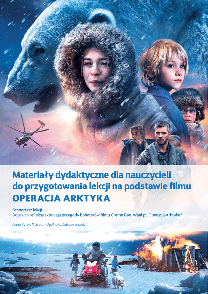 Materiały dydaktyczne dla nauczycieli do przygotowania lekcji na podstawie filmu OPERACJA ARKTYKA Scenariusz lekcji: Do jakich refleksji skłaniają przygody bohaterów filmu Grethe Bøe-Waal pt. Operacja Arktyka? Anna Ryłek, II Liceum Ogólnokształcące w Łodzi Anna Ryłek, II Liceum Ogólnokształcące w Łodzi Do jakich refleksji skłaniają przygody bohaterów filmu Grethe Bøe-Waal pt. Operacja Arktyka? ADRESAT dzieci ostatnich klas szkoły podstawowej, młodzież gimnazjum. RODZAJ ZAJĘĆ przyroda, zajęcia z ochrony środowiska, godzina wychowawcza, język polski, koło filmoznawcze. (Parz: Uwagi do realizacji). CEL OGÓLNY Doskonalenie umiejętności świadomego odbioru tekstów kultury (filmu) w kontekście ważnych problemów współczesności (globalnego ocieplenia). CELE SZCZEGÓŁOWE Uczeń: • nazywa swoje wrażenia i emocje po obejrzeniu filmu; • formułuje problemy zawarte w filmie; • charakteryzuje głównych bohaterów; • relacjonuje kluczowe wydarzenia; • opisuje krajobrazy, miejsca, zwierzęta i ich życie; • wskazuje przyczyny i skutki globalnego ocieplenia; • określa przesłanie filmu.; • pracuje w grupie; • formułuje wnioski i oceny, prezentuje je na forum klasy. METODY PRACY pogadanka, dyskusja, burza mózgów. FORMY PRACY praca w grupach i całym zespołem klasowym ŚRODKI DYDAKTYCZNE I MATERIAŁY Film Grethe Boe- Wall pt. „Operacja Arktyka”, atlas lub mapa rejonów Norwegii i Arktyki, materiał filmowy: „Globalne ocieplenie [NEWS] Wyborcza.pl”1, dostęp do Internetu. SŁOWA KLUCZOWE globalne ocieplenie, ochrona środowiska, przyjaźń, pasja, odpowiedzialność, opanowanie, hart ducha, ciekawość świata. 1. Dostępny w: https://www.youtube.com/results?search_query=globalne+ocieplenie 1 UWAGI DO REALIZACJI Film może być wykorzystany zarówno na lekcjach przyrody, zajęciach z zakresu ochrony środowiska, godzinie wychowawczej czy języku polskim lub kole filmowym. Zaproponowane w scenariuszu rozwiązania i treści można dowolnie modyfikować, dostosowując je do poziomu klasy, zainteresowań dzieci/młodzieży, potrzeb wynikających z podstawy programowej. Zamieszczone przykładowe odpowiedzi (zaznaczone kursywą) są wyłącznie propozycją autorki tego scenariusza. Przed planowaną lekcją nauczyciel prosi uczniów o obejrzenie krótkiego materiału dotyczącego globalnego ocieplenia: „Globalne ocieplenie [NEWS] Wyborcza.pl”. 1. Nauczyciel rozpoczyna pogadankę na temat pierwszych wrażeń dotyczących filmu. Uczniowie spontanicznie nazywają swoje uczucia i spostrzeżenia i uzasadniają swoje opinie. Np.: pouczający, bo pokazuje jak poradzić sobie w trudnych warunkach, opowiada o życiu w odległych rejonach Arktyki…; wzruszający, bo ujawnia wzajemną miłość i solidarność rodzeństwa, pokazuje walkę rodziców o znalezienie dzieci….; trzymający w napięciu - bo zawiera sceny dramatyczne, sytuacje niebezpieczne, z którymi bohaterowie muszą sobie poradzić….; ciekawy, bo pokazuje krajobrazy Arktyki, życie dzikich zwierząt, warunki klimatyczne …., inne. 2. Nauczyciel prosi uczniów o określenia problemów, jakie poruszone są w filmie. Mogą przygotować się do odpowiedzi w mniejszych grupach i swoje pomysły zapisywać na kartkach ( burza mózgów). Każdy problem na innej. Propozycje prezentowane są na forum klasy. Uczniowie przyklejają kartki na dużym arkuszu lub zapisują na tablicy. Inne grupy uzupełniają „listę”. Np.: „Operacja Arktyka” to film o: Arktyce i jej surowym klimacie; o życiu zamieszkujących ją zwierząt; o wpływie globalnego ocieplenia na klimat; o skutkach globalnego ocieplenia wpływających na zachowania zwierząt; o badaniach naukowych prowadzonych na Arktyce; o przygodach rodzeństwa, które przypadkiem znalazło się na Wyspie Półksiężyca w odległym archipelagu Svalbard; o akcji poszukiwawczej prowadzonej w ekstremalnych warunkach; o umiejętnościach, wiedzy i odwadze, cechach charakteru, które mogą uratować życie… inne. 3. Nauczyciel określa cele lekcji. Powinny być one sformułowane jasno i zrozumiale dla dzieci/młodzieży. Cele są zapisane w widocznym miejscu lub przekazane uczniom na oddzielnych kartkach. Np.: • Sformułujemy problemy poruszane w filmie; • Scharakteryzujemy głównych bohaterów; • Wskażemy kluczowe sytuacje filmu/momenty zwrotne budujące napięcie; • Opiszemy krajobraz Arktyki i żyjące na niej zwierzęta; • Wskażemy skutki globalnego ocieplenia; • Określimy przesłanie filmu. 4. Uczniowie podzieleni na grupy otrzymują karty pracy i przygotowują się do prezentacji swoich ustaleń na forum klasy. Grupa A - przyrodnicy; Grupa B - psychologowie; Grupa C - filmowcy; Grupa D - ekolodzy. (Zadania dla grup w Załączniku 1.) 5. Uczniowie - prezenterzy poszczególnych grup przedstawiają wyniki pracy zespołów. 2 Grupa A PRZYRODNICY Archipelag Svalbard położony 800 km od Norwegii, 1100 km od Bieguna Północnego charakteryzuje się surowym klimatem. Większą część powierzchni - 60% - zajmuje lodowiec. Charakterystyczne dla tego rejonu są dni polarne (czerwiec – lipiec), kiedy to słońce praktycznie nie zachodzi i noce polarne - (2 miesiące w roku całą dobę panuje ciemność). Wyspy archipelagu są praktycznie bezludne. Jedynym śladem człowieka, który pokazuje film, jest chatka trapera. Wokół niej rozciągają się bezkresne, białe przestrzenie urozmaicone lodowymi górami, wodą morza, niebem z rzadka rozjaśnionym promieniami słońca. Zwierzęta żyjące na obszarach wysp archipelagu to: niedźwiedzie polarne, morsy, foki, lisy polarne. W filmie głównymi bohaterami zwierzęcymi są niedźwiedzie - matka i początkowo jej dwoje dzieci. Jedno z nich umiera z wycieńczenia. Niedźwiedzica nie jest w stanie wykarmić potomstwa. Nie może wydostać się z wyspy (woda w październiku wciąż nie zamarza), nie poluje, a więc jest głodna i zdesperowana. W poszukiwaniu pożywienia podchodzi do
