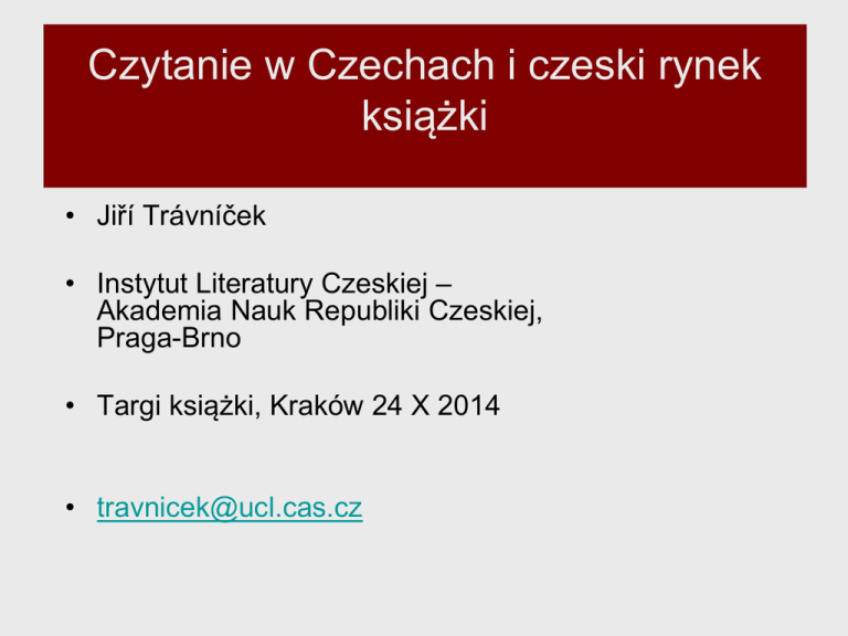 Czytanie w Czechach i czeski rynek książki • Jiří Trávníček • Instytut Literatury Czeskiej – Akademia Nauk Republiki Czeskiej, Praga-Brno • Targi książki, Kraków 24 X 2014 • [email protected] Osnowa 1. 2. 3. 4. 5. Nasze badania (zaplecze i schemat) Czytanie - dane podstawowe Czeski rynek książki Czesko-polskie porównania Podsumowanie/zakończenie 1.1 Nasze badania (zaplecze i schemat) - organizatorzy: Biblioteka Narodowa i Instytut Literatury Czeskiej – Akademia Nauk Republiki Czeskiej - 2007, 2010 i 2013 – badania ilościowe (statystyczne), próbka reprezentacyjna (wiek 15+, 1,554 respondentów, błąd statystyczny 2,5 %) - 75 % kwestionariusza jest stałych; 25 % poświęconych za każdym razem innej części kultury czytelniczej – bibliotekom publicznym (2007), beletrystyce (2010), rynkowi książki (2013) - paralelnie rozwijane badania jakościowe – na podstawie biografii czytelniczych (nagrywanie i przepisywanie: 2009-2015) 1.2 Czytanie - jak je traktujemy (1) jedna z kilku „aktywności medialnych“ (nie ma czegoś takiego jak czytanie samo o sobie) (2) warunek krytycznego i samodzielnego myślenia (kłuczowa kompetecja kulturowa) (3) ślad społeczno-kulturowy (czytanie to nie tylko prywatna aktywność jednostki pozbawiona powiązań społecznych) 1.3 Czytanie – struktura pytań - ile i co czytamy v ciągu roku ile czasu poświęcamy czytaniu (książek) czytanie cyfrowe czytanie a inne media czytanie a czas wolny, związek czytanie-praca korzystanie z bibliotek publicznych czytanie a rynek książki 1.4 Czytelnik (statystyczny) - ten, kto deklaruje preczytanie jednej książki w ciągu roku – jakiejkolwiek (beletrystycznej, naukowej lub faktograficznej), w jakimkolwiek celu (dla zabawy, dla informacji, dla nauki) i w jakimkolwiek mediu (drukowanej lub cyfrowej) 2.1 Dane podstawowe czytanie kupowanie biblioteki publiczne 84% 83% 79% 71% 48% 46% 40% 38% 32% rok 2007 rok 2010 rok 2013 baza: wszyscy ankietowani 2.2 Czytelnicy (wg. ilości przeczytanych książek) nieczytelnik (0 książek) czyt. "regularny" (7-12 książek) rok 2007 rok 2010 rok 2013 17% 21% 16% 39% 32% 40% czyt. sporadyczny (1-6 książek) czyt. częsty (13 i więcej książek) 16% 17% 20% 29% 29% 24% baza: wszyscy ankietowani 2.3 Kupowanie książek – gdzie rok 2010 rok 2013 89% 87% w tradycyjnych księgarniach 55% w sklepach taniej książki 38% 27% 20% w antykwariatach 21% 14% w supermarketach 21% 25% w internecie 18% 12% w klubach książki gdzieś indziej 3% 2% reszta do 100 % = odpowiedź „nie“ baza: ci, którzy kupili jakąś książkę 2.4 Kupowanie książek (2013) w klubach książki 6% gdzieś indziej w 1% supermarketach 7% w tradycyjnych księgarniach 44% w antykwariatach 10% w internecie 13% w sklepach taniej książki 19% wersja uproszczona baza: ci, którzy kupili jakąś książkę 2.5 Motyw kupna książki (2013) gatunek 73% temat 59% autor 49% z polecenia znajomych lub bliskich 43% cena 21% krytyka 9% rozgłos v TV, radiu i prasie 8% wydawnictwo i edycja 5% okładka 4% przypadek 5% sumaǂ 100 %; więcej możliwości odpowiedzi baza: ci, którzy kupili jakąś książkę 2.6 Motyw kupna książki (2013) gatunek 26% inne 11% cena 8% z polecenia znajomych lub bliskich 16% temat 21% autor 18% wersja uproszczona baza: ci, którzy kupili jakąś książkę 2.7 Pozyskiwanie książek (2013) gdzieś indziej 1% prezent 18% w internecie 5% biblioteka publiczna 34% zakup (księgarnia) 21% księgozbior domowy (znajomi, bliscy) 21% średnia: 10,7 pozyskanych książek w ciągu roku baza: wszyscy ankietowani 2.8 Wypowiedzi ankietowanych - zbyt drogie książki: dlaczego te książki są tak drogie, wcześniej były tanie; obniżyć ceny!; przeszkadza mi ciągle rosnąca cena książek. - zbyt wielka oferta: targ książki jest przesycony; książek się publikuje za dużo, pieniędzy jest jednak za mało. baza: ci, którzy odpowiedzieli 3.1 Rynek książki w Czechach (2013) - wartość rynku książki: 310 mln euro (szacunkowo) - średnia liczba książek kupionych przez jednego obywatela: 2,3 (25,5 euro) źródło: Stowarzyszenie Księgarzy i Wydawców Czeskich; własne badania 3.2 Liczba wydanych tytulów razem z tego przekładów rok 2010 17,054 35 % rok 2011 18,985 34 % rok 2012 17,247 34 % rok 2013 17,876 37 % pierwsze wydania : wznowienia 85 % : 15 % źródło: Biblioteka Narodowa 3.3 Wydane tytuly – geografia (2012) Praga Brno Ostrawa Ołomuniec Pilzno Czeskie Budziejowice Liberec Zlin 53,4 % 13,5 % 4,2 % 3,5 % 1,9 % 1,7 % 1,2 % 1,1 % źródło: Stowarzyszenie Księgarzy i Wydawców Czeskich 3.4 Liczba wydawnictw rok 2010 4,875 rok 2011 5,167 rok 2012 5,474 rok 2013 5,796 5 największych wydawnictw produkuje 13 % wszystkich tytułów największe wydawnictwa: Albatros Media - 730 tytułów, Euromedia Group – 510 (2013) źródło: Narodowa Agencja ISBN 3.5 Średni nakład książki (2013) 2,000 – 3,000 egzemplarzy (szacunkowo) 3.6 Średnia cena książki (euro) 11,1 9,2 7,4 VAT= 15 % VAT= 10 % VAT= 5 % rok 2007 rok 2010 rok 2013 źródło: badania wlasne 3.7 Liczba księgarni w Czechach - 600 tradycyjnych księgarni; - z tego 187 znajdujacych sie sieciach księgarskich (2012) źródło: Stowarzyszenie Księgarzy i Wydawców Czeskich 3.8 E-booki szacunkowo 500 000 200 000 0,35 % całej objętności finansowej 17 000 rok 2011 rok 2012 rok 2013 źródło: Stowarzyszenie Księgarzy i Wydawców Czeskich 4.1 Porównania czesko-polskie: czytający Rep. Czeska (2011) Polska (2010) CAŁOŚĆ 46% 79% PŁEĆ mężczyzni 73% 38% kobiety 50% 85% WIEK 15-19 lat 75% 20-29 lat 51% 30-39 lat 43% 40-49 lat 43% 50-59 lat 60 lat i więcej 88% 75% 75% 84% 78% 37% 77% 35% MIEJSCE ZAMIESZKANIA wieś małe miasto średnie miasto wielkie miasto 75% 34% 48% 76% 81% 43% 44% 84% źródło: Biblioteka Narodowa Warszawa; własne badania 5. Podsumowanie/zakończenie Czeska kultura czytelnicza: - duży odsetek czytających przynajmniej 1 książkę w ciągu roku (czołówka Europy) - malej