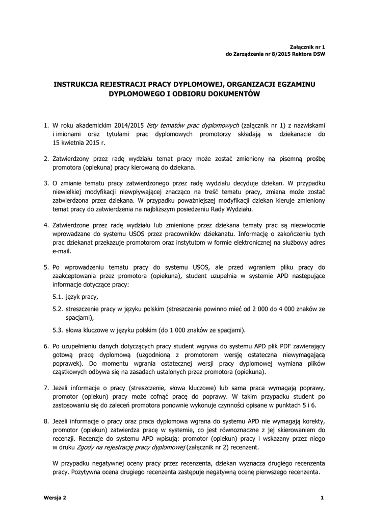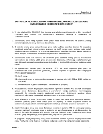 Załącznik nr 1 do Zarządzenia nr 8/2015 Rektora DSW INSTRUKCJA REJESTRACJI PRACY DYPLOMOWEJ, ORGANIZACJI EGZAMINU DYPLOMOWEGO I ODBIORU DOKUMENTÓW 1. W roku akademickim 2014/2015 listy tematów prac dyplomowych (załącznik nr 1) z nazwiskami i imionami oraz tytułami prac dyplomowych promotorzy składają w dziekanacie do 15 kwietnia 2015 r. 2. Zatwierdzony przez radę wydziału temat pracy może zostać zmieniony na pisemną prośbę promotora (opiekuna) pracy kierowaną do dziekana. 3. O zmianie tematu pracy zatwierdzonego przez radę wydziału decyduje dziekan. W przypadku niewielkiej modyfikacji niewpływającej znacząco na treść tematu pracy, zmiana może zostać zatwierdzona przez dziekana. W przypadku poważniejszej modyfikacji dziekan kieruje zmieniony temat pracy do zatwierdzenia na najbliższym posiedzeniu Rady Wydziału. 4. Zatwierdzone przez radę wydziału lub zmienione przez dziekana tematy prac są niezwłocznie wprowadzane do systemu USOS przez pracowników dziekanatu. Informację o zakończeniu tych prac dziekanat przekazuje promotorom oraz instytutom w formie elektronicznej na służbowy adres e-mail. 5. Po wprowadzeniu tematu pracy do systemu USOS, ale przed wgraniem pliku pracy do zaakceptowania przez promotora (opiekuna), student uzupełnia w systemie APD następujące informacje dotyczące pracy: 5.1. język pracy, 5.2. streszczenie pracy w języku polskim (streszczenie powinno mieć od 2 000 do 4 000 znaków ze spacjami), 5.3. słowa kluczowe w języku polskim (do 1 000 znaków ze spacjami). 6. Po uzupełnieniu danych dotyczących pracy student wgrywa do systemu APD plik PDF zawierający gotową pracę dyplomową (uzgodnioną z promotorem wersję ostateczna niewymagającą poprawek). Do momentu wgrania ostatecznej wersji pracy dyplomowej wymiana plików cząstkowych odbywa się na zasadach ustalonych przez promotora (opiekuna). 7. Jeżeli informacje o pracy (streszczenie, słowa kluczowe) lub sama praca wymagają poprawy, promotor (opiekun) pracy może cofnąć pracę do poprawy. W takim przypadku student po zastosowaniu się do zaleceń promotora ponownie wykonuje czynności opisane w punktach 5 i 6. 8. Jeżeli informacje o pracy oraz praca dyplomowa wgrana do systemu APD nie wymagają korekty, promotor (opiekun) zatwierdza pracę w systemie, co jest równoznaczne z jej skierowaniem do recenzji. Recenzje do systemu APD wpisują: promotor (opiekun) pracy i wskazany przez niego w druku Zgody na rejestrację pracy dyplomowej (załącznik nr 2) recenzent. W przypadku negatywnej oceny pracy przez recenzenta, dziekan wyznacza drugiego recenzenta pracy. Pozytywna ocena drugiego recenzenta zastępuje negatywną ocenę pierwszego recenzenta. Wersja 2 1 Jeżeli ocena drugiego recenzenta jest negatywna, to praca nie jest dopuszczona do obrony. Dziekan wyznacza nowego promotora lub zobowiązuje promotora pierwotnie wskazanego do uwzględnienia uwag recenzentów. Student zobowiązany jest do poprawy pracy i jej zarejestrowania zgodnie z niniejszą procedurą. Wpisanie i zatwierdzenie recenzji w APD przez promotora (opiekuna)/recenzenta musi nastąpić najpóźniej na 3 dni przed egzaminem dyplomowym. Wydrukowane przez promotora (opiekuna)/recenzenta recenzje dołączane są do dokumentacji podczas egzaminu dyplomowego. 9. Po wpisaniu i zatwierdzeniu recenzji w APD przez promotora (opiekuna) pracy oraz recenzenta automatycznie następuje ostateczne zatwierdzenie pracy (praca gotowa do egzaminu dyplomowego). Warunkiem przygotowania dokumentacji na egzamin dyplomowy jest wpisanie do systemu APD recenzji zarówno przez promotora (opiekuna) pracy, jak i przez recenzenta. 10. Najpóźniej 14 dni przed planowanym terminem egzaminu dyplomowego student musi zarejestrować w dziekanacie pracę dyplomową. Podstawą rejestracji pracy jest podpisana przez promotora (opiekuna) pracy Zgoda na rejestrację pracy dyplomowej (załącznik nr 2) zawierająca planowany termin egzaminu, skład komisji egzaminacyjnej oraz ostateczną wersję tematu pracy. Warunkiem rejestracji pracy jest: 10.1. zaliczenie wszystkich przedmiotów przewidzianych w programie studiów; 10.2. zgodność tematu pracy dyplomowej z tematem zatwierdzonym wcześniej przez Radę Wydziału; 10.3. złożenie jednego egzemplarza pracy dyplomowej zgodnego z zatwierdzonym w APD plikiem pracy: wydrukowanego dwustronnie, nieoprawionego, z luźnymi kartkami w papierowej teczce, z dodatkową stroną tytułową naklejoną na wierzchu teczki; 10.4. złożenie Oświadczenia o samodzielnym napisaniu pracy dyplomowej (załączniku nr 3); 10.5. złożenie dziennika praktyk (jeśli program studiów przewiduje odbycie praktyk) – wypełnionego i podpisanego przez opiekuna praktyk; 10.6. brak zaległych opłat związanych z odbywaniem studiów – potwierdzony przez kwesturę DSW na druku Zgody promotora na rejestrację pracy. Niespełnienie któregokolwiek z powyższych warunków będzie skutkowało odmową rejestracji pracy dyplomowej. 11. Do rejestrowanej pracy student powinien dołączyć 4 fotografie w formacie 4,5 x 6,5 cm. W przypadku braku zdjęć należy je dostarczyć do działu nauczania w najbliższym możliwym terminie. 12. W wyjątkowych przypadkach dopuszcza się możliwość zarejestrowania pracy dyplomowej w terminie krótszym niż 14 dni przed egzaminem dyplomowym. W takim przypadku o dopuszczeniu do egzaminu dyplomowego decyduje dziekan na wniosek studenta, po zasięgnięciu opinii promotora (opiekuna) pracy. 13. Zgodnie z Regulaminem studiów DSW, student ma obowiązek zarejestrować pracę do 30 września jeśli ostatni semestr studiów jest realizowany w semestrze letnim, lub do 31 marca jeśli ostatni semestr studiów realizowany jest w semestrze zimowym.. Egzamin dyplomowy powinien odbyć się w ciągu 30 dni od daty zarejestrowania pracy dyplomowej. W szczególnych wypadkach dopuszcza się możliwość wydłużenia tego terminu na zasadach określonych w Regulaminie studiów DSW obowiązującym w danym roku ak