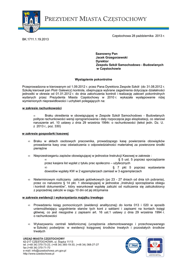Częstochowa 28 października 2013 r. BK.1711.1.19.2013 Szanowny Pan Jacek Grzegorzewski Dyrektor Zespołu Szkół Samochodowo - Budowlanych w Częstochowie Wystąpienie pokontrolne Przeprowadzona w kierowanym od 1.09.2012 r. przez Pana Dyrektora Zespole Szkół (do 31.08.2012 r. Szkołą kierował pan Piotr Galewicz) kontrola, obejmująca wybrane zagadnienia dotyczące działalności jednostki w okresie od 01.01.2012 r. do dnia zakończenia kontroli i realizację zaleceń pokontrolnych wydanych przez Prezydenta Miasta Częstochowy w 2010 r. wykazała występowanie niżej wymienionych nieprawidłowości i uchybień polegających na: w zakresie rachunkowości • Braku określenia w obowiązującej w Zespole Szkół Samochodowo - Budowlanych polityce rachunkowości wersji oprogramowania i daty rozpoczęcia jego eksploatacji, co stanowi naruszenie art. 10 ustawy z dnia 29 września 1994r. o rachunkowości (tekst jedn. Dz. U. z 2013 r., poz. 330) w zakresie gospodarki kasowej • Braku w aktach osobowych pracownika, prowadzącego kasę powierzenia obowiązków prowadzenia kasy oraz oświadczenia o odpowiedzialności materialnej za powierzone środki pieniężne • Nieprzestrzeganiu zapisów obowiązującej w jednostce Instrukcji Kasowej w zakresie : • § 5 ust. 5 poprzez sporządzanie przez kasjera list wypłat z tytułu prac społeczno – użytecznych • § 7 pkt 5 poprzez wystawianie dowodów wypłaty KW w 2 egzemplarzach zamiast w 3 egzemplarzach • Nieterminowym rozliczaniu zaliczek gotówkowych (po 23 - 27 dniach od dnia ich pobrania), przez co naruszono § 14 pkt. 1 obowiązującej w jednostce „Instrukcji sporządzania obiegu i kontroli dokumentów”, który warunkował wypłatę zaliczki od rozliczenia się zaliczkobiorcy z poprzedniej zaliczki w ciągu 10 dni od jej otrzymania w zakresie ewidencji i wykorzystania majątku trwałego • Prowadzeniu ksiąg pomocniczych (ewidencji analitycznej) do konta 013 i 020 w sposób uniemożliwiający uzgodnienie stanów tych kont z saldami i zapisami na kontach księgi głównej, co jest niezgodne z zapisami art. 16 ust.1 ustawy z dnia 29 września 1994 r. o rachunkowości • Wykazywaniu centrali telefonicznej (urządzenia zdemontowanego i przechowywanego w Szkole) podwójnie: w ewidencji księgowej środków trwałych i pozostałych środków trwałych • Wprowadzeniu samochodu osobowego marki Opel Astra III Sedan (stanowiącego pomoc dydaktyczną) do ewidencji ilościowej, zamiast do ewidencji ilościowo – wartościowej (wartość przedmiotu darowizny została ustalona na kwotę 40.393,50zł), co było niezgodne z obowiązującą w Szkole polityką rachunkowości w zakresie dochodów budżetowych • Nieobjęciu przez głównego księgowego wstępną kontrolą - do której zobowiązuje art. 54 ust. 1 i 3 ustawy z dnia 27 sierpnia 2009 r. o finansach publicznych (tekst jedn. Dz. U z 2013 r., poz. 885) - zawieranych umów najmu i dzierżawy • Nienaliczeniu i nieujęciu w księgach rachunkowych odsetek od niezapłaconego w terminie czynszu z tytułu umowy wynajmu pomieszczenia na gabinet stomatologiczny oraz sal dla policealnej szkoły, czym naruszono zapisy Rozporządzenia Ministra Finansów z dnia 5 lipca 2010 r. w sprawie szczególnych zasad rachunkowości oraz planów kont dla budżetu państwa, budżetów jednostek samorządu terytorialnego, jednostek budżetowych, samorządowych zakładów budżetowych, państwowych funduszy celowych oraz państwowych jednostek budżetowych mających siedzibę poza granicami Rzeczypospolitej Polskiej (Dz. U. z 2010 r. Nr 128, poz. 861 z późn. zm.) - zgodnie z ww. Rozporządzeniem odsetki od należności i zobowiązań, w tym również tych, do których stosuje się przepisy dotyczące zobowiązań podatkowych, ujmuje się w księgach rachunkowych w momencie ich zapłaty, lecz nie później niż pod datą ostatniego dnia kwartału w wysokości odsetek należnych na koniec tego kwartału • Ustaleniu czynszu za wynajem sali lekcyjnej w celu przeprowadzania kursów na prawo jazdy w grudniu 2012 roku i styczniu 2013r. w wysokości niższej od określonej w § 2 ust. 2 Zarządzenia Prezydenta Miasta Częstochowy nr 457/11 z dnia 12 września 2011r. w sprawie ustalenia zasad zawierania umów najmu, dzierżawy i użyczenia nieruchomości oddanych w trwały zarząd, przez dyrektorów gminnych jednostek oświatowych, który określa minimalną stawkę czynszu dla sali dydaktycznej w przypadku prowadzenia działalności gospodarczej lub prowadzenia ośrodka kursowego na 20 zł. W wyniku błędu zaniżono dochody o 70 zł za grudzień 2012r. i o 21,70 zł za styczeń 2013 r. • Niesprecyzowaniu w umowach dzierżawy terenu pod plac manewrowy nr 7/2011 z dnia 01.11.2011r. oraz nr 6/2012 z dnia 03.09.2012r. ilości godzin i dni wykorzystania przez dzierżawiącego teren oraz pominięcie w zawartych umowach paragrafów od 15 do 17 określonych we wzorze umowy stanowiących załącznik nr 5 Zarządzenia Prezydenta Nr 457/11 • Sporządzaniu umów wynajmu sali gimnastycznej niezgodnych z ramowym wzorem umowy określonym w załączniku Nr 2 Zarządzeniu Nr 457/11 z dnia 12 września 2011 r. oraz nieokreślaniu terminu regulowania należności z tytułu wynajmu sali gimnastycznej w zawieranych umowach wynajmu ww. sali • Nieujęciu w umowie wynajmu pomieszczenia na gabinet stomatologiczny zapisów dotyczących opłat za reklamę w zakresie wydatków • Uregulowaniu zobowiązań wobec dostawców z opóźnieniem (w dwóch przypadkach), co skutkowało zapłatą odsetek w łącznej kwocie 8,00 zł w zakresie Zakładowego Funduszu Świadczeń Socjalnych • Udzieleniu w maju i czerwcu 2013 roku 4 pracownikom administracji Szkoły nowych pożyczek mieszkaniowych, pomimo niespłacenia przez nich pożyczek wcześniej im udzielonych, przez co naruszano zapis § 10 pkt 1 obowiązującego w Zespole Regulaminu Zakładowego Funduszu Świadczeń Socjalnych, który mówi że pożyczki na cele mieszkaniowe mogą być W