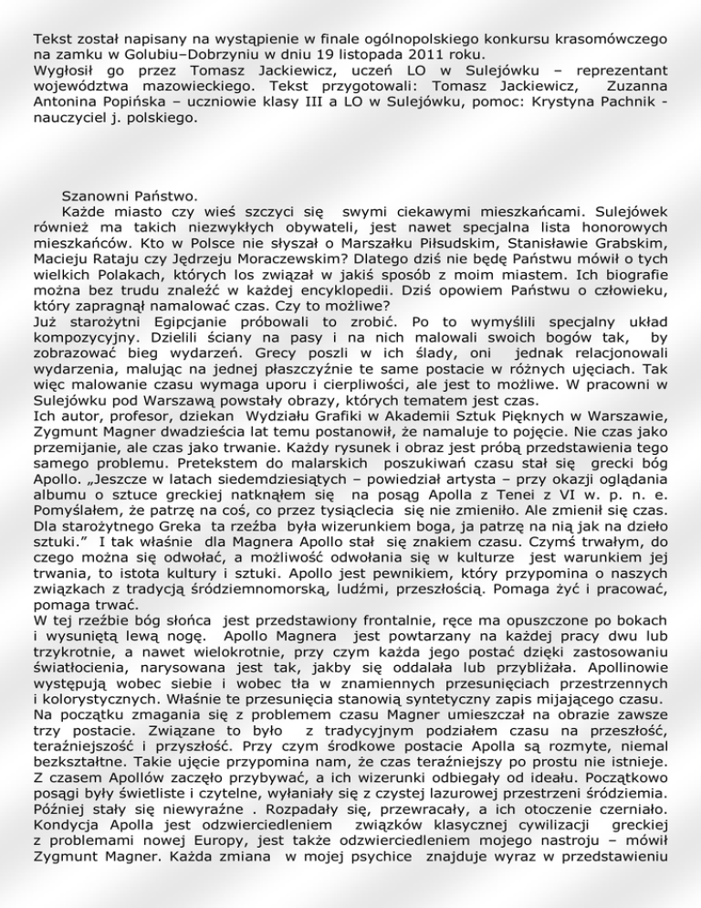 Tekst został napisany na wystąpienie w finale ogólnopolskiego konkursu krasomówczego na zamku w Golubiu–Dobrzyniu w dniu 19 listopada 2011 roku. Wygłosił go przez Tomasz Jackiewicz, uczeń LO w Sulejówku – reprezentant województwa mazowieckiego. Tekst przygotowali: Tomasz Jackiewicz, Zuzanna Antonina Popińska – uczniowie klasy III a LO w Sulejówku, pomoc: Krystyna Pachnik nauczyciel j. polskiego. Szanowni Państwo. Każde miasto czy wieś szczyci się swymi ciekawymi mieszkańcami. Sulejówek również ma takich niezwykłych obywateli, jest nawet specjalna lista honorowych mieszkańców. Kto w Polsce nie słyszał o Marszałku Piłsudskim, Stanisławie Grabskim, Macieju Rataju czy Jędrzeju Moraczewskim? Dlatego dziś nie będę Państwu mówił o tych wielkich Polakach, których los związał w jakiś sposób z moim miastem. Ich biografie można bez trudu znaleźć w każdej encyklopedii. Dziś opowiem Państwu o człowieku, który zapragnął namalować czas. Czy to możliwe? Już starożytni Egipcjanie próbowali to zrobić. Po to wymyślili specjalny układ kompozycyjny. Dzielili ściany na pasy i na nich malowali swoich bogów tak, by zobrazować bieg wydarzeń. Grecy poszli w ich ślady, oni jednak relacjonowali wydarzenia, malując na jednej płaszczyźnie te same postacie w różnych ujęciach. Tak więc malowanie czasu wymaga uporu i cierpliwości, ale jest to możliwe. W pracowni w Sulejówku pod Warszawą powstały obrazy, których tematem jest czas. Ich autor, profesor, dziekan Wydziału Grafiki w Akademii Sztuk Pięknych w Warszawie, Zygmunt Magner dwadzieścia lat temu postanowił, że namaluje to pojęcie. Nie czas jako przemijanie, ale czas jako trwanie. Każdy rysunek i obraz jest próbą przedstawienia tego samego problemu. Pretekstem do malarskich poszukiwań czasu stał się grecki bóg Apollo. „Jeszcze w latach siedemdziesiątych – powiedział artysta – przy okazji oglądania albumu o sztuce greckiej natknąłem się na posąg Apolla z Tenei z VI w. p. n. e. Pomyślałem, że patrzę na coś, co przez tysiąclecia się nie zmieniło. Ale zmienił się czas. Dla starożytnego Greka ta rzeźba była wizerunkiem boga, ja patrzę na nią jak na dzieło sztuki.” I tak właśnie dla Magnera Apollo stał się znakiem czasu. Czymś trwałym, do czego można się odwołać, a możliwość odwołania się w kulturze jest warunkiem jej trwania, to istota kultury i sztuki. Apollo jest pewnikiem, który przypomina o naszych związkach z tradycją śródziemnomorską, ludźmi, przeszłością. Pomaga żyć i pracować, pomaga trwać. W tej rzeźbie bóg słońca jest przedstawiony frontalnie, ręce ma opuszczone po bokach i wysuniętą lewą nogę. Apollo Magnera jest powtarzany na każdej pracy dwu lub trzykrotnie, a nawet wielokrotnie, przy czym każda jego postać dzięki zastosowaniu światłocienia, narysowana jest tak, jakby się oddalała lub przybliżała. Apollinowie występują wobec siebie i wobec tła w znamiennych przesunięciach przestrzennych i kolorystycznych. Właśnie te przesunięcia stanowią syntetyczny zapis mijającego czasu. Na początku zmagania się z problemem czasu Magner umieszczał na obrazie zawsze trzy postacie. Związane to było z tradycyjnym podziałem czasu na przeszłość, teraźniejszość i przyszłość. Przy czym środkowe postacie Apolla są rozmyte, niemal bezkształtne. Takie ujęcie przypomina nam, że czas teraźniejszy po prostu nie istnieje. Z czasem Apollów zaczęło przybywać, a ich wizerunki odbiegały od ideału. Początkowo posągi były świetliste i czytelne, wyłaniały się z czystej lazurowej przestrzeni śródziemia. Później stały się niewyraźne . Rozpadały się, przewracały, a ich otoczenie czerniało. Kondycja Apolla jest odzwierciedleniem związków klasycznej cywilizacji greckiej z problemami nowej Europy, jest także odzwierciedleniem mojego nastroju – mówił Zygmunt Magner. Każda zmiana w mojej psychice znajduje wyraz w przedstawieniu Apolla. Sztuka jest rodzajem spowiedzi, wszystko zależy od przeżyć, emocji a nawet humoru artysty. W pracach pochodzących z lat osiemdziesiątych niektóre partie twarzy i części ciała Apolla są pokryte innymi strukturami, takimi jak siatki, pręty, krzyże i inne nieregularne formy. Największa deformacja Apolla dokonała się w jego magnerowskim wizerunku kilka lat temu. Obserwacje i przemyślenia Zygmunta Magnera dotyczące ludzkiej kondycji i zatracania tradycyjnych wartości doprowadziły artystę do porzucenia blejtramu i kolorowych farb olejnych. Zamienił je na cienkie płótno i czarny tusz. Na ogromnych 2-3 metrowych powierzchniach poustawiane w rzędy pojawiają się dziesiątki delikatnych i kruchych posągów, bezładnie upadających i ginących w czarno – szarej przestrzeni. Mają niewiele wspólnego z antycznym bóstwem. Przedstawiają raczej zagubione, niedoskonałe postacie ludzkie, które nie mogą sobie poradzić z drapieżną rzeczywistością. Postacie są niekiedy regularne, innym razem – rozrzucone albo odwrócone. Te wizje Apolla nawiązują do egipskich malowideł na sklepieniach grobowców, gdzie powtórzone wizerunki postaci, w otoczeniu statków i innych symboli, wybierają się w pośmiertną podróż. W niektórych rysunkach Magnera figury Apolla są pęknięte albo rozpadają się w oświetlonych miejscach, wszystkie jednak symbolizują dostojeństwo i głęboki sens sztuki, która ma moc przetrwania mimo upływu czasu. Te obrazy są także protestem przeciwko czasowi sprofanowanemu, odartemu z ludzkich wartości. Apollo Magnera pokazuje, jak daleką drogę przeszła ludzkość od świadectwa Porządku i Pewności, Prawdy i Piękna do świadectwa Lęku i Pogardy dla cieni spalonych, pozbawionych wcześniej imienia, ludzkiej biografii. Apollo zdaje się krzyczeć, by nigdy nie powtórzył się tamten czas. Tak więc twórczość artysty, który zamieszkał wiele lat temu w Sulejówku, jest swego rodzaju dzie