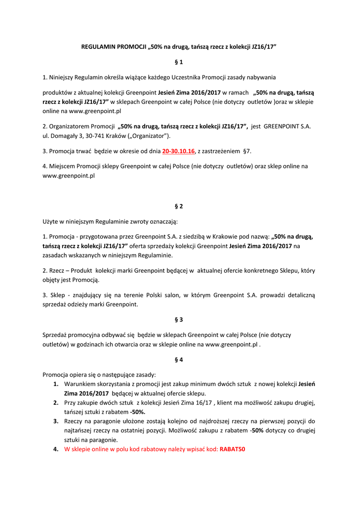 REGULAMIN PROMOCJI „50% na drugą, tańszą rzecz z kolekcji JZ16/17” §1 1. Niniejszy Regulamin określa wiążące każdego Uczestnika Promocji zasady nabywania produktów z aktualnej kolekcji Greenpoint Jesień Zima 2016/2017 w ramach „50% na drugą, tańszą rzecz z kolekcji JZ16/17” w sklepach Greenpoint w całej Polsce (nie dotyczy outletów )oraz w sklepie online na www.greenpoint.pl 2. Organizatorem Promocji „50% na drugą, tańszą rzecz z kolekcji JZ16/17”, jest GREENPOINT S.A. ul. Domagały 3, 30-741 Kraków („Organizator”). 3. Promocja trwać będzie w okresie od dnia 20-30.10.16, z zastrzeżeniem §7. 4. Miejscem Promocji sklepy Greenpoint w całej Polsce (nie dotyczy outletów) oraz sklep online na www.greenpoint.pl §2 Użyte w niniejszym Regulaminie zwroty oznaczają: 1. Promocja - przygotowana przez Greenpoint S.A. z siedzibą w Krakowie pod nazwą: „50% na drugą, tańszą rzecz z kolekcji JZ16/17” oferta sprzedaży kolekcji Greenpoint Jesień Zima 2016/2017 na zasadach wskazanych w niniejszym Regulaminie. 2. Rzecz – Produkt kolekcji marki Greenpoint będącej w aktualnej ofercie konkretnego Sklepu, który objęty jest Promocją. 3. Sklep - znajdujący się na terenie Polski salon, w którym Greenpoint S.A. prowadzi detaliczną sprzedaż odzieży marki Greenpoint. §3 Sprzedaż promocyjna odbywać się będzie w sklepach Greenpoint w całej Polsce (nie dotyczy outletów) w godzinach ich otwarcia oraz w sklepie online na www.greenpoint.pl . §4 Promocja opiera się o następujące zasady: 1. Warunkiem skorzystania z promocji jest zakup minimum dwóch sztuk z nowej kolekcji Jesień Zima 2016/2017 będącej w aktualnej ofercie sklepu. 2. Przy zakupie dwóch sztuk z kolekcji Jesień Zima 16/17 , klient ma możliwość zakupu drugiej, tańszej sztuki z rabatem -50%. 3. Rzeczy na paragonie ułożone zostają kolejno od najdroższej rzeczy na pierwszej pozycji do najtańszej rzeczy na ostatniej pozycji. Możliwość zakupu z rabatem -50% dotyczy co drugiej sztuki na paragonie. 4. W sklepie online w polu kod rabatowy należy wpisać kod: RABAT50 5. Odzież zakupiona w ramach Promocji podlega zwrotom i wymianom. Zwrot pierwszej rzeczy z paragonu nie objętej promocją jest równoznaczny z rezygnacją udziału w promocji. W związku z tym druga rzecz z paragonie zostanie sprzedana w cenie regularnej. W przypadku zakupu większej ilości niż dwóch sztuk i chęci zwrotu którejś z nich, nie ma możliwości skorzystania z promocji na kolejne rzeczy na paragonie (kolejność rzeczy na paragonie nie może ulec zmianie) tylko w momencie, kiedy zwrot nastąpi poza okresem obowiązywania promocji. §5 Promocja nie może być sumowa z innymi promocjami i rabatami. Dotyczy modeli nieprzecenionych. Nie łączy się ze zniżką na Kartę Stałego Klienta. §6 Informacja o Promocji zawarta na plakatach i materiałach reklamowych nie stanowi oferty ani przyrzeczenia publicznego. Za wadliwe lub niepełne odczytanie hasła Promocji Organizator nie odpowiada. §7 Organizator ma prawo odwołać, skrócić lub wydłużyć okres trwania Promocji bez podawania przyczyn, poprzez usunięcie informacji o promocji z Sklepów oraz ze strony internetowej www.greenpoint.pl §8 Wszelkie ewentualne skargi, związane ze sposobem przebiegu Promocji, klient może skierować pisemnie na poniższy adres w ciągu 3 dni od nabycia odzieży celem rozpatrzenia zasadności skargi lub żądania. Greenpoint S.A. ul. Domagały 3, 30- 741 Kraków. §9 Organizator zastrzega sobie prawo zmiany niniejszego Regulaminu w czasie trwania Promocji. Zmiana zacznie obowiązywać od dnia publikacji jej w Sklepach objętych niniejszą Promocją. § 10 1. Organizator nie ponosi odpowiedzialności za ewentualne kwestie sporne powstałe z przyczyn leżących po stronie osób trzecich. 2. Organizator udostępni Regulamin Promocji we wszystkich Sklepach objętych niniejszą Promocją.
