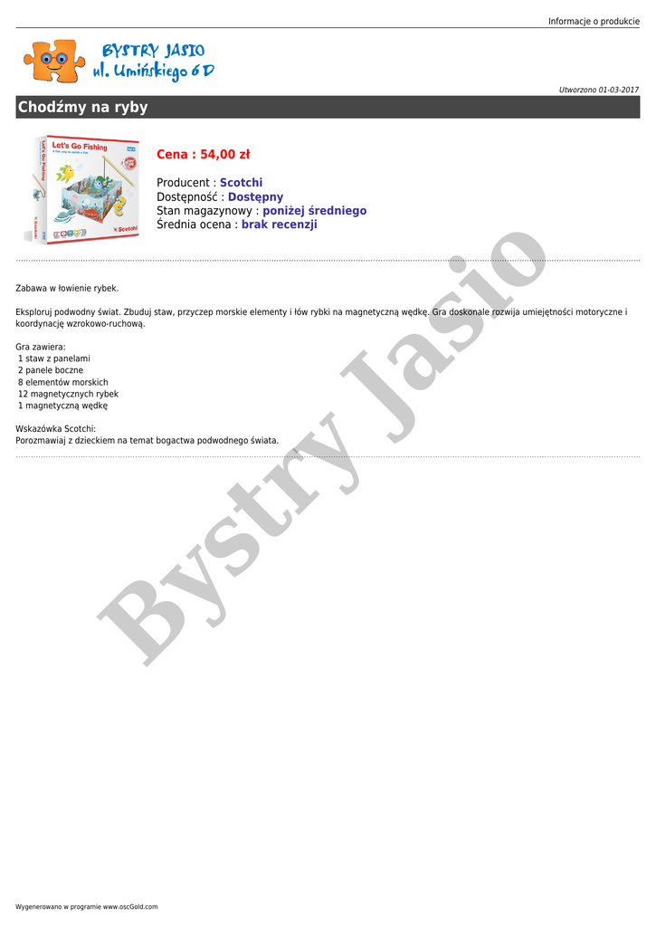 Informacje o produkcie Utworzono 01-03-2017 Chodźmy na ryby Cena : 54,00 zł si o Producent : Scotchi Dostępność : Dostępny Stan magazynowy : poniżej średniego Średnia ocena : brak recenzji Zabawa w łowienie rybek. Gra zawiera: 1 staw z panelami 2 panele boczne 8 elementów morskich 12 magnetycznych rybek 1 magnetyczną wędkę B ys tr y Wskazówka Scotchi: Porozmawiaj z dzieckiem na temat bogactwa podwodnego świata. Ja Eksploruj podwodny świat. Zbuduj staw, przyczep morskie elementy i łów rybki na magnetyczną wędkę. Gra doskonale rozwija umiejętności motoryczne i koordynację wzrokowo-ruchową. Wygenerowano w programie www.oscGold.com