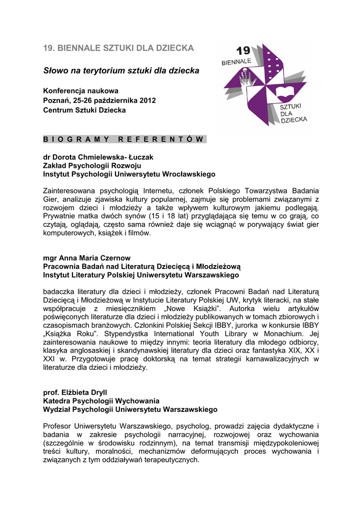 19. BIENNALE SZTUKI DLA DZIECKA Słowo na terytorium sztuki dla dziecka Konferencja naukowa Poznań, 25-26 października 2012 Centrum Sztuki Dziecka B I O G R A M Y R E F E R E N T Ó W dr Dorota Chmielewska- Łuczak Zakład Psychologii Rozwoju Instytut Psychologii Uniwersytetu Wrocławskiego Zainteresowana psychologią Internetu, członek Polskiego Towarzystwa Badania Gier, analizuje zjawiska kultury popularnej, zajmuje się problemami związanymi z rozwojem dzieci i młodzieży a także wpływem kulturowym jakiemu podlegają. Prywatnie matka dwóch synów (15 i 18 lat) przyglądająca się temu w co grają, co czytają, oglądają, często sama również daje się wciągnąć w porywający świat gier komputerowych, książek i filmów. mgr Anna Maria Czernow Pracownia Badań nad Literaturą Dziecięcą i Młodzieżową Instytut Literatury Polskiej Uniwersytetu Warszawskiego badaczka literatury dla dzieci i młodzieży, członek Pracowni Badań nad Literaturą Dziecięcą i Młodzieżową w Instytucie Literatury Polskiej UW, krytyk literacki, na stałe współpracuje z miesięcznikiem „Nowe Książki”. Autorka wielu artykułów poświęconych literaturze dla dzieci i młodzieży publikowanych w tomach zbiorowych i czasopismach branżowych. Członkini Polskiej Sekcji IBBY, jurorka w konkursie IBBY „Książka Roku”. Stypendystka International Youth Library w Monachium. Jej zainteresowania naukowe to między innymi: teoria literatury dla młodego odbiorcy, klasyka anglosaskiej i skandynawskiej literatury dla dzieci oraz fantastyka XIX, XX i XXI w. Przygotowuje pracę doktorską na temat strategii karnawalizacyjnych w literaturze dla dzieci i młodzieży. prof. Elżbieta Dryll Katedra Psychologii Wychowania Wydział Psychologii Uniwersytetu Warszawskiego Profesor Uniwersytetu Warszawskiego, psycholog, prowadzi zajęcia dydaktyczne i badania w zakresie psychologii narracyjnej, rozwojowej oraz wychowania (szczególnie w środowisku rodzinnym), na temat transmisji międzypokoleniowej treści kultury, moralności, mechanizmów deformujących proces wychowania i związanych z tym oddziaływań terapeutycznych. prof. Grzegorz Godlewski Zakład Antropologii Słowa Instytut Kultury Polskiej Uniwersytetu Warszawskiego profesor Uniwersytetu Warszawskiego, kierownik Zakładu Antropologii Słowa. Zajmuje się antropologiczną teorią kultury i antropologią słowa. Przez wiele lat kierował specjalizacją „Animacja kultury” prowadzoną na kierunku „kulturoznawstwo – wiedza o kulturze”. Współautor tomu Animacja kultury. Doświadczenie i przyszłość (2002) oraz podręczników Antropologia kultury (2005) i Antropologia słowa (2003); ostatnio opublikował książkę Słowo – pismo – sztuka słowa. Perspektywy antropologiczne (2009). Od 2011 roku jest członkiem i sekretarzem naukowym Komitetu Nauk o Kulturze PAN. prof. Marta Karasińska Katedra Dramatu, Teatru i Widowisk Uniwersytet im. Adama Mickiewicza w Poznaniu profesor Uniwersytetu im. Adama Mickiewicza, polonistka, teatrolog. Teoretyk literatury i teatru. Animator kultury. Przez wiele lat związana zawodowo z Teatrem Nowym w Poznaniu, Poznańskim Teatrem Lalki i Aktora, Ogólnopolskim Ośrodkiem Sztuki dla Dzieci i Młodzieży. Autorka książek i artykułów poświęconych literaturze i teatrowi dla młodego widza, dramaturgii współczesnej, teorii teatru, kulturze najnowszej. Redaktorka książek zbiorowych podejmujących problematykę sztuki dla dziecka. dr Agnieszka Karpowicz Zakład Antropologii Słowa Instytut Kultury Polskiej Uniwersytetu Warszawskiego Zajmuje się literaturą i sztuką XX wieku w perspektywie kulturoznawczej. Autorka książki Kolaż. Awangardowy gest kreacji. Themerson, Buczkowski, Białoszewski. Publikowała w „Kulturze Współczesnej”, „Kontekstach”, „Pamiętniku Literackim”. Tłumaczka z języka francuskiego (m. in.: Yves Winkin, Antropologia komunikacji, Raymond Boudon, Efekt odwrócenia, Nathalie Heinich, Socjologia sztuki, Alain Tourain, Samotworzenie się społeczeństwa). mgr Weronika Kostecka Pracownia Badań Literatury dla Dzieci i Młodzieży Instytut Literatury Polskiej Uniwersytetu Warszawskiego Doktorantka, prowadzi zajęcia na Wydziale Polonistyki i na Uniwersytecie Otwartym Uniwersytetu Warszawskiego oraz w Wyższej Szkole Pedagogicznej ZNP. Należy do Polskiej Sekcji IBBY; od 2011 r. jest jurorką w konkursie IBBY „Książka Roku”. Autorka monografii naukowej Tajemnica księgi. Tropami współczesnej fantastyki dla dzieci i młodzieży (Warszawa 2010) i artykułów poświęconych literaturze dziecięcej i młodzieżowej publikowanych w tomach zbiorowych. Jako recenzentka współpracuje z miesięcznikiem „Nowe Książki”. prof. Grzegorz Leszczyński Pracownia Badań Literatury dla Dzieci i Młodzieży Instytut Literatury Polskiej Uniwersytetu Warszawskiego kierownik Pracowni, profesor Uniwersytetu Warszawskiego, prodziekan Wydziału Polonistyki, 1994 – 2000 zastępca dyrektora Redakcji Dziecięcej Telewizji Polskiej, 2002 – 2005 przewodniczący kapituły nagrody Prezydenta RP Sztuka Młodym, 1992 – 1995 prezes Polskiej Sekcji International Board on Books for Young People. Autor książek: Młodopolska lekcja fantazji (1990), Elementarz literacki (2001) Literatura i książka dziecięca. Słowo – obiegi – konteksty (2003), Kulturowy obraz dziecka i dzieciństwa w literaturze drugiej połowy XIX i w XX w. (2006), Magiczna biblioteka (2007), Bunt czytelników. Proza inicjacyjna netgeneracji (2010). Redaktor naukowy Słownika literatury dziecięcej i młodzieżowej (2002) i kilkunastu tomów zbiorowych, m.in. tomów będących owocem konferencji towarzyszących Biennale Sztuki dla Dziecka. Autor kierowanych do młodych czytelników antologii, m.in. Po schodach wierszy (1992), Polskie baśnie i legendy (2006), Baśnie świata (2007). dr Joanna Maleszyńska Zakład Poetyki Historycznej i Krytyki Literackiej Instytut Filologii Polskiej Uniwersytetu im. Adama