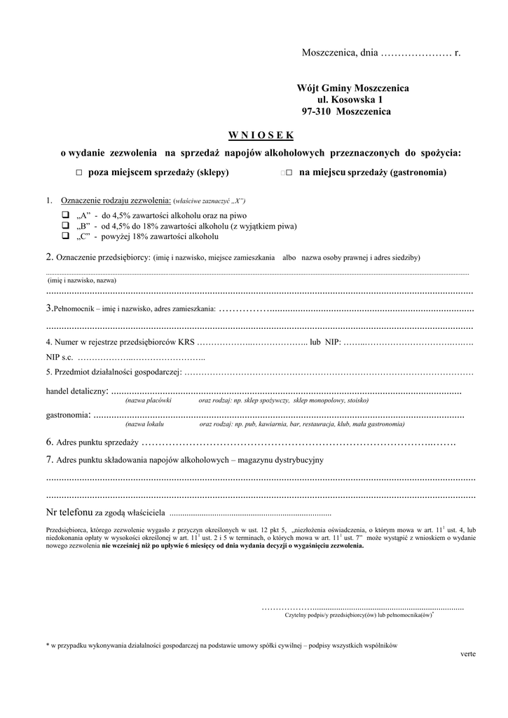 Moszczenica, dnia ………………… r. Wójt Gminy Moszczenica ul. Kosowska 1 97-310 Moszczenica WNIOSEK o wydanie zezwolenia na sprzedaż napojów alkoholowych przeznaczonych do spożycia: □ poza miejscem sprzedaży (sklepy) 1. □ na miejscu sprzedaży (gastronomia) Oznaczenie rodzaju zezwolenia: (właściwe zaznaczyć „X”) „A” - do 4,5% zawartości alkoholu oraz na piwo „B” - od 4,5% do 18% zawartości alkoholu (z wyjątkiem piwa) „C” - powyżej 18% zawartości alkoholu 2. Oznaczenie przedsiębiorcy: (imię i nazwisko, miejsce zamieszkania albo nazwa osoby prawnej i adres siedziby) ........................................................................................................................................................................................................................................................ (imię i nazwisko, nazwa) ....................................................................................................................................................................... 3.Pełnomocnik – imię i nazwisko, adres zamieszkania: ……………................................................................................ ....................................................................................................................................................................... 4. Numer w rejestrze przedsiębiorców KRS ………………..……………….. lub NIP: ……..………………………….….…. NIP s.c. ………………..…………………….. 5. Przedmiot działalności gospodarczej: ………………………………………………………………………………………… handel detaliczny: ......................................................................................................................................... (nazwa placówki gastronomia: oraz rodzaj: np. sklep spożywczy, sklep monopolowy, stoisko) ................................................................................................................................................. (nazwa lokalu oraz rodzaj: np. pub, kawiarnia, bar, restauracja, klub, mała gastronomia) 6. Adres punktu sprzedaży …………………………………………………………………………..……. 7. Adres punktu składowania napojów alkoholowych – magazynu dystrybucyjny ........................................................................................................................................................................ ........................................................................................................................................................................ Nr telefonu za zgodą właściciela ............................................................................ Przedsiębiorca, którego zezwolenie wygasło z przyczyn określonych w ust. 12 pkt 5, „niezłożenia oświadczenia, o którym mowa w art. 111 ust. 4, lub niedokonania opłaty w wysokości określonej w art. 111 ust. 2 i 5 w terminach, o których mowa w art. 11 1 ust. 7” może wystąpić z wnioskiem o wydanie nowego zezwolenia nie wcześniej niż po upływie 6 miesięcy od dnia wydania decyzji o wygaśnięciu zezwolenia. ………………....................................................................... Czytelny podpis/y przedsiębiorcy(ów) lub pełnomocnika(ów)* * w przypadku wykonywania działalności gospodarczej na podstawie umowy spółki cywilnej – podpisy wszystkich wspólników verte Przedkładam następujące załączniki do wniosku: □ dokument potwierdzający tytuł prawny wnioskodawcy do lokalu stanowiącego punkt sprzedaży napojów alkoholowych, □ zgodę właściciela (współwłaścicieli, małżonka/i), użytkownika, zarządcy lub administratora budynku, jeżeli punkt sprzedaży będzie zlokalizowany w budynku wielorodzinnym, na sprzedaż napojów alkoholowych, □ decyzję właściwego państwowego powiatowego inspektora sanitarnego o zatwierdzeniu zakładu, o której mowa w art. 65 ust.1 pkt 2 ustawy o bezpieczeństwie żywności i żywienia Podstawa prawna: art. 111 i art. 18 ustawy o wychowaniu w trzeźwości i przeciwdziałaniu alkoholizmowi Wniosek należy złożyć z kompletem załączników (oryginały dokumentów do wglądu), co najmniej 1 miesiąc przed planowanym rozpoczęciem sprzedaży napojów alkoholowych lub upływem ważności posiadanego dotychczas zezwolenia. Wniosek złożony bez wymaganych dokumentów i nieuzupełniony w terminie 7 dni od wezwania, zostanie pozostawiony bez rozpoznania. Podstawa prawna: art. 64 § 2 ustawy Kodeks postępowania administracyjnego W przypadku ustanowienia pełnomocnika do wniosku należy dołączyć dokument stwierdzający udzielenie pełnomocnictwa oraz dowód uiszczenia opłaty skarbowej w kwocie 17,00 zł Podstawa prawna: art. 4 ustawy z dnia 16 listopada 2006 r. o opłacie skarbowej Opłatę wnosi się w kasie pok. nr 3 w siedzibie Urzędu Gminy lub na konto: Bank Spółdzielczy Ziemi Piotrkowskiej O/Moszczenica 03 8973 0003 0070 0700 0707 0017 W przypadku dokonywania jednego przelewu w tytule wpłaty należy podać informację z zaznaczeniem wartości wpłaty (np.: do 4,5% zaw. alkoholu oraz piwo – 175,00 od 4,5% do 18% zaw. alkoholu (z wyjątkiem piwa) – 175,00 pow. 18% zaw. alkoholu – 700,00) Dowód wniesienia opłaty za wydanie zezwolenia okazać przed wydaniem zezwolenia. Wniosek nie podlega opłacie skarbowej art.4 ustawy o opłacie skarbowej.