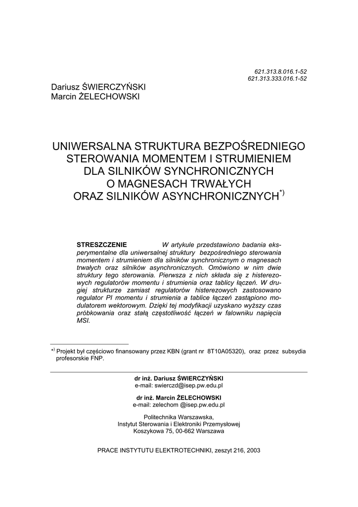 621.313.8.016.1-52 621.313.333.016.1-52 Dariusz ŚWIERCZYŃSKI Marcin ŻELECHOWSKI UNIWERSALNA STRUKTURA BEZPOŚREDNIEGO STEROWANIA MOMENTEM I STRUMIENIEM DLA SILNIKÓW SYNCHRONICZNYCH O MAGNESACH TRWAŁYCH ORAZ SILNIKÓW ASYNCHRONICZNYCH*) STRESZCZENIE W artykule przedstawiono badania eksperymentalne dla uniwersalnej struktury bezpośredniego sterowania momentem i strumieniem dla silników synchronicznym o magnesach trwałych oraz silników asynchronicznych. Omówiono w nim dwie struktury tego sterowania. Pierwsza z nich składa się z histerezowych regulatorów momentu i strumienia oraz tablicy łączeń. W drugiej strukturze zamiast regulatorów histerezowych zastosowano regulator PI momentu i strumienia a tablice łączeń zastąpiono modulatorem wektorowym. Dzięki tej modyfikacji uzyskano wyższy czas próbkowania oraz stałą częstotliwość łączeń w falowniku napięcia MSI. *) Projekt był częściowo finansowany przez KBN (grant nr 8T10A05320), oraz przez subsydia profesorskie FNP. dr inż. Dariusz ŚWIERCZYŃSKI e-mail: [email protected] dr inż. Marcin ŻELECHOWSKI e-mail: zelechom @isep.pw.edu.pl Politechnika Warszawska, Instytut Sterowania i Elektroniki Przemysłowej Koszykowa 75, 00-662 Warszawa PRACE INSTYTUTU ELEKTROTECHNIKI, zeszyt 216, 2003 132 D. Świerczyński, M. Żelechowski 1. WPROWADZENIE Metoda bezpośredniego sterowania momentem i strumieniem jest obecnie jedną z najbardziej badanych metod regulacji silników prądu przemiennego. Początkowo została ona zaproponowana dla silników indukcyjnych jako DTC (z ang. Direct Torque Control) [1]. Popularność metoda ta zawdzięcza swoim właściwościom, takim jak: bardzo dobra dynamika momentu i strumienia, brak transformacji współrzędnych, oraz mała ilość parametrów strojenia. Jednak klasyczna metoda DTC posiada również wady, z których najistotniejszą jest zmienna częstotliwość łączeń falownika. Dlatego też dalsze prace badawcze mają na celu znalezienie metody zachowującej pozytywne cechy klasycznej metody DTC przy równoczesnej eliminacji jej wad. Jednym ze sposobów wyeliminowania wad klasycznej metody DTC jest wykorzystanie modulatora wektorowego [2, 3, 4]. Prezentowana w artykule metoda wykorzystuje w swej strukturze modulator wektorowy, przez co zapewniona jest stałą częstotliwość łączeń tranzystorów w falowniku, oraz unipolarny kształt napięcia MSI. Daje to również możliwość wykorzystania indywidualnych cech stosowanego modulatora [5, 6, 7]. Równocześnie z rozwojem metod bezpośredniego sterowania momentem i strumieniem w ostatnich latach wzrosło zainteresowanie silnikami synchronicznymi prądu zmiennego ze wzbudzeniem w wirniku od magnesów trwałych (z ang. Permanent Magnet Synchronous Motor - PMSM). Stało się tak za sprawą dużego postępu w technologii wytwarzania magnesów. Zwiększona została ich wydajność przy obniżonych kosztach wykonania. Silniki synchroniczne ze wzbudzeniem od magnesów trwałych w porównaniu z silnikami indukcyjnymi mają większą sprawność energetyczna, są mniejsze i lżejsze oraz posiadają znacznie mniejszy moment bezwładności [8]. Prawdopodobnie w dalszej przyszłości silniki PMSM będą wypierały silniki indukcyjne. Jednak będzie to proces powolny ponieważ silniki indukcyjne są nadal tańsze i powszechnie stosowane. Tak więc w najbliższym czasie oba typy silników będą stosowane równocześnie. Dlatego też celowym wydaje się poszukiwanie uniwersalnej metody sterowania, która mogła by być stosowana w przekształtnikowych układach napędowych dla obu tych silników. Z analizy matematycznej równań opisujących silnik indukcyjny oraz silnik PMSM wynika iż możliwe jest stosowanie tej samej metody sterowania. Jedną z możliwych do wykorzystania jest metoda DTC. Wynika to z zasady działania tej metody, która zostanie dokładniej przedstawiona poniżej. Uniwersalna struktura bezpośredniego sterowania momentem i strumieniem ... 133 2. ZASADA BEZPOŚREDNIEGO STEROWANIA MOMENTEM I STRUMIENIEM SILNIKÓW PRĄDU PRZEMIENNEGO Ogólna zależność na moment elektromagnetyczny rozwijany przez silnik prądu przemiennego wyraża się następującym wzorem [9]: me = ( 3 * pb Im Ψs ⋅ is 2 ) (1) W wirującym układzie współrzędnych (x-y) związanym ze strumieniem wirnika zależność ta przyjmuje postać: me = 3 pb Im(Ψsx ⋅ isy − Ψsy ⋅ isx ) 2 (2) Wychodząc z powyższego równania i wykonując odpowiednie przekształcenia matematyczne otrzymujemy następujący wzór na moment elektromagnetyczny: me = km Ψr Ψs sin δ Ψ (3) Jak widać z powyższego wzoru moment elektromagnetyczny wytwarzany przez silnik jest zależny od amplitudy strumienia stojana, amplitudy strumienia wirnika oraz od kąta pomiędzy wektorami tych strumieni. Rysunek 1 ilustruje wzajemne położenie wektorów strumieni stojana i wirnika w silniku. Widoczny jest tu również kąt δΨ pomiędzy wektorami strumieni zwany kątem obciążenia. Zależność (3) obowiązuje zarówno dla silnika indukcyjnego jak i dla silnika PMSM. Dla silnika PMSM jako strumień wirnika rozumiany jest strumień magnesów trwałych. Różnica pomiędzy dwoma typami silników polega na innej wartości stałej km, która zależna jest od rodzaju silnika i jego parametrów. Ze wzoru (3) wynika że regulacji momentu możemy dokonywać poprzez zmianę kąta δΨ, który ze względu na znacznie dłuższy czas odpowiedzi wek- 134 D. Świerczyński, M. Żelechowski tora strumienia wirnika na zmianę przyłożonego wektora napięcia możemy zmieniać poprzez regulacje położenia wektora strumienia stojana. y β is Ψs δ δΨ Ψr x α Rys.1. Wykres wektorowy prądu i strumieni. Natomiast strumień stojana, przy pominięciu spadku napięcia na rezystancji stojana jest całką z napięcia przyłożonego do silnika. Przez co możliwe jest sterowanie strumieniem stojana poprzez przyłożenie odpowiedniego wektora napięcia. Istnieje wiele sposobów wyznaczania zadanego wek