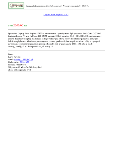 Dane pochodzą ze strony: http://infogorzow.pl/. Wygenerowano dnia: 01-03-2017. Laptop Acer Aspire 5742G Cena:2000,00 pln Sprzedam Laptop Acer Aspire 5742G z parametrami : pamięć ram: 3gb procesor: Intel Core i3-370M karta graficzna: Nvidia GeForce GT 420M pamięć: 500gb monitor: 15.6 HD LED LCD panoramiczny (16:9) dodatkowo laptop ma bardzo ładną obudowę na której nie widać śladów palców a przy tym ładnie wygląda oraz klawiaturę numeryczną boczną po bardziej szczegółowe dane, zdjęcia laptopa i ewentualne zobaczenie produktu proszę o kontakt pod nr gadu-gadu: 26561632 albo e-mail: [email protected] Stan produktu: jak nowy !!! Dane: Karol Jarocki email: [email protected] Gadu-gadu: 26561632 telefon: 531316656 Miejscowość: Gorzów Wielkopolski ulica: Mikołajczyka 6/12