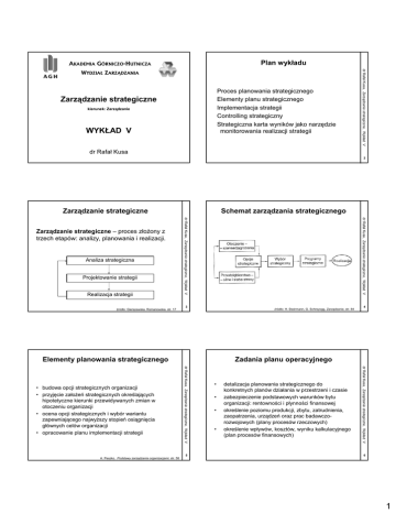 Plan wykładu AKADEMIA GÓRNICZO-HUTNICZA Proces planowania strategicznego Elementy planu strategicznego Implementacja strategii Controlling strategiczny Strategiczna karta wyników jako narzędzie monitorowania realizacji strategii Zarządzanie strategiczne kierunek: Zarządzanie WYKŁAD V dr Rafał Kusa, Zarządzanie strategiczne, Wykład V WYDZIAŁ ZARZĄDZANIA dr Rafał Kusa 2 Zarządzanie strategiczne Projektowanie strategii Realizacja strategii dr Rafał Kusa, Zarządzanie strategiczne, Wykład V Analiza strategiczna dr Rafał Kusa, Zarządzanie strategiczne, Wykład V Zarządzanie strategiczne – proces złoŜony z trzech etapów: analizy, planowania i realizacji. Schemat zarządzania strategicznego 3 źródło: H. Steinmann, G. Schreyogg, Zarządzanie, str. 84 źródło: Gierszewska, Romanowska, str. 17 Elementy planowania strategicznego Zadania planu operacyjnego 5 • • • • detalizacja planowania strategicznego do konkretnych planów działania w przestrzeni i czasie zabezpieczenie podstawowych warunków bytu organizacji: rentowności i płynności finansowej określenie poziomu produkcji, zbytu, zatrudnienia, zaopatrzenia, urządzeń oraz prac badawczorozwojowych (plany procesów rzeczowych) określenie wpływów, kosztów, wyniku kalkulacyjnego (plan procesów finansowych) dr Rafał Kusa, Zarządzanie strategiczne, Wykład V dr Rafał Kusa, Zarządzanie strategiczne, Wykład V • budowa opcji strategicznych organizacji • przyjęcie załoŜeń strategicznych określających hipotetyczne kierunki przewidywanych zmian w otoczeniu organizacji • ocena opcji strategicznych i wybór wariantu zapewniającego najwyŜszy stopień osiągnięcia głównych celów organizacji • opracowanie planu implementacji strategii 4 6 A. Peszko, Podstawy zarządzania organizacjami, str. 58 1 Zarządzanie strategiczne Ciągłość i elastyczność planowania podstawowe pytania strategiczne Ciągłość planowania – planowanie operacyjne musi zabezpieczać realizację obowiązującej strategii Elastyczność planowania – gwarantuje szybką weryfikację planu, jeśli zmiany w otoczeniu i samym przedsiębiorstwie powodują niewydolność obowiązującej strategii 7 źródło: A. Peszko, Podstawy zarządzania organizacjami, str. 60 Planowanie strategiczne Planowanie strategiczne parametry systemu planowania strategicznego częstotliwość planowania • planowanie cykliczne – planowanie obejmuje zawsze taki sam okres (np. 5 lat), a stworzony plan jest corocznie poddawany rewizji • planowanie ewolucyjne (kroczące) – plany budowane są poprzez modyfikacje wcześniej przyjętych, będących w trakcie realizacji planów • planowanie pobudzane – raz zatwierdzony plan nie jest modyfikowany aŜ do czasu, gdy pojawi się taka potrzeba 9 por.: Strategor, Zarządzanie firmą, str. 427 modele planowania strategicznego według J. Brabeta i M. Klema • funkcje decyzyjne – formalizowanie procesów podejmowania decyzji strategicznych – tworzenie zapasowych baz danych, prognoz i kompetencji – koordynowanie decyzji • funkcje pilotaŜowe wobec zmian strategicznych – umoŜliwienie pracownikom partycypacji w procesach decyzyjnych – wspieranie komunikacji i dostarczanie „wspólnego języka” strategicznego – planowanie jako narządzie wdraŜania strategii • planowanie jako narzędzie władzy – upowszechnianie strategii oficjalnej – tworzenie narzędzia władzy mała partycypacja menadŜerskie ukierunkowanie na organizację menadŜerskie ukierunkowanie na otoczenie kultura strategia identyfikacja z organizacją (wartościami) identyfikacja ze strategią 10 dr Rafał Kusa, Zarządzanie strategiczne, Wykład V Planowanie strategiczne potencjalne funkcje planowania dr Rafał Kusa, Zarządzanie strategiczne, Wykład V Planowanie strategiczne 8 dr Rafał Kusa, Zarządzanie strategiczne, Wykład V źródło: Strategor, Zarządzanie firmą, str. 426 dr Rafał Kusa, Zarządzanie strategiczne, Wykład V • charakter narzędzi wspomagających sformalizowane myślenie strategiczne • częstotliwość ponawiania planowania, tzn. jego aspekt czasowy • powiązanie planowania ze strukturą organizacyjną (jak w organizacji przebiegają procesy planowania) • rola dyrekcji, którą określa sposób inicjowania i stymulowania działań planistycznych • obszary planowania (jak szeroki zakres działalności przedsiębiorstwa jest oficjalnie objęty planowaniem strategicznym) dr Rafał Kusa, Zarządzanie strategiczne, Wykład V źródło: K. Obłój, Strategia organizacji, PWE 2001 dr Rafał Kusa, Zarządzanie strategiczne, Wykład V Fundamentalnymi pytaniami strategicznymi, które pomagają zrozumieć, czy i jak firma oferuje odbiorcom zaspokojenie ich potrzeb są pytania o: • sens istnienia firmy dzisiaj i jej wizję funkcjonowania w przyszłości • rynki i produkty • dominujący model działania wysoka partycypacja źródło: Strategor, Zarządzanie firmą, str. 436-440 11 12 źródło: Krupski (red.), Zarządzanie strategiczne, str. 340 2 Planowanie strategiczne Planowanie strategiczne podstawowe podejścia formowanie strategii wysoka wysoka model przedsiębiorczy model planujący model negocjacyjny model partycypacyjny niska źródło: Krupski (red.), Zarządzanie strategiczne, str. 341 13 Formowanie strategii to stopniowe określanie jej treści w trakcie procesów zachodzących w ramach ograniczeń wewnętrznych i zewnętrznych. Zwykle nie ma on wyraźnie określonego początku i końca. W jego trakcie bieŜące działania strategiczne są częściowo określone przez poprzednie, same zaś warunkują działania przyszłe. Dokonana alokacja zasobów jest faktem w znacznym stopniu nieodwracalnym. Podjęcie jednego projektu oznacza wyrzeczenie się innych, chociaŜ w ostateczności zasoby wytworzone przez ten projekt mogą zostać wykorzystane do podjęcia innych. źródło: Strategor, Zarządzanie firmą, str. 485-488 Planowanie strategiczne Planowanie strategiczne formowanie 