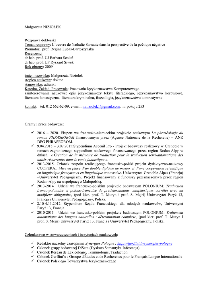 Małgorzata NIZIOŁEK Rozprawa doktorska Temat rozprawy: L’oeuvre de Nathalie Sarraute dans la perspective de la poétique négative Promotor: prof. Regina Lubas-Bartoszyńska Recenzenci: dr hab. prof. UJ Barbara Sosień dr hab. prof. UP Ryszard Siwek Rok obrony: 2009 imię i nazwisko: Małgorzata Niziołek stopień naukowy: doktor stanowisko: adiunkt Katedra, Zakład, Pracownia: Pracownia Językoznawstwa Komputerowego zainteresowania naukowe: opis językoznawczy tekstu literackiego, językoznawstwo korpusowe, literatura fantastyczna, literatura kryminalna, frazeologia, językoznawstwo kontrastywne kontakt: tel: 012 662-62-09, e-mail: [email protected], nr pokoju 253 Granty i prace badawcze: 2016 – 2020. Ekspert we francusko-niemieckim projekcie naukowym La phraséologie du roman PHRASEOROM finansowanym przez (Agence Nationale de la Recherche) – ANR DFG PHRASEOROM. 9.04.2015 – 3.07.2015:Stypendium Acceuil Pro - Projekt badawczy realizowy w Grenoble w ramach zagranicznego stypendium naukowego finansowanego przez region Rodan-Alpy w dniach « Création de la mémoire de traduction pour la traduction semi-automatique des unités récurrentes dans le conte fantastique ». 2013-2015. Członek zespołu realizującego francusko-polski projekt dydaktyczno-naukowy COOPERA:: Mise en place d’un double diplôme de master et d’une coopération scientifique en linguistique française et en linguistique contrastive. Uniwersytet Grenoble Alpes (Francja) –Uniwersytet Pedagogiczny. Projekt finansowany z funduszy przeznaczonych przez region Rodan-Alpy na współpracę z Małopolską. 2013-2014 : Udział we francusko-polskim projekcie badawczym POLONIUM: Traduction franco-polonaise et polono-française de prédeterminants cataphoriques corrélés avec un modifieur obligatoire, (pod kier. prof. T. Muryn i prof. S. Mejri) Uniwersytet Paryż 13, Francja i Uniwersytet Pedagogiczny, Polska. 2.10-4.11.2012. Stypendium Rządu Francuskiego dla młodych naukowców, Uniwersytet Paryż 13, Francja. 2010-2011 : Udział we francusko-polskim projekcie badawczym POLONIUM: Traitement automatique des langues naturelles : détermination complexe, (pod kier. prof. T. Muryn i prof. S. Mejri) Uniwersytet Paryż 13, Francja i Uniwersytet Pedagogiczny, Polska. Członkostwo w stowarzyszeniach i instytucjach naukowych: Redaktor naczelny czasopisma Synergies Pologne : https://gerflint.fr/synergies-pologne Członek grupy badawczej DiSem (Dyskurs Semantyka Inferencja) Członek Réseau de Lexicologie, Terminologie, Traduction Członek Gerflint’u : Groupe d'Études et de Recherches pour le Français Langue Internationale Członek Polskiego Towarzystwa Językoznawczego Organizacja konferencji naukowych Członek komitetu organizacyjnego międzynarodowej konferencji Członek komitetu organizacyjnego międzynarodowej konferencji Europhras, 10-12 września 2014, Paryż. Członek komitetu organizacyjnego międzynarodowego spotkania naukowego « Littérature et phraséologie », 16-17 listopada 2012, Kraków Członek komitetu organizacyjnego międzynarodowej konferencji Phraséologie et littérature, Kraków, 17-18 czerwca 2012. Członek komitetu organizacyjnego IV konferencji międzynarodowej: L’Europe des Langues et des Cultures, L’inférence, la parabole et l’ellipse, Cracovie, 7-10 czerwca. 2010 Udział w konferencjach naukowych krajowych i zagranicznych: 18 października 2016. Kraków. Międzynarodowa konferencja : De la phraséologie aux genres textuels : état des recherches et perspectives méthodologiques . Tytuł referatu: « On, quelque chose, cela – comment décrire l’immontrable? » / Tytuł referatu zbiorowego : « Roman policier : l’autopsie ». 12-14 października 2016. Katowice. Literatura popularna 3: Kryminał. Tytuł referatu zbiorowego : Model leksykalno-składniowy scen zbrodni. (grupa badawcza DiSem: Muryn, T., Niziołek, M., Hajok, A., Prażuch, W., Gabrysiak, K.) 4-8 lipca 2016, Tours ( Francja). V Światowy kongres językoznawstwa francuskiego, Tytuł wystąpienia : La Matrice lexico-syntaxique du roman policier (grupa badawcza DiSem: Muryn, T., Niziołek, M., Hajok, A., Prażuch, W., Gabrysiak, K.) 21-23 kwietnia 2016, Opole. « La Perception en langue et en discours ». Tytuł wystąpienia : Perception brouillée dans les textes fantastiques à l’exemple des verbes de perception (perception auditive, perception visuelle et perception tactile) » oraz Referat zbiorowy : « Perception stéréotypée des personnages normatifs dans le roman policier : analyse lexicosyntaxique » 27 maja 2016, Paryż ( Francja). Universytet Paryż 3 Sorbonne Nouvelle. Spotkanie naukowe : « Notion de motif » 19 października 2015. Grenoble (Francja). La Journée phraséologique franco-polonaise. Tytuł referatu : « Pour une analyse phraséologique du roman policier » (Muryn, T, Niziołek. M.) 28-29 września 2015. Kielce. LXXIII Zjazd PTJ – Granice interpretacji lingwistycznej. Tytuł referatu: „Jednostki powtarzalne i sekwencje znaczące w dziewiętnastowiecznej literaturze fantastycznej”. 24-25 września 2015. Białystok. Tekstowe światy fantastyki. Tytuł referatu: „Język wobec fantastycznej niewyrażalności” . 23-25 kwietnia 2015. Lublin. Międzynarodowa koferencja : Les émotions et les valeurs dans la communication. Tytuł referatu : « Un crescendo des affects dans la littérature fantastique du XIXe siècle – entre créativité et marquage phraséologique (figement) » 19 maja 2015, Valence (Francja). Université Joseph Fourrier. Spotkanie naukowe LIDILEM, Valoriser et développer les outils autour des corpus dans une perspective didactique, Enhancing and extending corpora and corpora tools for learning and 5 marca 2014, Warszawa. Muryn, T., Niziołek, M. « Spotkanie naukowe. Quantification et intensification – différents aspects ». Tytuł wystąpienia : Ce café me réveille ou l’intensification inférée. 20-21 marca 2014, Poznań, Discours après l’an 2000. Tytuł refera