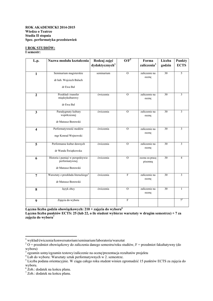 ROK AKADEMICKI 2014-2015 Wiedza o Teatrze Studia II stopnia Spec. performatyka przedstawień I ROK STUDIÓW: I semestr: L.p. Nazwa modułu kształcenia Rodzaj zajęć dydaktycznych1 O/F2 Forma zaliczenia3 Liczba godzin Punkty ECTS 1 Seminarium magisterskie seminarium O zaliczenie na ocenę 30 5 ćwiczenia O zaliczenie na ocenę 30 3 ćwiczenia O zaliczenie na ocenę 30 3 ćwiczenia O zaliczenie na ocenę 30 3 ćwiczenia O zaliczenie na ocenę 30 3 ćwiczenia O ocena za pracę pisemną 30 4 ćwiczenia F zaliczenie na ocenę 30 3 ćwiczenia O zaliczenie na ocenę 30 1 dr hab. Wojciech Baluch dr Ewa Bal 2 Przekład i transfer międzykulturowy dr Ewa Bal 3 Paradygmaty kultury współczesnej dr Mateusz Borowski 4 Performatywność mediów mgr Konrad Wojnowski 5 Performanse kultur dawnych dr Wanda Świątkowska 6 Historia i pamięć w perspektywie performatywnej dr Mateusz Borowski 7 Warsztaty z przekładu literackiego4 dr Mateusz Borowski 8 Język obcy 9 Zajęcia do wyboru F 75 Łączna liczba godzin obowiązkowych: 210 + zajęcia do wyboru6 Łączna liczba punktów ECTS: 25 (lub 22, o ile student wybierze warsztaty w drugim semestrze) + 7 za zajęcia do wyboru7 1 wykład/ćwiczenia/konwersatorium/seminarium/laboratoria/warsztat O = przedmiot obowiązkowy do zaliczenia danego semestru/roku studiów, F = przedmiot fakultatywny (do wyboru) 3 egzamin ustny/egzamin testowy/zaliczenie na ocenę/prezentacja rezultatów projektu 4 Lub do wyboru: Warsztaty sztuk performatywnych w 2. semestrze. 5 Liczba podana orientacyjnie. W ciągu całego roku student winien zgromadzić 15 punktów ECTS za zajęcia do wyboru. 6 Zob.: dodatek na końcu planu. 7 Zob.: dodatek na końcu planu. 2 II semestr: L.p. Nazwa modułu kształcenia Rodzaj zajęć dydaktycznych O/F Forma zaliczenia Liczba godzin Punkty ECTS 1 Seminarium magisterskie seminarium O zaliczenie na ocenę 30 5 ćwiczenia O egzamin ustny 30 4 ćwiczenia O egzamin ustny 30 4 ćwiczenia O zaliczenie na ocenę 30 3 ćwiczenia O zaliczenie na ocenę 30 3 ćwiczenia F zaliczenie na ocenę 30 3 ćwiczenia O zaliczenie na ocenę 30 1 dr hab. Wojciech Baluch dr Ewa Bal Przekład i transfer międzykulturowy 2 dr Ewa Bal 3 Paradygmaty kultury współczesnej dr Mateusz Borowski 4 Performatywność mediów dr hab. Wojciech Baluch Performanse kultur pozaeuropejskich 5 dr Wanda Świątkowska 6 Warsztaty sztuk performatywnych8 mgr Małgorzata Jabłońska 7 Język obcy 8 Zajęcia do wyboru 89 F Łączna liczba godzin: 210 + zajęcia do wyboru Łączna liczba punktów ECTS: 23 (lub 20, o ile student wybierze warsztaty w 1. semestrze) + 8 za zajęcia do wyboru II ROK STUDIÓW: III semestr: L.p. Nazwa modułu kształcenia Rodzaj zajęć dydaktycznych O/F Forma zaliczenia Liczba godzin Punkty ECTS 1 Seminarium magisterskie seminarium O zaliczenie na ocenę 30 12 prof. dr hab. Dariusz Kosiński dr Mateusz Borowski 8 Lub, do wyboru: Warsztaty z przekładu literackiego w 1. semestrze. Liczba podana orientacyjnie. W ciągu całego roku student winien zgromadzić 15 punktów ECTS za zajęcia do wyboru. 9 2 Teorie tożsamości indywidualnych i kolektywnych ćwiczenia O zaliczenie na ocenę 30 3 ćwiczenia O ocena za pracę pisemną 30 6 ćwiczenia F zaliczenie na ocenę 30 3 dr Łucja Iwanczewska 3 Performatywność przedstawień i tekstów dr Łucja Iwanczewska 4 Warsztaty z przekładu tekstów naukowych10 prof. dr hab. Małgorzata Sugiera 5 Zajęcia do wyboru 711 F Łączna liczba godzin: 120 + zajęcia do wyboru Łączna liczba punktów ECTS: 24 (lub 21, jeśli student wybierze warsztaty w 4. semestrze) + 7 za zajęcia do wyboru IV semestr: L.p. Nazwa modułu kształcenia Rodzaj zajęć dydaktycznych O/F Forma zaliczenia Liczba godzin Punkty ECTS 1 Seminarium magisterskie seminarium O egzamin i obrona pracy 30 15 ćwiczenia O zaliczenie na ocenę 30 3 ćwiczenia O zaliczenie na ocenę 30 3 ćwiczenia F zaliczenie na ocenę 30 3 prof. dr hab. Dariusz Kosiński dr Mateusz Borowski 2 Teorie tożsamości indywidualnych i kolektywnych dr Łucja Iwanczewska 3 Normy kulturowe i ich subwersje dr Ewa Bal 4 Warsztaty organizacji wydarzeń kulturalnych12 mgr Anna Królica 5 Zajęcia do wyboru F 813 Łączna liczba godzin obowiązkowych: 60 + zajęcia do wyboru Łączna liczba punktów ECTS: 24 (lub 21, jeśli student wybierze warsztaty w 3. semestrze) + 8 za zajęcia do wyboru Zajęcia do wyboru obowiązkowe do zaliczenia w ciągu dwóch lat studiów: Liczba Punkty Forma 10 Lub, do wyboru: Warsztaty organizacji wydarzeń kulturalnych w 4. semestrze. Liczba podana orientacyjnie. W ciągu całego roku student winien zgromadzić 15 punktów ECTS za zajęcia do wyboru. 12 Lub do wyboru: Warsztaty z przekładu tekstów naukowych w 3. semestrze. 13 Liczba podana orientacyjnie. W ciągu całego roku student winien zgromadzić 15 punktów ECTS za zajęcia do wyboru. 11 godzin ECTS zalicz. Opcja 1 60 6 egz. Opcja 2 60 6 egz. Opcja 3 60 6 egz Wykład monograficzny 30 2 zal. Kurs w języku obcym 30 3 zal. Warsztat performatyczny 1 60 4 zal. Warsztat performatyczny 2 60 4 zal. 360 30 Liczba godzin do wyboru łącznie: 360 godzin (30 punktów ECTS) Z opcji co najmniej jedna powinna być opcją performatyczną (60 godzin). Opcje, wykład monograficzny, warsztaty performatyczne i kurs w języku obcym student wybiera po konsultacji z prowadzącym seminarium magisterskie. Łączna liczba godzin zajęć obowiązkowych i zajęć do wyboru na dwóch latach studiów: 960 godzin (120 punktów ECTS) Uwaga: Studenci I roku mają możliwość zaliczania wybranych zajęć obowiązkowych także z II roku studiów po konsultacji z prowadzącym seminarium magisterskie I. SYLABUSY ZAJĘĆ I ROKU: Nazwa Wydziału Wydział Polonistyki Nazwa jednostki prowadzącej moduł Katedra Performatyki Nazwa modułu kształcenia Seminarium magisterskie „Praca dramaturga jako źródło nowych paradygmatów w twórczości współczesnej” Kod modułu Przypisywany przez dziekanat Język kształcenia polski Efekty kształcenia dl