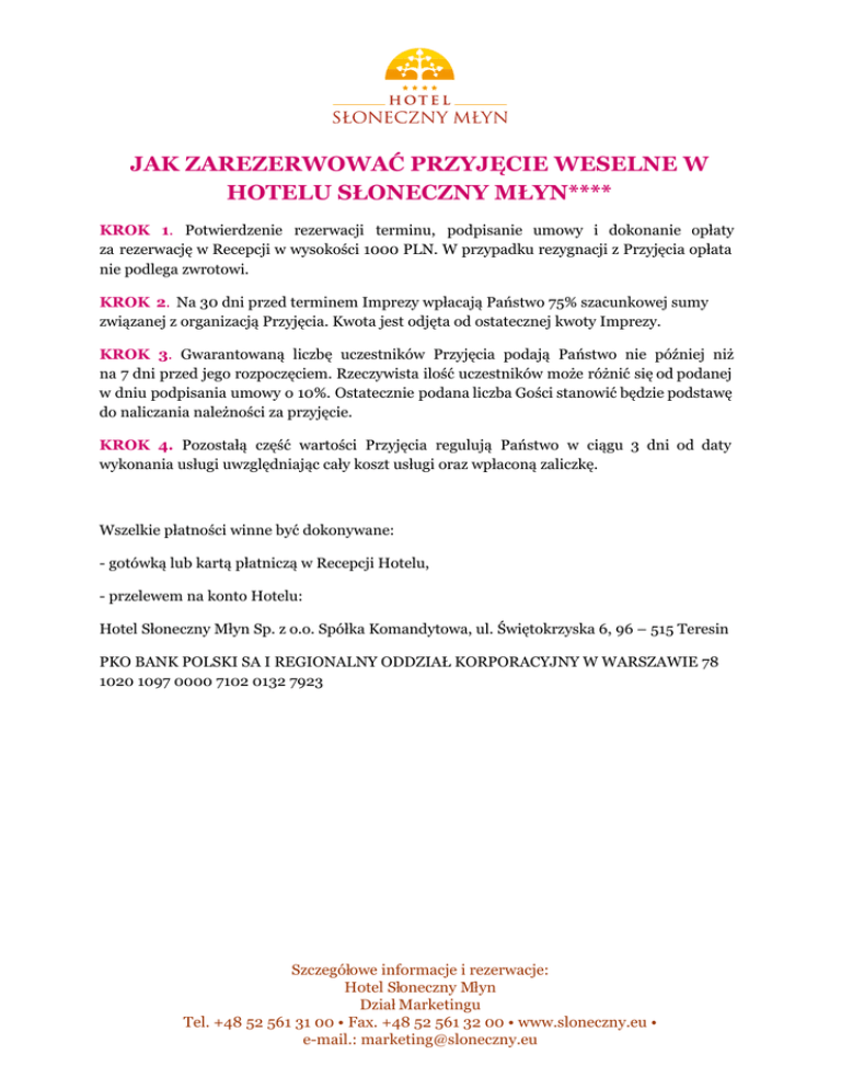 JAK ZAREZERWOWAĆ PRZYJĘCIE WESELNE W HOTELU SŁONECZNY MŁYN**** KROK 1. Potwierdzenie rezerwacji terminu, podpisanie umowy i dokonanie opłaty za rezerwację w Recepcji w wysokości 1000 PLN. W przypadku rezygnacji z Przyjęcia opłata nie podlega zwrotowi. KROK 2. Na 30 dni przed terminem Imprezy wpłacają Państwo 75% szacunkowej sumy związanej z organizacją Przyjęcia. Kwota jest odjęta od ostatecznej kwoty Imprezy. KROK 3. Gwarantowaną liczbę uczestników Przyjęcia podają Państwo nie później niż na 7 dni przed jego rozpoczęciem. Rzeczywista ilość uczestników może różnić się od podanej w dniu podpisania umowy o 10%. Ostatecznie podana liczba Gości stanowić będzie podstawę do naliczania należności za przyjęcie. KROK 4. Pozostałą część wartości Przyjęcia regulują Państwo w ciągu 3 dni od daty wykonania usługi uwzględniając cały koszt usługi oraz wpłaconą zaliczkę. Wszelkie płatności winne być dokonywane: - gotówką lub kartą płatniczą w Recepcji Hotelu, - przelewem na konto Hotelu: Hotel Słoneczny Młyn Sp. z o.o. Spółka Komandytowa, ul. Świętokrzyska 6, 96 – 515 Teresin PKO BANK POLSKI SA I REGIONALNY ODDZIAŁ KORPORACYJNY W WARSZAWIE 78 1020 1097 0000 7102 0132 7923 Szczegółowe informacje i rezerwacje: Hotel Słoneczny Mł yn Dział Marketingu Tel. +48 52 561 31 00 • Fax. +48 52 561 32 00 • www.sloneczny.eu • e-mail.: [email protected] BEZPOŚREDNI KONTAKT: MARKETING: Karolina Przybylska Specjalista ds. Marketingu [email protected] tel. +48 52 561 31 61 tel. kom. + 48 723 66 95 34 Sylwia Gładkowska Manager ds. Marketingu [email protected] tel. +48 52 561 31 60 tel. kom. + 48 723 66 96 29 TWOJE NOTATKI: Szczegółowe informacje i rezerwacje: Hotel Słoneczny Mł yn Dział Marketingu Tel. +48 52 561 31 00 • Fax. +48 52 561 32 00 • www.sloneczny.eu • e-mail.: [email protected]