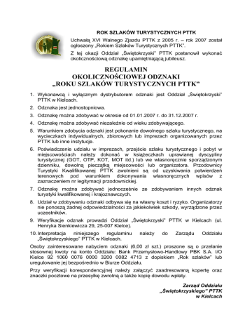ROK SZLAKÓW TURYSTYCZNYCH PTTK Uchwałą XVI Walnego Zjazdu PTTK z 2005 r. – rok 2007 został ogłoszony „Rokiem Szlaków Turystycznych PTTK”. Z tej okazji Oddział „Świętokrzyski” PTTK postanowił wykonać okolicznościową odznakę upamiętniającą jubileusz. REGULAMIN OKOLICZNOŚCIOWEJ ODZNAKI „ROKU SZLAKÓW TURYSTYCZNYCH PTTK” 1. Wykonawcą i wyłącznym dystrybutorem odznaki jest Oddział „Świętokrzyski” PTTK w Kielcach. 2. Odznaka jest jednostopniowa. 3. Odznakę można zdobywać w okresie od 01.01.2007 r. do 31.12.2007 r. 4. Odznakę można zdobywać niezależnie od wieku zdobywającego. 5. Warunkiem zdobycia odznaki jest pokonanie dowolnego szlaku turystycznego, na wycieczkach indywidualnych, zbiorowych lub imprezach organizowanych przez PTTK lub inne instytucje. 6. Poświadczenie udziału w imprezach, przejście szlaku turystycznego i pobyt w miejscowościach należy dokonać w książeczkach uprawianej dyscypliny turystycznej (GOT, OTP, KOT, MOT itd.) lub we własnoręcznie sporządzonym dzienniku, dowolną pieczątką miejscowości lub organizatora. Przodownicy Turystyki Kwalifikowanej PTTK zwolnieni są od uzyskiwania potwierdzeń terenowych pod warunkiem dokonywania własnoręcznych wpisów z zaznaczeniem nr legitymacji przodownickiej. 7. Odznakę można zdobywać jednocześnie ze zdobywaniem innych odznak turystyki kwalifikowanej i krajoznawczych. 8. Udział w zdobywaniu odznaki odbywa się na własny koszt i ryzyko. Organizatorzy nie ponoszą żadnej odpowiedzialności za jakiekolwiek szkody, wyrządzone przez uczestników. 9. Weryfikacje odznak prowadzi Oddział „Świętokrzyski” PTTK w Kielcach (ul. Henryka Sienkiewicza 29, 25-007 Kielce). 10. Interpretacja niniejszego regulaminu „Świętokrzyskiego” PTTK w Kielcach. należy do Zarządu Oddziału Osoby zainteresowane nabyciem odznaki (6,00 zł szt.) proszone są o przelanie stosownej kwoty na konto Oddziału: Bank Przemysłowo-Handlowy PBK S.A. I/O Kielce 92 1060 0076 0000 3200 0082 4713 z dopiskiem „Rok szlaków” lub uregulowanie jej bezpośrednio w Biurze Oddziału. Przy weryfikacji korespondencyjnej należy załączyć zaadresowaną kopertę oraz znaczki pocztowe na przesyłkę zwrotną a także kopię dowodu wpłaty. Zarząd Oddziału „Świętokrzyskiego” PTTK w Kielcach
