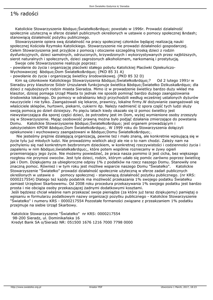 Dom Światełko Godynice k/ Sieradza 1% radości Katolickie Stowarzyszenie „Światełko” powstało w 1996r. Prowadzi działalność społecznie użyteczną w sferze działań publicznych określonych w ustawie o pomocy społecznej – stanowiącą działalność pożytku publicznego. Stowarzyszenie opiera swą działalność na pracy społecznej członków będącej realizacją nauki społecznej Kościoła Rzymsko Katolickiego. Stowarzyszenie nie prowadzi działalności gospodarczej. Celem Stowarzyszenia jest przyjście z pomocą i otoczenie szczególną troską dzieci z rodzin dysfunkcyjnych, dzieci samotnych, odrzuconych, krzywdzonych i wykorzystywanych przez najbliższych, sierot naturalnych i społecznych, dzieci zagrożonych alkoholizmem, narkomanią i prostytucją. Swoje cele Stowarzyszenie realizuje poprzez: - powołanie do życia i organizację placówki stałego pobytu Katolickiej Placówki OpiekuńczoWychowawczej „Dom Światełko” (PKD 85 31 A) - powołanie do życia i organizację świetlicy środowiskowej. (PKD 85 32 D) Kim są członkowie Katolickiego Stowarzyszenia „Światełko”? Od 2 lutego 1991r w Sieradzu przy klasztorze Sióstr Urszulanek funkcjonuje świetlica „Światełko Dzikuska” dla dzieci z najuboższych rodzin miasta Sieradza. Mimo iż w prowadzenie świetlicy bardzo duży wkład ma klasztor, dzisiaj pomaga Urząd Miasta to jednak nie sposób pominąć bardzo dużego zaangażowania środowiska lokalnego. Do pomocy w odrabianiu lekcji przychodzili według wcześniej ustalonych dyżurów nauczyciele i nie tylko. Zaangażowali się lekarze, prawnicy, lokalne firmy.W dożywianie zaangażowali się właściciele sklepów, hurtowni, piekarni, cukierni itp. Należy nadmienić iż spora część tych ludzi służy swoją pomocą po dzień dzisiejszy. Po pięciu latach kiedy okazało się iż pomoc świetlicy jest niewystarczająca dla sporej części dzieci, że potrzebny jest im Dom, wyżej wymienione osoby zrzeszyły się w Stowarzyszenie. Mając osobowość prawną można było podjąć działania zmierzające do powstania Domu. Katolickie Stowarzyszenie „Światełko” jest organem prowadzącym i założycielskim KPOW „Dom Światełko”. W 1999 roku do Stowarzyszenia dołączyli opiekunowie i wychowawcy zaangażowani w „Domu Światełko”. Nie jesteśmy prężnie działającą organizacją, pewnie też i mało znaną, ale konkretnie wpisującą się w życie tylu już młodych ludzi. Nie prowadzimy wielkich akcji ale nie o to nam chodzi. Zależy nam na pochyleniu się nad konkretnym bezbronnym dzieckiem, w konkretnej rzeczywistości i codzienności życia i zapaleniu w nim „światełka”, które potem wspólnie rozniecamy w żywy ogień przemieniający jego życie. Nie możemy powiedzieć, że praca nasza pomimo iż jest cicha, bez większego rozgłosu nie przynosi owoców. Jest tyle dzieci, rodzin, którym udało się pomóc zarówno poprzez świetlicę jak i Dom. Dziękujemy za ubiegłoroczne odpisy 1% z podatków na rzecz naszego Domu. Stanowiły one znaczną pomoc. Również i w tym roku jest możliwe wsparcie naszego Domu "Światełko". Katolickie Stowarzyszenie "Światełko" prowadzi działalność społecznie użyteczną w sferze zadań publicznych określonych w ustawie o pomocy społecznej - stanowiącą działalność pożytku publicznego. (nr KRS: 0000217554) Dlatego też każdy podatnik ma możliwość przekazania 1% swojego podatku Światełku zamiast Urzędowi Skarbowemu. Od 2008 roku procedura przekazywania 1% swojego podatku jest bardzo prosta i nie obciąża osoby przekazującej żadnymi dodatkowymi kosztami. Jeśli będziesz chciał właśnie nam przekazać swoje pieniądze (za które już teraz dziękujemy) pamiętaj o wpisaniu w formularzu podatkowym nazwy organizacji pozytku publicznego - Katolickie Stowarzyszenie "Światełko" i numeru KRS - 0000217554 Pozostałe formaności związane z przeakzaniem 1% podatku przejmuje na siebie Urząd Skarbowy. Katolickie Stowarzyszenie "Światełko" nr KRS: 0000217554 98-200 Sieradz, ul. Dominikańska 16 Kredyt Bank SA o/Sieradz NR: 051500 1676 1216 7000 7798 0000 http://www.swiatelko.org.pl Kreator PDF Utworzono 1 March, 2017, 18:23