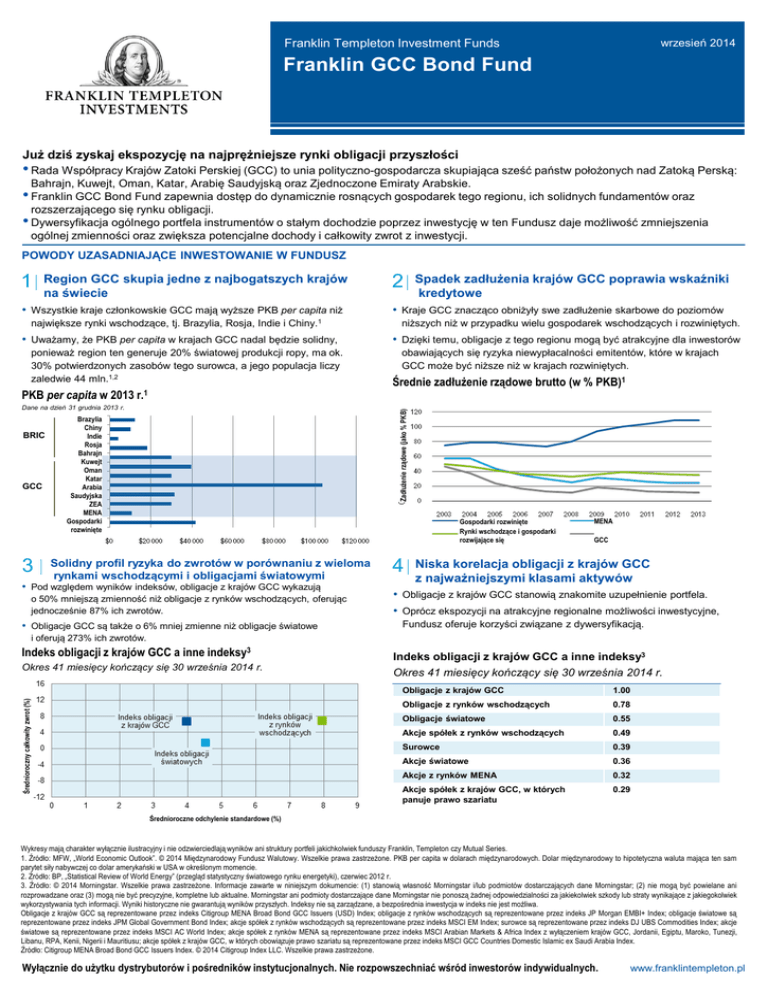 wrzesień 2014 Franklin Templeton Investment Funds Franklin GCC Bond Fund Już dziś zyskaj ekspozycję na najprężniejsze rynki obligacji przyszłości • Rada Współpracy Krajów Zatoki Perskiej (GCC) to unia polityczno-gospodarcza skupiająca sześć państw położonych nad Zatoką Perską: Bahrajn, Kuwejt, Oman, Katar, Arabię Saudyjską oraz Zjednoczone Emiraty Arabskie. • Franklin GCC Bond Fund zapewnia dostęp do dynamicznie rosnących gospodarek tego regionu, ich solidnych fundamentów oraz rozszerzającego się rynku obligacji. • Dywersyfikacja ogólnego portfela instrumentów o stałym dochodzie poprzez inwestycję w ten Fundusz daje możliwość zmniejszenia ogólnej zmienności oraz zwiększa potencjalne dochody i całkowity zwrot z inwestycji. POWODY UZASADNIAJĄCE INWESTOWANIE W FUNDUSZ 1 Region GCC skupia jedne z najbogatszych krajów na świecie • Wszystkie kraje członkowskie GCC mają wyższe PKB per capita niż największe rynki wschodzące, tj. Brazylia, Rosja, Indie i Chiny.1 • Uważamy, że PKB per capita w krajach GCC nadal będzie solidny, ponieważ region ten generuje 20% światowej produkcji ropy, ma ok. 30% potwierdzonych zasobów tego surowca, a jego populacja liczy zaledwie 44 mln.1,2 PKB per capita w 2013 r.1 BRIC GCC 3 Spadek zadłużenia krajów GCC poprawia wskaźniki kredytowe • Kraje GCC znacząco obniżyły swe zadłużenie skarbowe do poziomów niższych niż w przypadku wielu gospodarek wschodzących i rozwiniętych. • Dzięki temu, obligacje z tego regionu mogą być atrakcyjne dla inwestorów obawiających się ryzyka niewypłacalności emitentów, które w krajach GCC może być niższe niż w krajach rozwiniętych. Średnie zadłużenie rządowe brutto (w % PKB)1 Zadłużenie rządowe (jako % PKB) Dane na dzień 31 grudnia 2013 r. 2 Brazylia Chiny Indie Rosja Bahrajn Kuwejt Oman Katar Arabia Saudyjska ZEA MENA Gospodarki rozwinięte Gospodarki rozwinięte Rynki wschodzące i gospodarki rozwijające się Solidny profil ryzyka do zwrotów w porównaniu z wieloma rynkami wschodzącymi i obligacjami światowymi • Pod względem wyników indeksów, obligacje z krajów GCC wykazują o 50% mniejszą zmienność niż obligacje z rynków wschodzących, oferując jednocześnie 87% ich zwrotów. • Obligacje GCC są także o 6% mniej zmienne niż obligacje światowe 4 MENA GCC Niska korelacja obligacji z krajów GCC z najważniejszymi klasami aktywów • Obligacje z krajów GCC stanowią znakomite uzupełnienie portfela. • Oprócz ekspozycji na atrakcyjne regionalne możliwości inwestycyjne, Fundusz oferuje korzyści związane z dywersyfikacją. i oferują 273% ich zwrotów. Indeks obligacji z krajów GCC a inne indeksy3 Average Annual Totalzwrot Return Średnioroczny całkowity (%) (%) Okres 41 miesięcy kończący się 30 września 2014 r. Indeks obligacji z krajów GCC a inne indeksy3 Okres 41 miesięcy kończący się 30 września 2014 r. Obligacje z krajów GCC 1.00 Obligacje z rynków wschodzących 0.78 Obligacje światowe 0.55 Akcje spółek z rynków wschodzących 0.49 Surowce 0.39 Akcje światowe 0.36 Akcje z rynków MENA 0.32 Akcje spółek z krajów GCC, w których panuje prawo szariatu 0.29 Annualised Standard Deviation (%) (%) Średnioroczne odchylenie standardowe Wykresy mają charakter wyłącznie ilustracyjny i nie odzwierciedlają wyników ani struktury portfeli jakichkolwiek funduszy Franklin, Templeton czy Mutual Series. 1. Źródło: MFW, „World Economic Outlook”. © 2014 Międzynarodowy Fundusz Walutowy. Wszelkie prawa zastrzeżone. PKB per capita w dolarach międzynarodowych. Dolar międzynarodowy to hipotetyczna waluta mająca ten sam parytet siły nabywczej co dolar amerykański w USA w określonym momencie. 2. Źródło: BP, „Statistical Review of World Energy” (przegląd statystyczny światowego rynku energetyki), czerwiec 2012 r. 3. Źródło: © 2014 Morningstar. Wszelkie prawa zastrzeżone. Informacje zawarte w niniejszym dokumencie: (1) stanowią własność Morningstar i/lub podmiotów dostarczających dane Morningstar; (2) nie mogą być powielane ani rozprowadzane oraz (3) mogą nie być precyzyjne, kompletne lub aktualne. Morningstar ani podmioty dostarczające dane Morningstar nie ponoszą żadnej odpowiedzialności za jakiekolwiek szkody lub straty wynikające z jakiegokolwiek wykorzystywania tych informacji. Wyniki historyczne nie gwarantują wyników przyszłych. Indeksy nie są zarządzane, a bezpośrednia inwestycja w indeks nie jest możliwa. Obligacje z krajów GCC są reprezentowane przez indeks Citigroup MENA Broad Bond GCC Issuers (USD) Index; obligacje z rynków wschodzących są reprezentowane przez indeks JP Morgan EMBI+ Index; obligacje światowe są reprezentowane przez indeks JPM Global Government Bond Index; akcje spółek z rynków wschodzących są reprezentowane przez indeks MSCI EM Index; surowce są reprezentowane przez indeks DJ UBS Commodities Index; akcje światowe są reprezentowane przez indeks MSCI AC World Index; akcje spółek z rynków MENA są reprezentowane przez indeks MSCI Arabian Markets & Africa Index z wyłączeniem krajów GCC, Jordanii, Egiptu, Maroko, Tunezji, Libanu, RPA, Kenii, Nigerii i Mauritiusu; akcje spółek z krajów GCC, w których obowiązuje prawo szariatu są reprezentowane przez indeks MSCI GCC Countries Domestic Islamic ex Saudi Arabia Index. Źródło: Citigroup MENA Broad Bond GCC Issuers Index. © 2014 Citigroup Index LLC. Wszelkie prawa zastrzeżone. Wyłącznie do użytku dystrybutorów i pośredników instytucjonalnych. Nie rozpowszechniać wśród inwestorów indywidualnych. www.franklintempleton.pl Franklin GCC Bond Fund wrzesień 2014 r. DOSKONAŁA POZYCJA DO ODKRYWANIA MOŻLIWOŚCI INWESTYCYJNYCH NA RYNKACH GCC • Fundusz korzysta z wiedzy lokalnych i globalnych specjalistów ds. inwestowania na rynkach instrumentów o stałym dochodzie. • Mohieddine Kronfol, główny zarządzający portfelem / CIO, zarządzał pierwszym fund