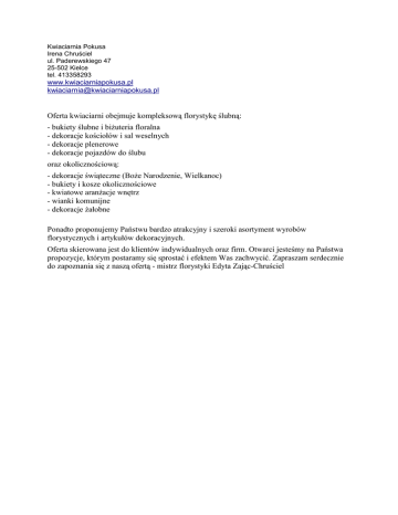 Kwiaciarnia Pokusa Irena Chruściel ul. Paderewskiego 47 25-502 Kielce tel. 413358293 www.kwiaciarniapokusa.pl [email protected] Oferta kwiaciarni obejmuje kompleksową florystykę ślubną: - bukiety ślubne i biżuteria floralna - dekoracje kościołów i sal weselnych - dekoracje plenerowe - dekoracje pojazdów do ślubu oraz okolicznościową: - dekoracje świąteczne (Boże Narodzenie, Wielkanoc) - bukiety i kosze okolicznościowe - kwiatowe aranżacje wnętrz - wianki komunijne - dekoracje żałobne Ponadto proponujemy Państwu bardzo atrakcyjny i szeroki asortyment wyrobów florystycznych i artykułów dekoracyjnych. Oferta skierowana jest do klientów indywidualnych oraz firm. Otwarci jesteśmy na Państwa propozycje, którym postaramy się sprostać i efektem Was zachwycić. Zapraszam serdecznie do zapoznania się z naszą ofertą - mistrz florystyki Edyta Zając-Chruściel