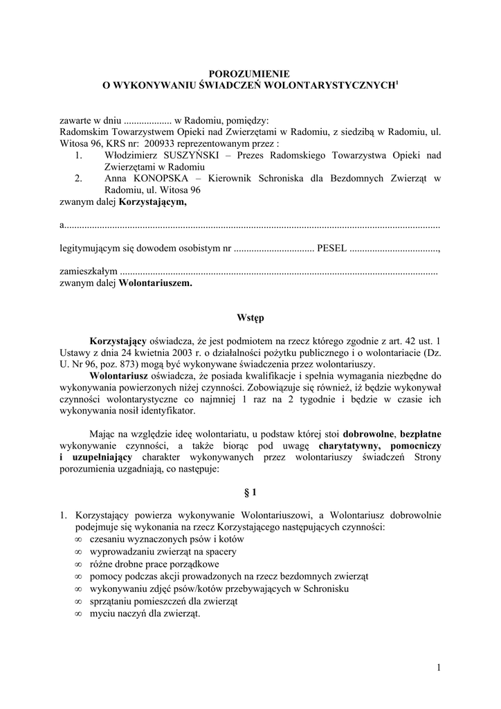 POROZUMIENIE O WYKONYWANIU ŚWIADCZEŃ WOLONTARYSTYCZNYCH1 zawarte w dniu ................... w Radomiu, pomiędzy: Radomskim Towarzystwem Opieki nad Zwierzętami w Radomiu, z siedzibą w Radomiu, ul. Witosa 96, KRS nr: 200933 reprezentowanym przez : 1. Włodzimierz SUSZYŃSKI – Prezes Radomskiego Towarzystwa Opieki nad Zwierzętami w Radomiu 2. Anna KONOPSKA – Kierownik Schroniska dla Bezdomnych Zwierząt w Radomiu, ul. Witosa 96 zwanym dalej Korzystającym, a..................................................................................................................................................... legitymującym się dowodem osobistym nr ................................ PESEL ..................................., zamieszkałym .............................................................................................................................. zwanym dalej Wolontariuszem. Wstęp Korzystający oświadcza, że jest podmiotem na rzecz którego zgodnie z art. 42 ust. 1 Ustawy z dnia 24 kwietnia 2003 r. o działalności pożytku publicznego i o wolontariacie (Dz. U. Nr 96, poz. 873) mogą być wykonywane świadczenia przez wolontariuszy. Wolontariusz oświadcza, że posiada kwalifikacje i spełnia wymagania niezbędne do wykonywania powierzonych niżej czynności. Zobowiązuje się również, iż będzie wykonywał czynności wolontarystyczne co najmniej 1 raz na 2 tygodnie i będzie w czasie ich wykonywania nosił identyfikator. Mając na względzie ideę wolontariatu, u podstaw której stoi dobrowolne, bezpłatne wykonywanie czynności, a także biorąc pod uwagę charytatywny, pomocniczy i uzupełniający charakter wykonywanych przez wolontariuszy świadczeń Strony porozumienia uzgadniają, co następuje: §1 1. Korzystający powierza wykonywanie Wolontariuszowi, a Wolontariusz dobrowolnie podejmuje się wykonania na rzecz Korzystającego następujących czynności: • czesaniu wyznaczonych psów i kotów • wyprowadzaniu zwierząt na spacery • różne drobne prace porządkowe • pomocy podczas akcji prowadzonych na rzecz bezdomnych zwierząt • wykonywaniu zdjęć psów/kotów przebywających w Schronisku • sprzątaniu pomieszczeń dla zwierząt • myciu naczyń dla zwierząt. 1 2. Czynności, o których mowa wyżej będą wykonywane w pod nadzorem pracownika Schroniska §2 1. Strony Umowy uzgadniają, że czynności określone w § 1 będą wykonywane w okresie od ....................... do ....................... . 2. Miejscem wykonywania czynności będzie Schroniska dla Bezdomnych Zwierząt mieszczące się przy ul. Witosa 96 w Radomiu §3 Z uwagi na charakter i ideę wolontariatu: 1. Wolontariusz jest obowiązany wykonywać uzgodnione czynności osobiście; 2. Wolontariusz za swoje czynności nie otrzyma wynagrodzenia. §4 1. Korzystający zobowiązuje się zapewnić Wolontariuszowi bezpieczne i higieniczne warunki wykonywania przez niego świadczeń. 2. Korzystający na czas wykonywania świadczeń przekazuje Wolontariuszowi środki ochrony indywidualnej. §5 Korzystający ma obowiązek ubezpieczyć wolontariusza od następstw nieszczęśliwych wypadków. §6 Korzystający zapewnia wolontariuszowi ubezpieczenie zdrowotne, w terminie ...................dni od dnia zawarcia porozumienia. §7 Korzystający pokrywa, na dotyczących pracowników zasadach określonych w odrębnych przepisach, koszty podróży służbowych i diet Wolontariusza. §8 Wolontariusz zobowiązuje się zachowania w tajemnicy informacji, które uzyskał w związku w wykonywaniem świadczeń na rzecz Korzystającego, a które stanowią tajemnicę Korzystającego. §9 1. Porozumienie może być rozwiązane przez każdą ze Stron za 7 dniowym wypowiedzeniem; 2. Porozumienie może być rozwiązane przez każdą ze Stron bez wypowiedzenia z ważnych przyczyn. 3. Za ważne przyczyny Strony uznają w szczególności: • działanie na szkodę zwierząt przebywających na Schronisku 2 • • • szkodzenie dobremu imieniu Wolontariusza w radomskim schroniska swoim zachowaniem wobec zwierząt w czasie prywatnym wykonywanie czynności wolontarystycznych rzadziej niż 1 raz na 2 tyg. nieuzasadnione niewykonywanie powierzonych zadań § 10 Za wyrządzone szkody strony odpowiadają na zasadach określonych w Kodeksie Cywilnym. § 11 W sprawach nieuregulowanych przepisami Ustawy o działalności pożytku publicznego i o wolontariacie lub niniejszym Porozumieniem zastosowanie będą miały odpowiednie przepisy Kodeksu Cywilnego. § 12 Wszelkie zmiany Porozumienia będą dokonywane w formie pisemnej pod rygorem nieważności. § 13 1. Umowę sporządzono w dwóch jednobrzmiących egzemplarzach, po jednym dla każdej ze Stron; 2. Wolontariusz może w każdym czasie domagać się wydania przez Korzystającego pisemnego zaświadczenia o wykonaniu świadczeń przez Wolontariusza. Zaświadczenie to powinno zawierać informację o zakresie wykonywanych świadczeń. Korzystający Wolontariusz 3 1 Wzór przygotowany w oparciu o ustawę o działalności pożytku publicznego i o wolontariacie z dnia 24 kwietnia 2003 r. (Dz. U. Nr 96, poz. 873)