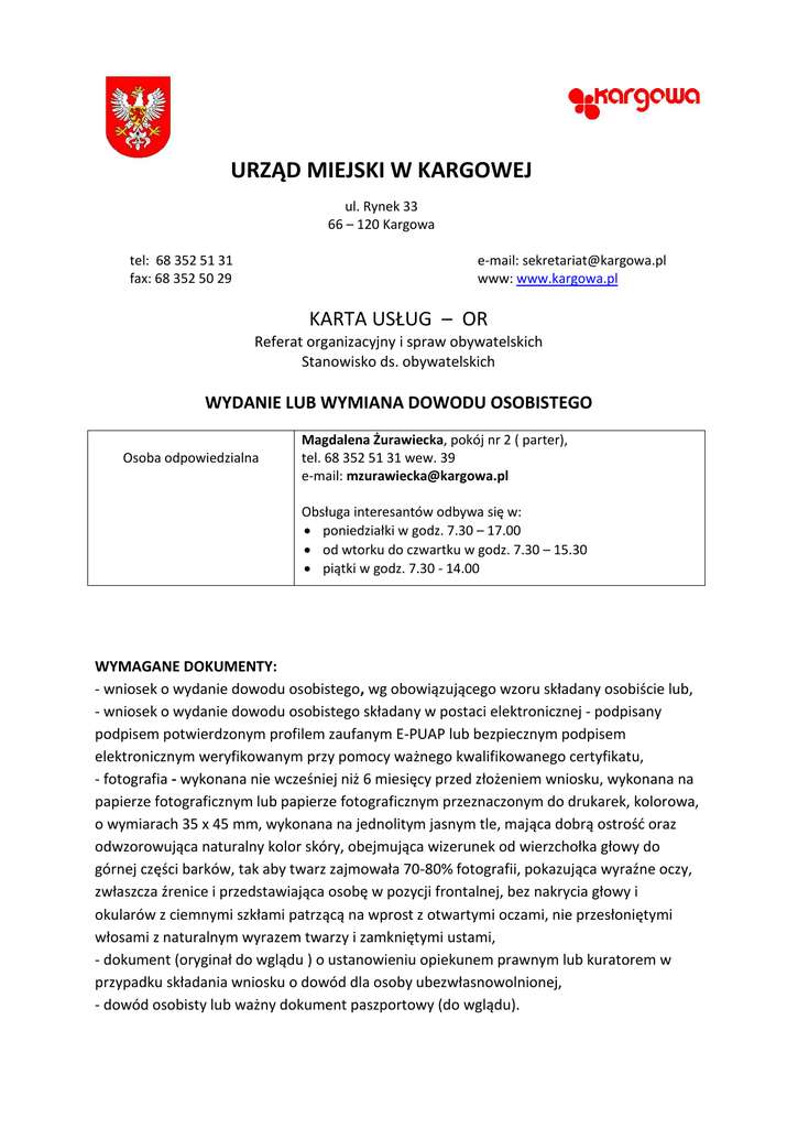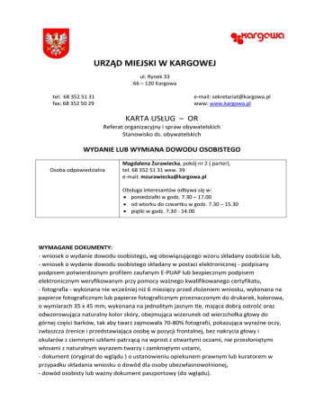 URZĄD MIEJSKI W KARGOWEJ ul. Rynek 33 66 – 120 Kargowa tel: 68 352 51 31 fax: 68 352 50 29 e-mail: [email protected] www: www.kargowa.pl KARTA USŁUG – OR Referat organizacyjny i spraw obywatelskich Stanowisko ds. obywatelskich WYDANIE LUB WYMIANA DOWODU OSOBISTEGO Osoba odpowiedzialna Magdalena Żurawiecka, pokój nr 2 ( parter), tel. 68 352 51 31 wew. 39 e-mail: [email protected] Obsługa interesantów odbywa się w: poniedziałki w godz. 7.30 – 17.00 od wtorku do czwartku w godz. 7.30 – 15.30 piątki w godz. 7.30 - 14.00 WYMAGANE DOKUMENTY: - wniosek o wydanie dowodu osobistego, wg obowiązującego wzoru składany osobiście lub, - wniosek o wydanie dowodu osobistego składany w postaci elektronicznej - podpisany podpisem potwierdzonym profilem zaufanym E-PUAP lub bezpiecznym podpisem elektronicznym weryfikowanym przy pomocy ważnego kwalifikowanego certyfikatu, - fotografia - wykonana nie wcześniej niż 6 miesięcy przed złożeniem wniosku, wykonana na papierze fotograficznym lub papierze fotograficznym przeznaczonym do drukarek, kolorowa, o wymiarach 35 x 45 mm, wykonana na jednolitym jasnym tle, mająca dobrą ostrość oraz odwzorowująca naturalny kolor skóry, obejmująca wizerunek od wierzchołka głowy do górnej części barków, tak aby twarz zajmowała 70-80% fotografii, pokazująca wyraźne oczy, zwłaszcza źrenice i przedstawiająca osobę w pozycji frontalnej, bez nakrycia głowy i okularów z ciemnymi szkłami patrzącą na wprost z otwartymi oczami, nie przesłoniętymi włosami z naturalnym wyrazem twarzy i zamkniętymi ustami, - dokument (oryginał do wglądu ) o ustanowieniu opiekunem prawnym lub kuratorem w przypadku składania wniosku o dowód dla osoby ubezwłasnowolnionej, - dowód osobisty lub ważny dokument paszportowy (do wglądu). TERMIN ZAŁATWIENIA SPRAWY: - do 30 dni SPOSÓB ZAŁATWIENIA SPRAWY - wydanie dowodu osobistego, dokument odbiera się osobiście w miejscu złożenia wniosku. OPŁATY - brak TRYB ODWOŁAWCZY - odwołanie od decyzji o odmowie wydania dowodu osobistego rozpatruje Wojewoda Lubuski adres: Lubuski Urząd Wojewódzki, ul. Jagiellończyka 8, 66-400 Gorzów Wielkopolski, - odwołanie kieruje się do Wojewody za pośrednictwem Burmistrza Kargowej, - termin odwołania: 14 dni od dnia doręczenia decyzji DODATKOWE INFORMACJE - dowód osobisty zobowiązani są posiadać obywatele polscy zamieszkali na terenie Rzeczypospolitej Polskiej od ukończenia 18 lat - pozostali obywatele polscy w tym osoby małoletnie mogą posiadać dowód osobisty - wniosek o wydanie dowodu osobistego można złożyć w dowolnym urzędzie gminy na terenie Polski, - wniosek o wydanie dowodu osobistego dla małoletniego składa jeden z rodziców, lub opiekun prawny . /warunek nie dotyczy małoletnich w okresie 30 dni przed ukończeniem 18 lat / - wniosek o wydanie dowodu osobistego dla osoby ubezwłasnowolnionej całkowicie składa opiekun prawny lub jeden z rodziców gdy pozostaje ona pod włada rodzicielska, - wniosek o wydanie dowodu osobistego dla osoby ubezwłasnowolnionej częściowo składa kurator, - przy składaniu wniosku wymagana jest obecność osoby ubezwłasnowolnionej i małoletniego za wyjątkiem dzieci do lat 5, - osoba, która nie może złożyć wniosku o wydanie dokumentu w urzędzie z uwagi na niepełnosprawność, chorobę lub inne ważne przyczyny może złożyć wniosek w miejscu pobytu, - obowiązek wymiany dowodu powstaje w przypadku: - upływu terminu jego ważności, - zmiany danych zawartych w dokumencie, - zmiany wizerunku twarzy posiadacza dowodu osobistego w stosunku do wizerunku twarzy zamieszczonego w dowodzie osobistym w stopniu utrudniającym lub uniemożliwiającym jego identyfikację, - uszkodzenia dokumentu, - brak realizacji obowiązku wymiany skutkuje unieważnieniem dokumentu. ODBIÓR DOWODU OSOBISTEGO - dowód osobisty odbiera się osobiście z wyjątkiem następujących przypadków: - dowód osobisty osoby ubezwłasnowolnionej całkowicie odbiera opiekun prawny lub jeden z rodziców gdy pozostaje ona pod władzą rodzicielską, - dowód osobisty małoletniego, który nie ukończył 13 lat odbiera jeden z rodziców lub opiekun prawny, - dowód osobisty małoletniego, który ukończył 13 lat odbiera małoletni lub jeden z rodziców, - dowód osobisty osoby ubezwłasnowolnionej częściowo odbiera ta osoba lub kurator ustanowiony przez sąd, - dowód osobisty osoby, która złożyła wniosek poza urzędem na podstawie art. 26 ust 1 ustawy może odebrać pełnomocnik tej osoby, PODSTAWA PRAWNA _ ustawa z dnia 6 sierpnia 2010r. o dowodach osobistych (Dz. U. z 2010 r. Nr 167, poz. 1131 ), _ rozporządzenie Ministra Spraw Wewnętrznych z dnia 29 stycznia 2015 r. w sprawie wzoru dowodu osobistego oraz sposobu i trybu postępowania w sprawach wydawania dowodów osobistych, ich utraty, uszkodzenia, unieważnienia i zwrotu (Dz. U. z 2015 r. poz. 212),