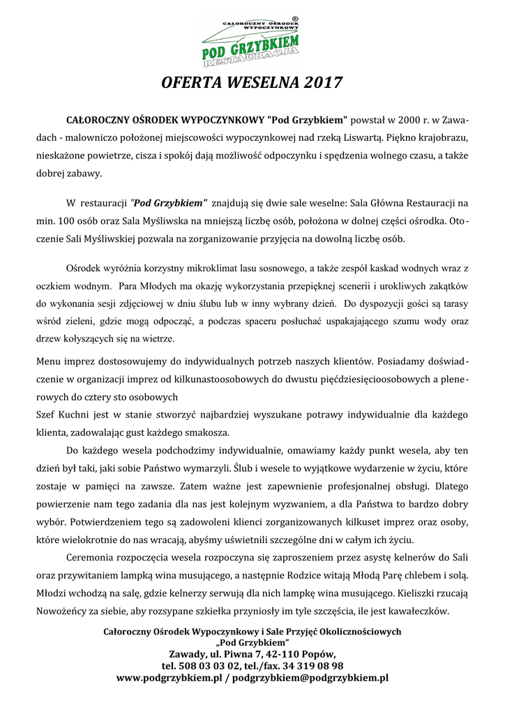 OFERTA WESELNA 2017 CAŁOROCZNY OŚRODEK WYPOCZYNKOWY "Pod Grzybkiem" powstał w 2000 r. w Zawadach - malowniczo położonej miejscowości wypoczynkowej nad rzeką Liswartą. Piękno krajobrazu, nieskażone powietrze, cisza i spokój dają możliwość odpoczynku i spędzenia wolnego czasu, a także dobrej zabawy. W restauracji "Pod Grzybkiem" znajdują się dwie sale weselne: Sala Główna Restauracji na min. 100 osób oraz Sala Myśliwska na mniejszą liczbę osób, położona w dolnej części ośrodka. Oto czenie Sali Myśliwskiej pozwala na zorganizowanie przyjęcia na dowolną liczbę osób. Ośrodek wyróżnia korzystny mikroklimat lasu sosnowego, a także zespół kaskad wodnych wraz z oczkiem wodnym. Para Młodych ma okazję wykorzystania przepięknej scenerii i urokliwych zakątków do wykonania sesji zdjęciowej w dniu ślubu lub w inny wybrany dzień. Do dyspozycji gości są tarasy wśród zieleni, gdzie mogą odpocząć, a podczas spaceru posłuchać uspakajającego szumu wody oraz drzew kołyszących się na wietrze. Menu imprez dostosowujemy do indywidualnych potrzeb naszych klientów. Posiadamy doświad czenie w organizacji imprez od kilkunastoosobowych do dwustu pięćdziesięcioosobowych a plene rowych do cztery sto osobowych Szef Kuchni jest w stanie stworzyć najbardziej wyszukane potrawy indywidualnie dla każdego klienta, zadowalając gust każdego smakosza. Do każdego wesela podchodzimy indywidualnie, omawiamy każdy punkt wesela, aby ten dzień był taki, jaki sobie Państwo wymarzyli. Ślub i wesele to wyjątkowe wydarzenie w życiu, które zostaje w pamięci na zawsze. Zatem ważne jest zapewnienie profesjonalnej obsługi. Dlatego powierzenie nam tego zadania dla nas jest kolejnym wyzwaniem, a dla Państwa to bardzo dobry wybór. Potwierdzeniem tego są zadowoleni klienci zorganizowanych kilkuset imprez oraz osoby, które wielokrotnie do nas wracają, abyśmy uświetnili szczególne dni w całym ich życiu. Ceremonia rozpoczęcia wesela rozpoczyna się zaproszeniem przez asystę kelnerów do Sali oraz przywitaniem lampką wina musującego, a następnie Rodzice witają Młodą Parę chlebem i solą. Młodzi wchodzą na salę, gdzie kelnerzy serwują dla nich lampkę wina musującego. Kieliszki rzucają Nowożeńcy za siebie, aby rozsypane szkiełka przyniosły im tyle szczęścia, ile jest kawałeczków. Całoroczny Ośrodek Wypoczynkowy i Sale Przyjęć Okolicznościowych „Pod Grzybkiem” Zawady, ul. Piwna 7, 42-110 Popów, tel. 508 03 03 02, tel./fax. 34 319 08 98 www.podgrzybkiem.pl / [email protected] Propozycja Menu Obiad: Pierwsze Danie: Rosół na kurze wiejskiej z makaronem z jaj przepiórczych Drugie Danie: Roladki wieprzowe w ciemnym sosie Schab panierowany Kotlet de Volaile z masłem i natką pietruszki Podudzia i pałeczki z kurczaka Szwajcar z serem i szynką (Serwujemy po ok. 3,5 porcje mięsne na osobę) Ziemniaki z masłem koperkowym Kluski śląskie Sos pieczeniowy Bukiet Świeżych Surówek (3 rodzaje) Kapusta zasmażana Kawa/herbata ( podawane na życzenie oraz po każdym posiłku) Deser lodowy Owoce/cukierki Zimne przekąski : Deska mięs pieczonych Schab pieczony w duecie śliwki i moreli w galarecie Sałatka grecka z serem feta i sosem Sałatka królewska z serem żółtym i szynką Sałatka z wędzonym kurczakiem Śledź kolorowy w oleju Śledź pod pierzynką Zimne nóżki wieprzowe Ryba po grecku Pieczywo jasne i ciemne Masło Całoroczny Ośrodek Wypoczynkowy i Sale Przyjęć Okolicznościowych „Pod Grzybkiem” Zawady, ul. Piwna 7, 42-110 Popów, tel. 508 03 03 02, tel./fax. 34 319 08 98 www.podgrzybkiem.pl / [email protected] Dania gorące: (1 danie do wyboru z każdej z trzech propozycji) 1. Flaczki/Bogracz/Strogonoff 2. Kieszeń wieprzowa z niespodzianką, frytki lub talarki, surówka/ Cygaro Hawai na warzywach w otoczce dufinek /Szwajcar, frytki,, surówka 3. Krem z pieczarek/Krem z pomidorów z grzanką serową 4. Pieczeń wieprzowa, puree z chrzanem wasabi, sos myśliwski /Szaszłyk drobiowy, ryż z groszkiem cukrowym 5. Barszczyk czerwony z krokietem lub pasztecikiem POPRAWINY Obiad: Żur staropolski z kiełbasą lub/i jajkiem Schab w sosie + (mięso z I dnia) Ziemniaki z masłem koperkowym , pyzy z mięsem Zestaw surówek: kapusta czerwona, kapusta pekińska, marchew tarta Kawa/herbata Owoce Zimne przekąski : Deska mięs pieczonych Schab pieczony w duecie śliwki i moreli w galarecie Sałatka grecka z serem feta i sosem Sałatka królewska z serem żółtym i szynką Sałatka z wędzonym kurczakiem Śledź kolorowy w oleju Śledź pod pierzynką Zimne nóżki wieprzowe Ryba po grecku Pieczywo jasne i ciemne Masło Całoroczny Ośrodek Wypoczynkowy i Sale Przyjęć Okolicznościowych „Pod Grzybkiem” Zawady, ul. Piwna 7, 42-110 Popów, tel. 508 03 03 02, tel./fax. 34 319 08 98 www.podgrzybkiem.pl / [email protected] Dania gorące: (1 danie do wyboru z każdej z propozycji) 1.Gołąbki staropolskie / Gołąbki lwowskie/ Bigos 2.Kieszeń wieprzowa z niespodzianką, frytki, surówka lub Polędwiczki w sosie śmietanowym/grzybowym, warzywa na parze Za dodatkową opłatą: Tort – wg zamówienia, Państwo wybierają jaki tort (www.michas.com.pl) my dobieramy odpowiednią ilość Ciasto - wg zamówienia, Państwo wybierają jakie rodzaje (www.michas.com.pl) my dobieramy odpowiednią ilość – wg spożycia Paczki z ciastem dla gości – wg zamówienia Napoje – Pepsi, Pepsi max, Pepsi light, Mirinda, 7up, tonic Schweppes , woda gazowana, woda niegazowana w dzbankach, soki w dzbankach Alkohole, szampan – wg zamówienia Cena za osobę przy weselu bez poprawin : 187,00 zł + tort, ciasto, paczki + napoje, alkohole + domki Cena za osobę przy weselu z poprawinami : 252,00 zł + tort, ciasto, paczki + napoje, alkohole + domki Całoroczny Ośrodek Wypoczynkowy i Sale Przyjęć Okolicznościowych „Pod Grzybkiem” Zawady, ul. Piwna 7, 42-110 Popów, tel. 508 03 03 02, tel./fax. 34 319 08 98 www.podgrzybkiem.pl / [email prot