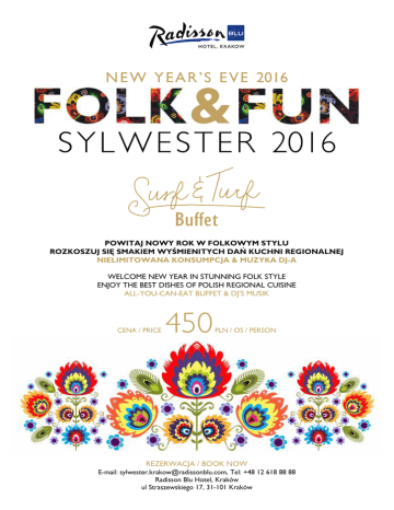 N E W Y E A R S E V E 2016 & S Y L W E S T E R 2016 Buffet POWITAJ NOWY ROK W FOLKOWYM STYLU ROZKOSZUJ SIÊ SMAKIEM WYMIENITYCH DAÑ KUCHNI REGIONALNEJ NIELIMITOWANA KONSUMPCJA & MUZYKA DJ-A WELCOME NEW YEAR IN STUNNING FOLK STYLE ENJOY THE BEST DISHES OF POLISH REGIONAL CUISINE ALL-YOU-CAN-EAT BUFFET & DJS MUSIK CENA / PRICE 450 PLN / OS / PERSON REZERWACJA / BOOK NOW E-mail: [email protected], Tel: +48 12 618 88 88 Radisson Blu Hotel, Kraków ul Straszewskiego 17, 31-101 Kraków MENU PRZEK¥SKI ZIMNE Pier z kaczki staropolskiej sous vide, kruszonka z piernika, marmolada z pomarañczy i chili Pasztet z dzika i perliczki, konfitura ze liwek Studzienina z nó¿ek wieprzowych, piklowane grzyby lene, mix warzyw Filety ze ledzi ba³tyckich w wiejskiej mietanie, piklowana czerwona cebula, galaretka z ogórków Selekcja ryb z w³asnej wêdzarni: jesiotr, turbot, sum ba³tycki, pstr¹g ojcowski, troæ wêdrowna P³yta tradycyjnych wêdlin: kie³basa lisiecka, kie³basa z dzika z rozmarynem, wêdzona w ca³oci noga wieprzowa, kabanosy, pier z indyka sous vide, kindziuk PRZEK¥SKI GOR¥CE Delikatnie opiekane rêcznie robione pierogi z kaczk¹ i boczniakiem Delikatnie opiekane rêcznie robione pierogi z kaszank¹, jab³kiem, tymiankiem i cebulk¹ Mini placki ziemniaczane podane z domowej roboty wêdzonym ³ososiem Mini rogaliki z kapust¹ kiszon¹, grzybami i wêdzon¹ papryk¹ SA£ATKI Mix zielonych sa³at z dodatkami Selekcja domowej roboty smakowych oliw i octów Sa³atka z pieczonych buraczków, m³odego koziego sera, granatu i pra¿onych migda³ów Sa³atka jarzynowa z miêsem z kraba i jajkami przepiórczymi Sa³atka podhalañska z ¿urawinowym winegrette i oscypkiem ZUPY Zupa grzybowa z domowymi kluseczkami Krem z dyni z miêsem gêsi i wêdzonym boczkiem DANIA G£ÓWNE Powoli duszona wo³owina w naturalnym sosie z dodatkiem pieczonych warzyw i sosu chrzanowego Pieczeñ cielêca w sosie naturalnym Ossobuco z jelenia duszone w jarzynach i czerwonym winie Pieczona polêdwiczka wieprzowa w szynce dojrzewaj¹cej, marynowana w niedwiedzim czosnku STACJA Z MIÊSEM DO KROJENIA Pieczone ¿eberka wieprzowe marynowane w miodzie pitnym Pieczona gê nadziewana jab³kami z majerankiem Kulebiak z halibutem, porem i borowikami DODATKI Opiekane kopytka Pieczone ziemniaki z tymiankiem i czosnkiem Pieczone warzywa korzenne z tymiankiem czosnkiem i miodem Fasolka szparagowa i m³oda marchewka gotowana na parze Duszona czerwona kapusta z ¿urawin¹ DESERY Sernik z galaretk¹ z marakui Szarlotka z szar¹ renet¹ Ciasto czekoladowe z winiami Mini tarta z owocami Mini tarta z mas¹ kajmakow¹ Mini beza z musem z owoców lenych NAPOJE Wino domowe bia³e i czerwone Piwo Lampka wina musuj¹cego o pó³nocy Woda mineralna, kawa, herbata Bufet oraz napoje bêd¹ oferowane od godziny 19:30 do 1:00. REZERWACJA / BOOK NOW E-mail: [email protected], Tel: +48 12 618 88 88 Radisson Blu Hotel, Kraków ul Straszewskiego 17, 31-101 Kraków MENU COLD APPETIZERS Sous vide duck breast, gingerbread crumble and orange marmalade with chili Wild boar and guinea fowl pate served with plum chutney Pork rillettes with pickled mushrooms and vegetables Baltic herring with sour cream, pickled red onions, and pickled cucumbers jelly Selection of Polish homemade smoked fish: sturgeon, turbot, catfish, trout from Ojcow, steelhead trout Selection of traditional regional sausages: Lisiecka sausage, wild boar sausage with rosemary, whole smoked pork leg, kabanos, sous vide turkey breast, kindziuk HOT APPETIZERS Pan fry handmade dumplings with duck and oyster mushroom Pan fry handmade dumplings with black pudding, apple, thyme and onions Mini potato pancakes served with homemade smoked salmon Mini croissants with sauerkraut, mushrooms and smoked paprika SALADS Mix green salad with condiments Selection of homemade floored olive oil and vinegar Roasted beetroot salad with young goat cheese, pomegranate and roasted almonds Vegetable salad with crab meat and quill eggs Podhale style salad with cranberry vinaigrette and sheep cheese SOUPS Forest mushroom soup with homemade noodles Cream of pumpkin with goose and smoked bacon MAIN DISHES Slow braised beef with natural sauce, roasted vegetables and horseradish sauce Roast veal with natural gravy Braised deer ossobuco with vegetables and red wine Roast pork tenderloin wrapped with maturing ham marinated with bear garlic and lavage CARVING STATION Roast pork ribs marinated in honey liquor Roasted goose stuffed with apples and marjoram Halibut koulibiak with leeks and mushrooms CONDIMENTS Polish gnocchi Roast potatoes with thyme and garlic Roasted winter root vegetables with garlic, thyme, honey Steamed green beans, baby carrot Braised red cabbage with cranberries DESSERTS Cheesecake with passion fruit jelly Apple pie Chocolate cake with cherries Min fruit tart Mini chocolate tart Mini meringue with forest fruits mousse BEVERAGES House wine - white and red Beer Glass of sparkling wine at midnight Mineral water, coffee, tea Buffet and drinks will be offered from 7:30 am until 1:00 am. REZERWACJA / BOOK NOW E-mail: [email protected], Tel: +48 12 618 88 88 Radisson Blu Hotel, Kraków ul Straszewskiego 17, 31-101 Kraków